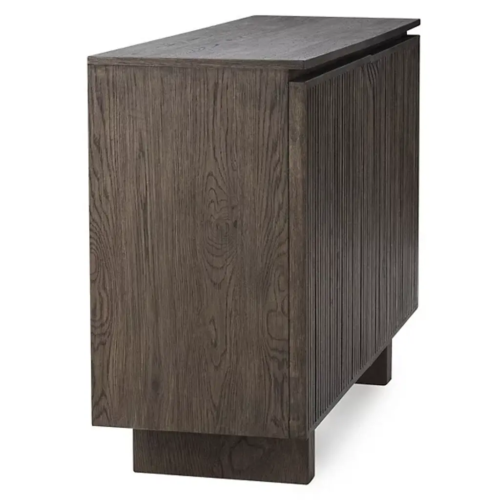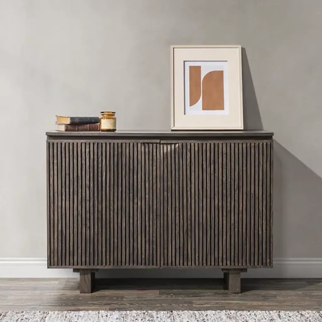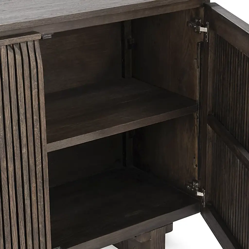 The Roya Sideboard Buffet from Classic Home mixes straightforward contemporary simplicity with sculptural charm. Made in Vietnam with a wood veneer finish, linear bases elevate the buffet slightly, with clean lines and paneled doors with linear accents that create a rustic modern look. Interior shelving keeps items organized, while a rear cord-management cutout adds convenience for media or electronics. Distinct variations in tone and texture show off the natural charm of the materials.