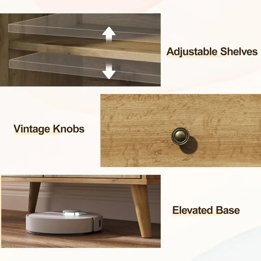 Bring character and organization to your space with the RoyalCraft Accent Cabinet, a thoughtfully designed furniture piece that blends beauty with function. Featuring a natural wood finish and a charming rattan weave pattern on its doors, this sideboard creates a warm, rustic ambiance in any room. Whether you’re styling a cozy corner or furnishing your entryway, the solid oak legs and breathable door design make it both stylish and practical. Inside, the 3 drawers and 3 adjustable shelves offer versatile storage for everything from tableware and books to seasonal decor. Smooth gliding rails make each drawer easy to use, while thickened boards add a layer of durability you can count on. The neutral color and boho-inspired design allow this piece to blend effortlessly with modern, farmhouse, or mid-century decor styles. Crafted from P2-grade MDF and particle board, this console cabinet is not only strong but certified safe for indoor use. You’ll love how it brings warmth and texture into your home while keeping clutter out of sight. Add a decorative vase, a framed photo, or a few stacked books on top to complete the look and elevate any room instantly. Whether used as a buffet in your dining room, a dresser in your bedroom, or an entryway console table, this side cabinet delivers multifunctional style. Easy to clean and simple to assemble, it is a practical investment in home furniture that supports both form and function in every setting.