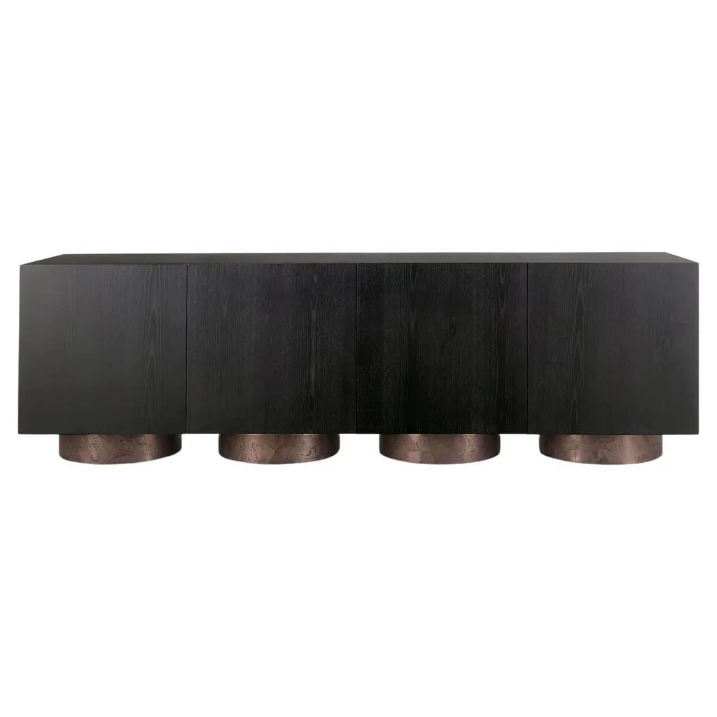 Inspired by the most famous of cubes, these volumes can be stacked endlessly. Its rigid and essential appearance is inversely proportional to its compositional flexibility. Doors with push-pull system opening. Internal compartment with bronze glass shelf. The element is modular as a sideboard or bookcase. Ash wooden veneer in black open pore matt finish, mdf base with Pure metal finish in Burnished Copper-Bronze mix. More finishes are available, please contact the concierge for more information.