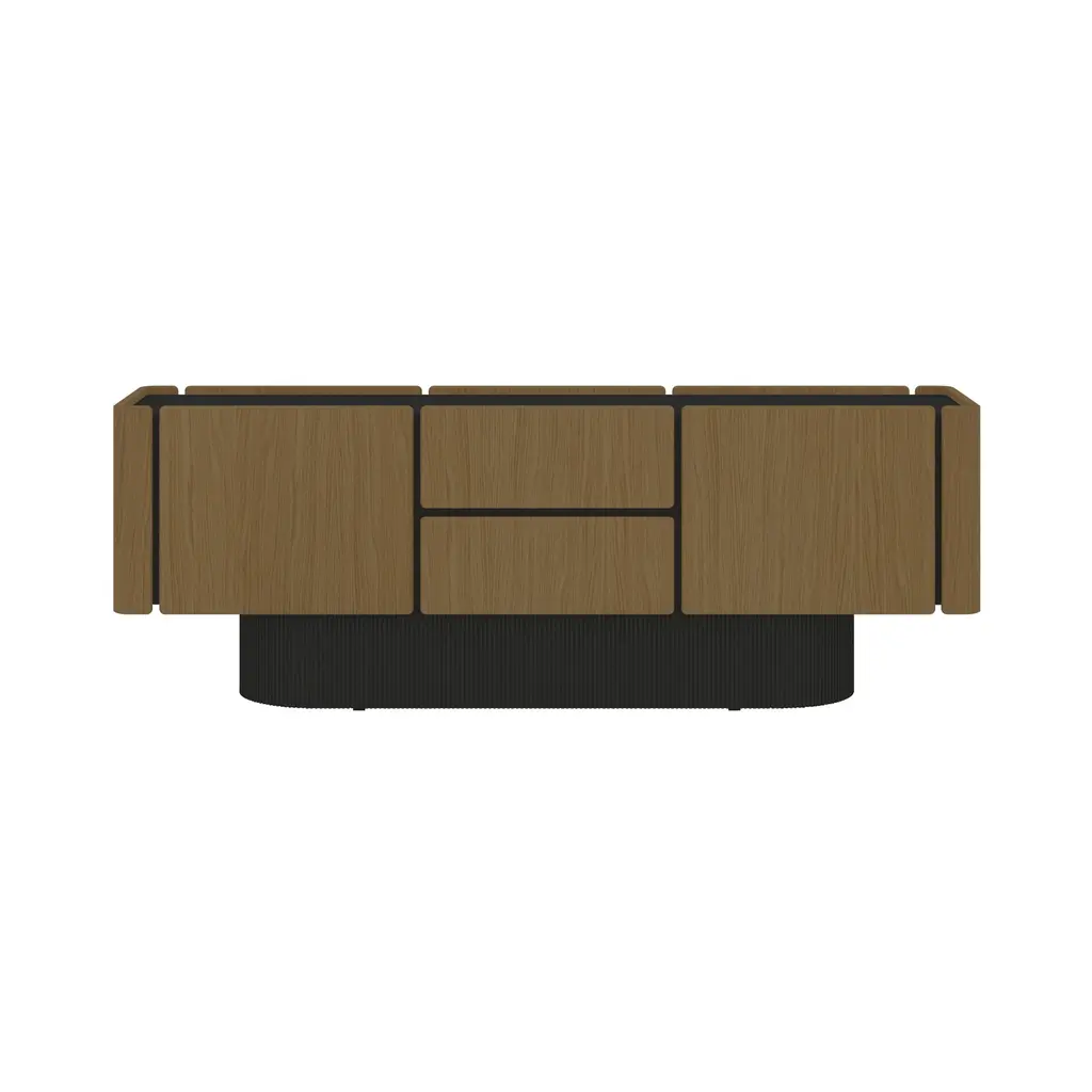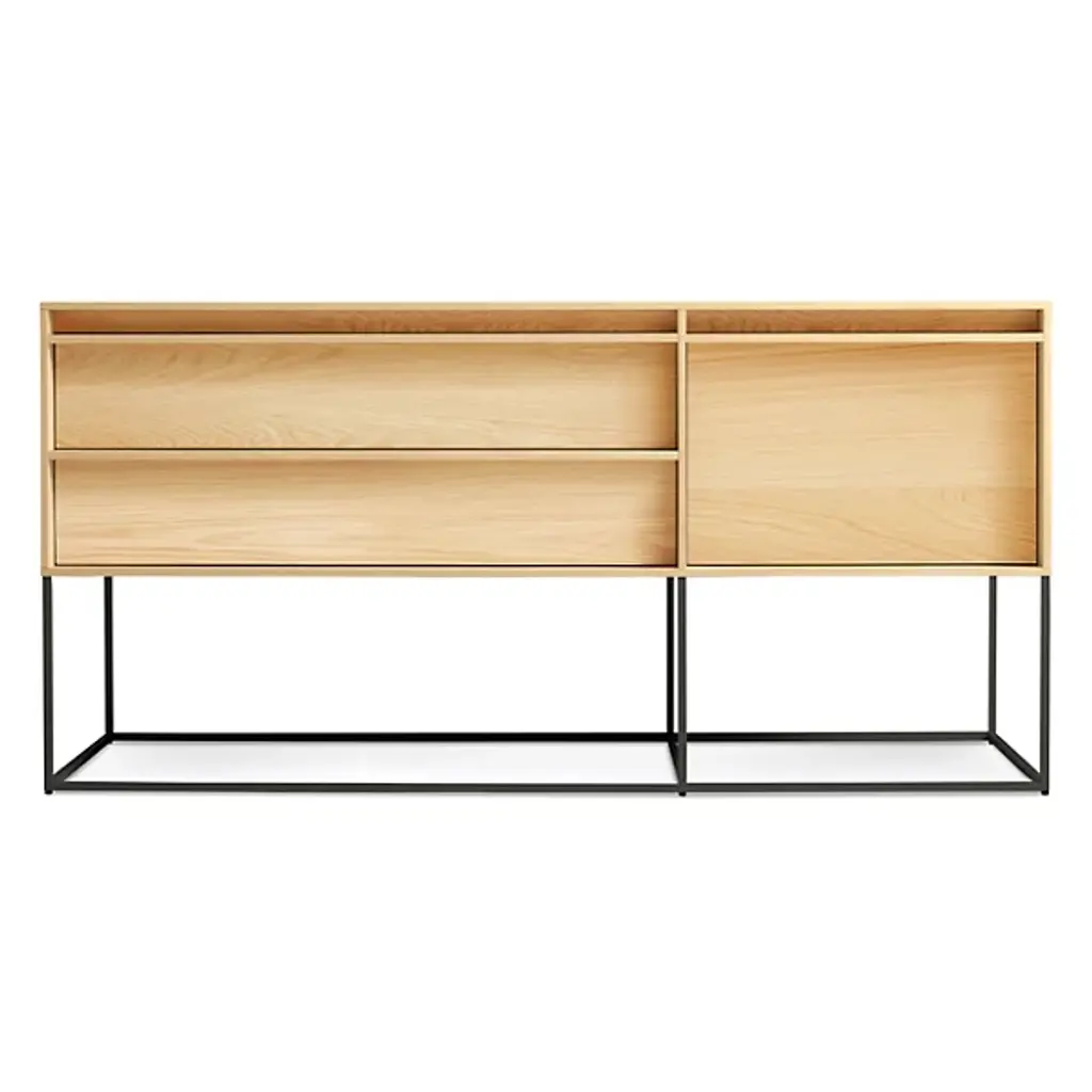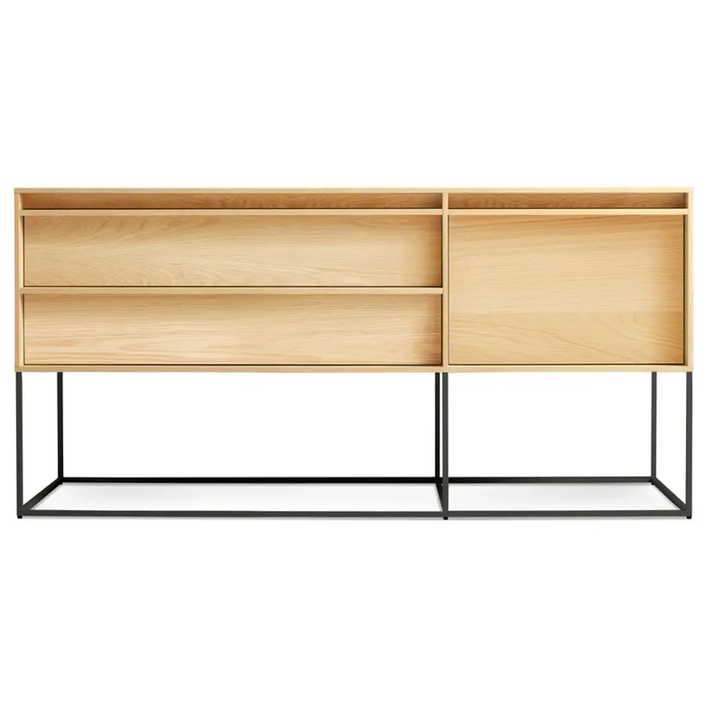 The Rule 1 Door/2 Drawer Console by Blu Dot highlights modern geometric angles with its sleek, eye-catching design. Its deep-set drawer fronts are finished with a contemporary wood pull which contrasts boldly against its dusk-colored drawer and door interiors. Rules flip down door opens to a sliding shelf, making it easy to access any plates, fancy napkins or silverware that you decide to store. Completed with soft close drawers and doors as well as a powder-coated steel base, Rule is ideal to place in any dining room or kitchen.