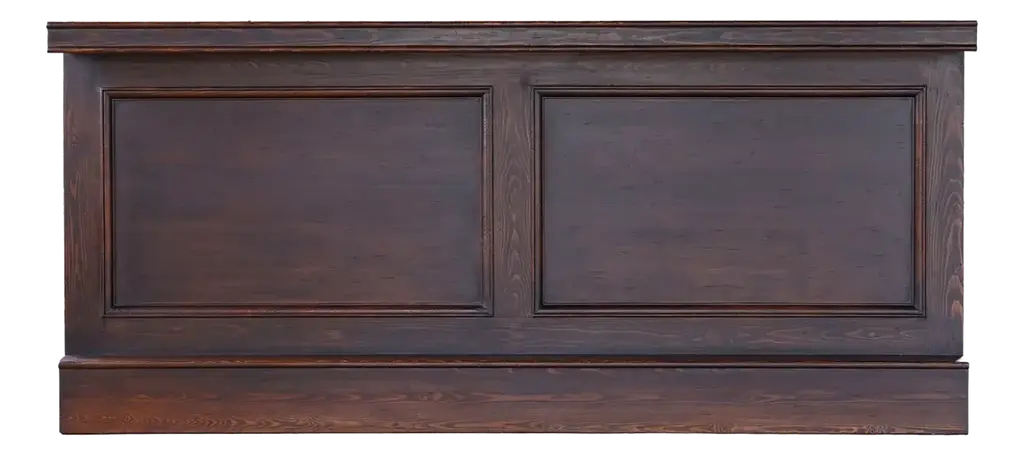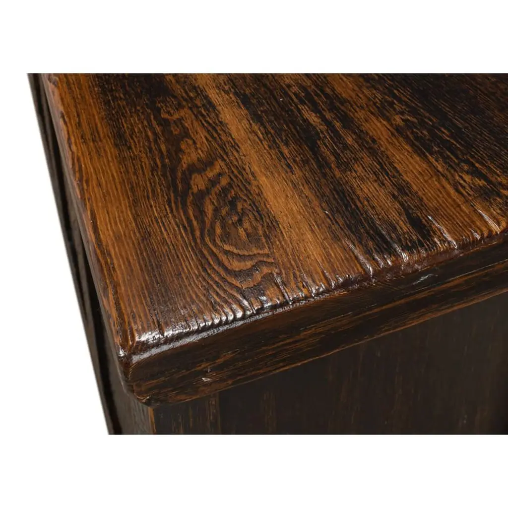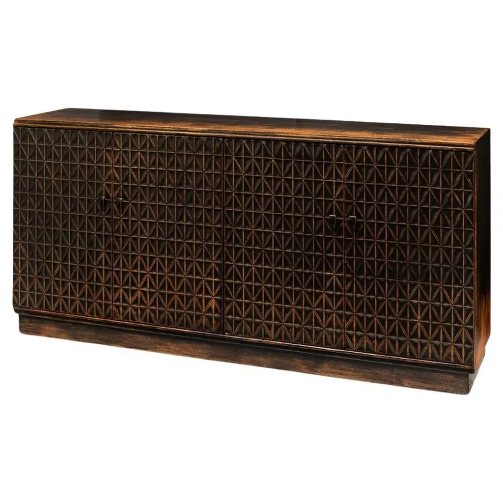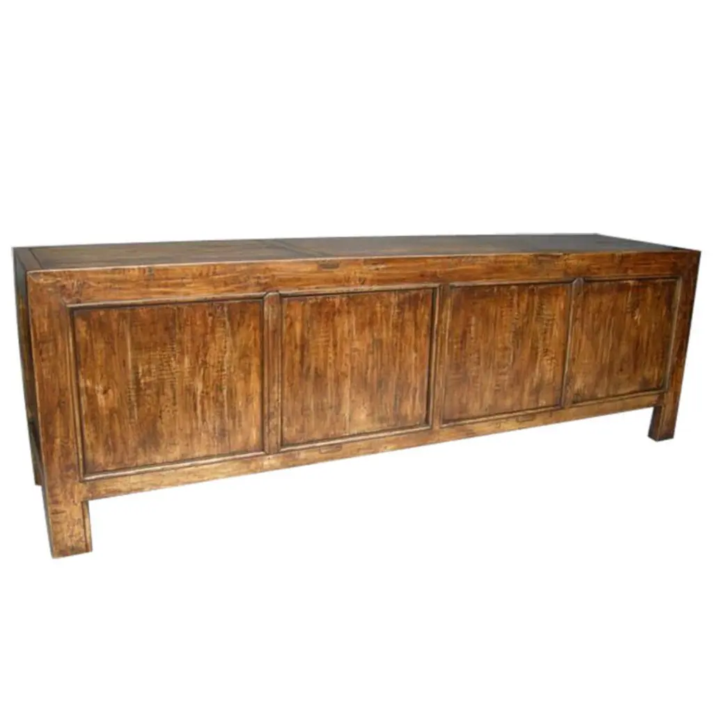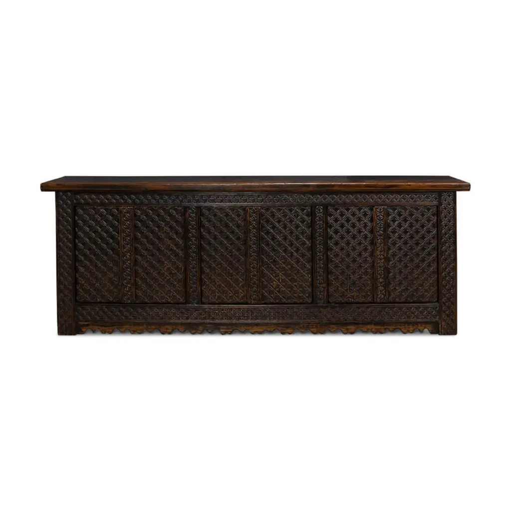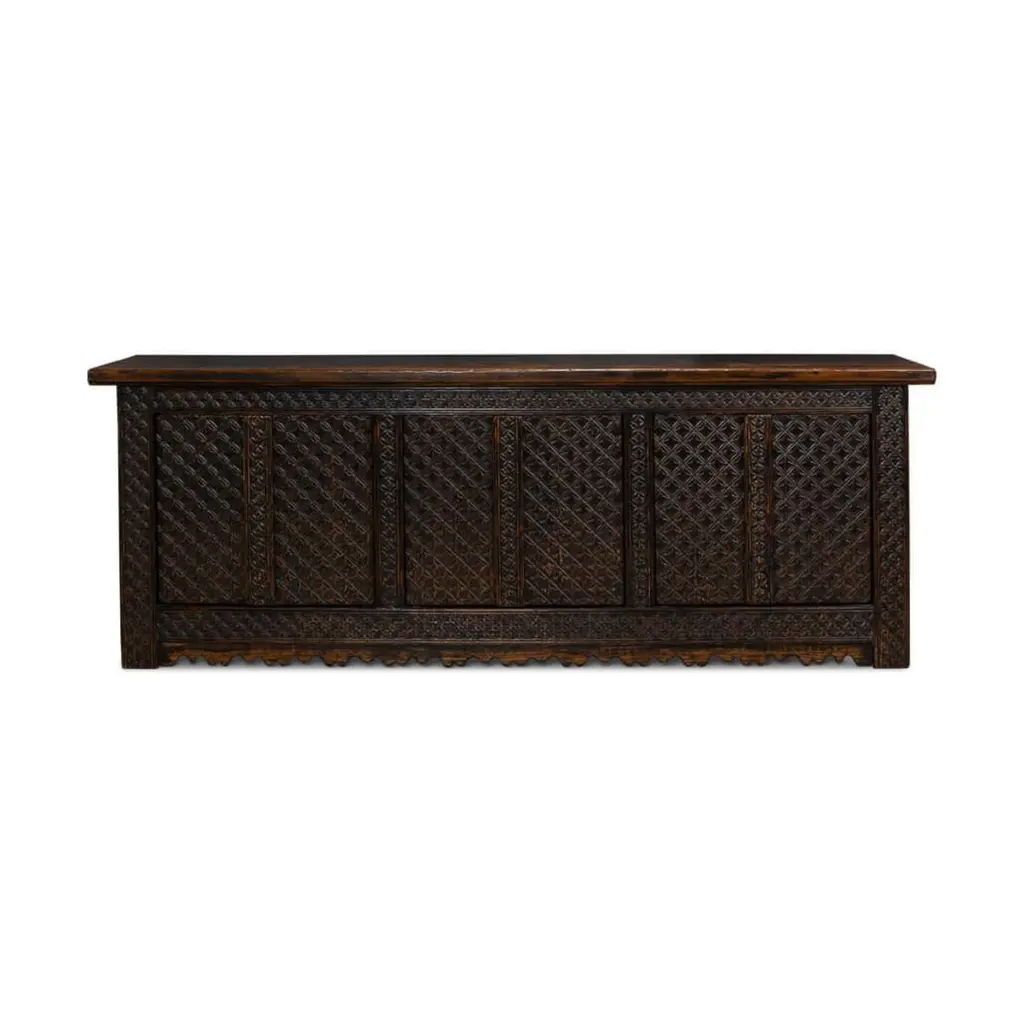 Crafted from carved reclaimed pine, featuring a distressed, hand-rubbed, and antiqued brown finish. Six cabinet doors open to reveal a painted interior with removable shelves, combining practicality with rustic elegance.Dimensions: 98" W x 19" D x 35" H
