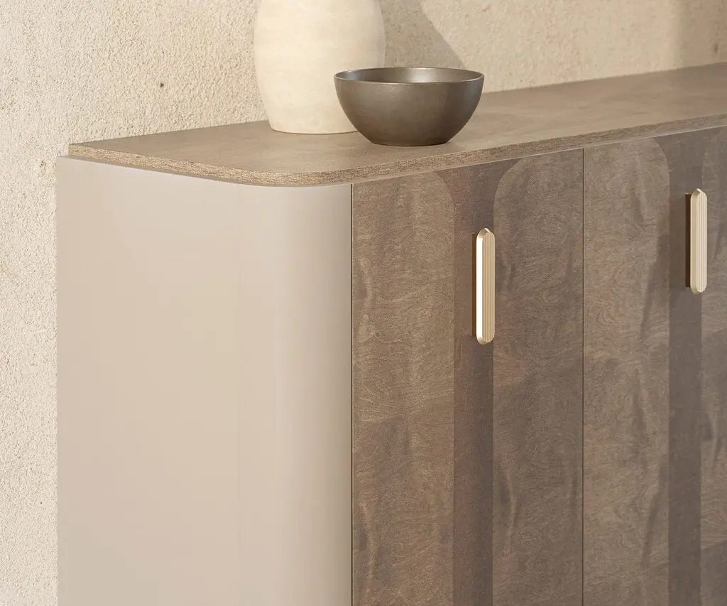 Elegant inlays, elongated handles and softly rounded edges give the Sancia Sideboard a distinct, contemporary style, beautifully anchored by a warm brown finish. Four doors offer plenty of room for your essentials, while the sophisticated aesthetic complements a variety of decor styles. Pair it with other pieces in the Sancia Collection for a coordinated look.