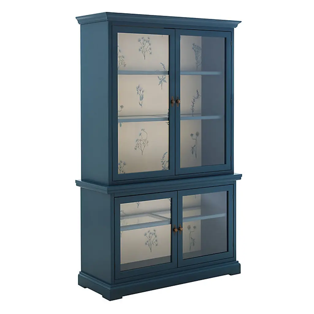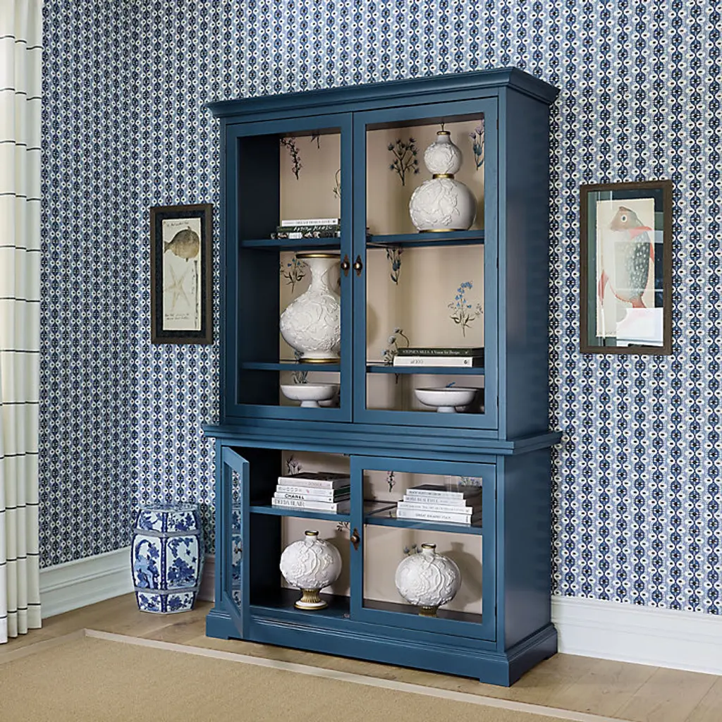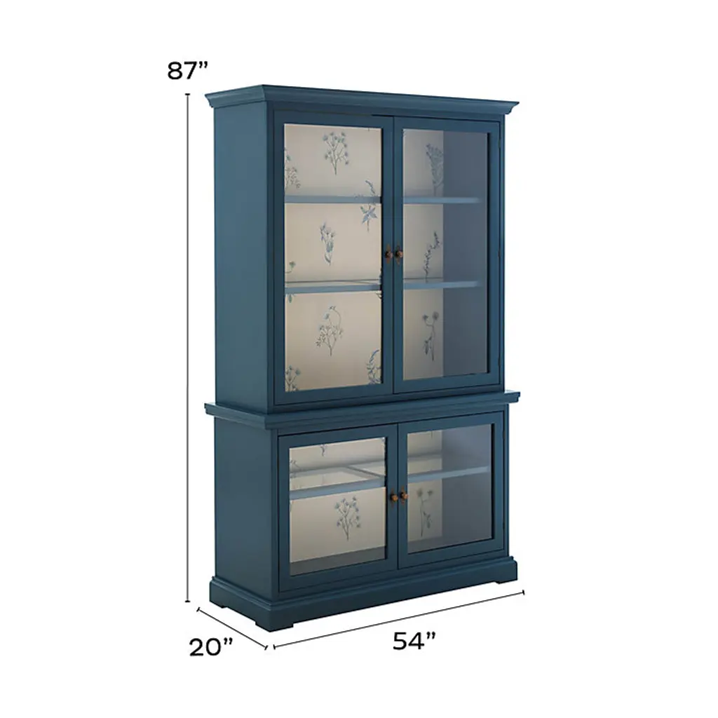 Our Sanders Sideboard with Hutch is a beautiful work of cabinet-making art. Perfectly proportioned for the living room, dining room or open kitchen, this versatile cabinet and storage hutch blends clean, crisp lines with soft floral details. The cases are masterfully crafted of hardwood with crown molding and bracket-foot base. Double glass doors on top and bottom open with antique brass knob pulls mounted on pretty scalloped backplates. Inside, the back walls are printed in colorful botanicals created from an original watercolor by our gifted artist. Three adjustable shelves, two in the Hutch and one in the Cabinet, feature glass centers, allowing light from four built-in touch lights to flood both interior spaces, illuminating every lovely detail. In the Hutch, plate grooves along each shelf's back rail allow you to showcase your favorite china. Sanders Sideboard with Hutch features: