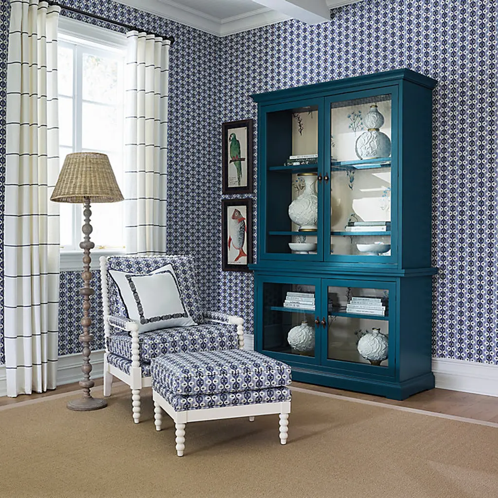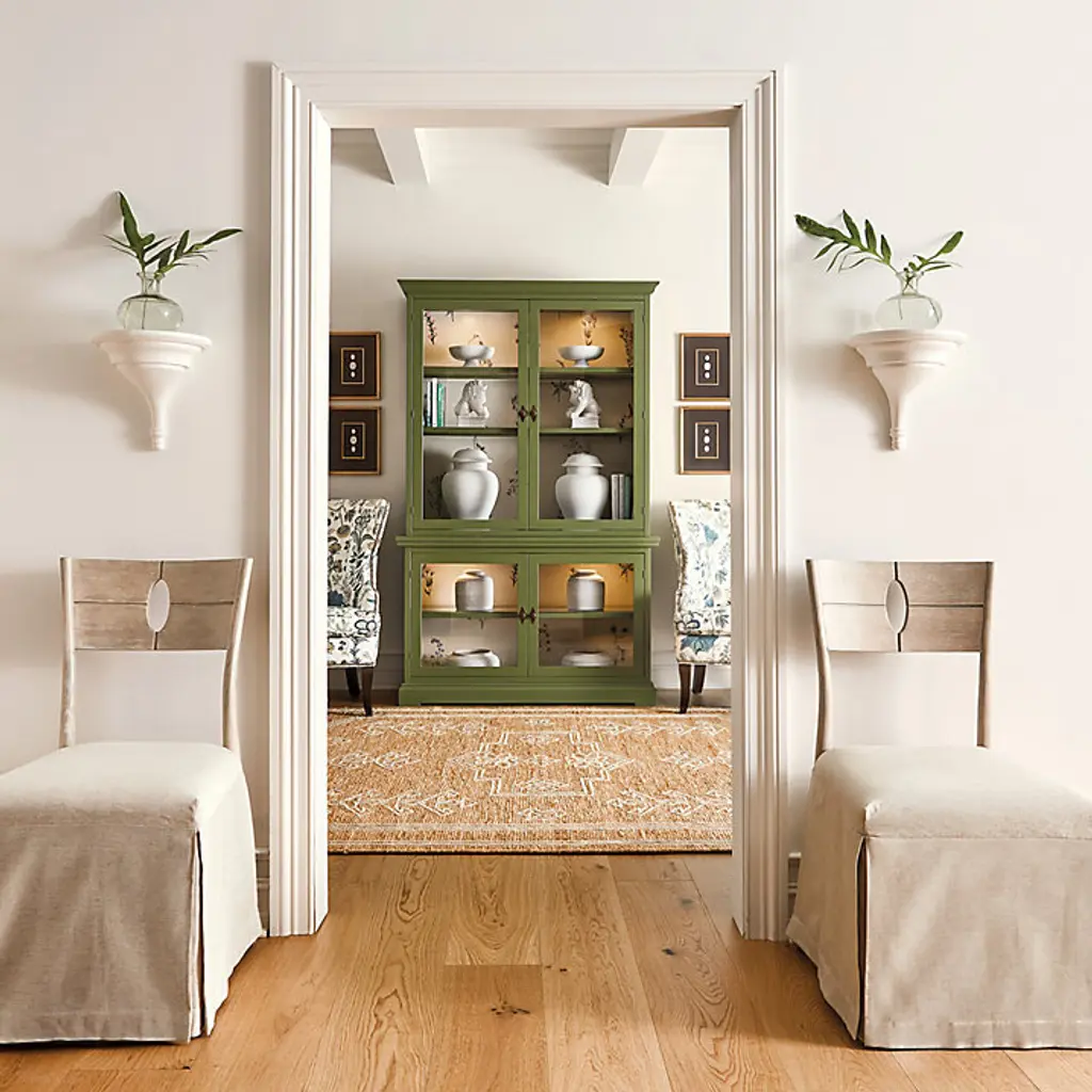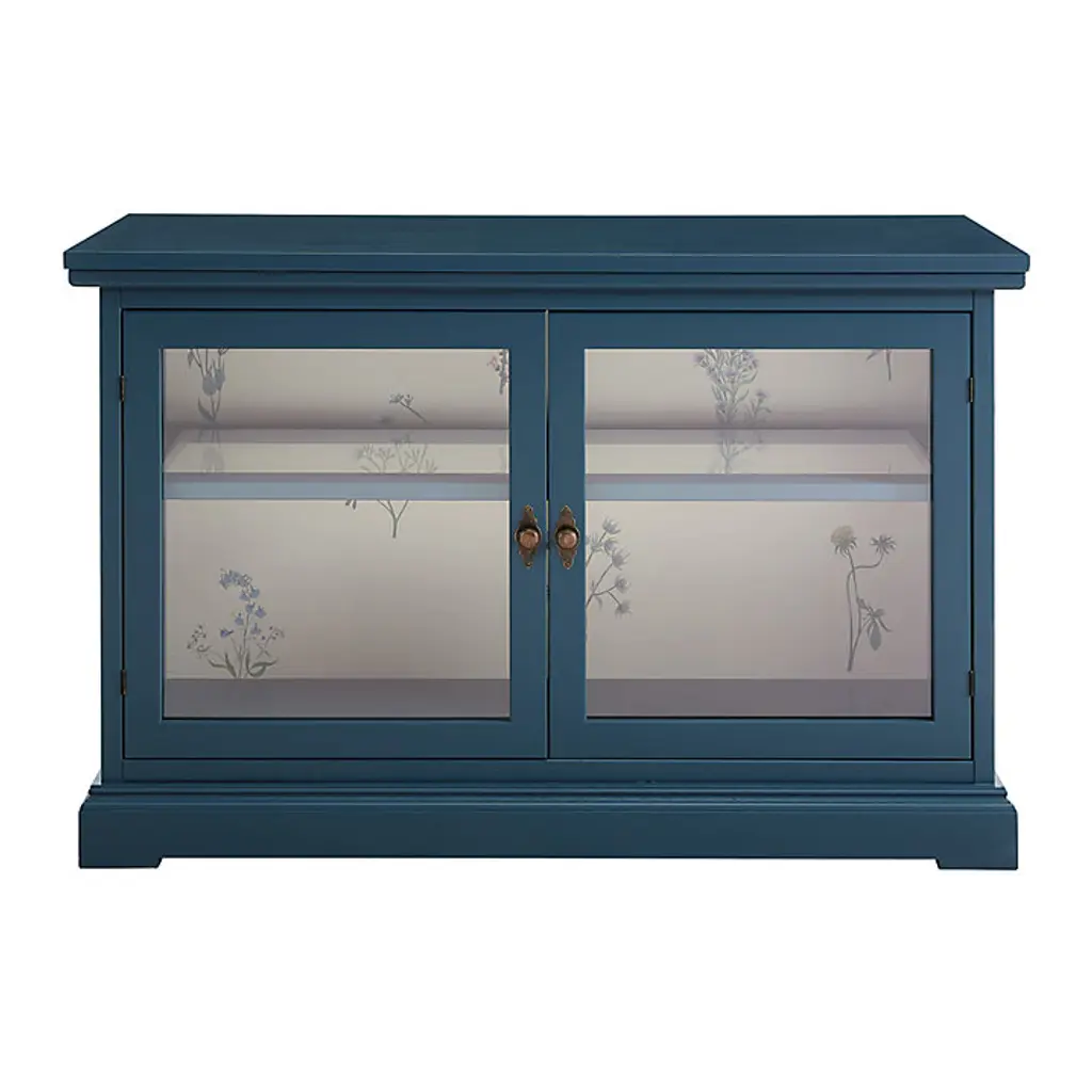 Our Sanders Sideboard with Hutch is a beautiful work of cabinet-making art. Perfectly proportioned for the living room, dining room or open kitchen, this versatile cabinet and storage hutch blends clean, crisp lines with soft floral details. The cases are masterfully crafted of hardwood with crown molding and bracket-foot base. Double glass doors on top and bottom open with antique brass knob pulls mounted on pretty scalloped backplates. Inside, the back walls are printed in colorful botanicals created from an original watercolor by our gifted artist. Three adjustable shelves, two in the Hutch and one in the Cabinet, feature glass centers, allowing light from four built-in touch lights to flood both interior spaces, illuminating every lovely detail. In the Hutch, plate grooves along each shelf's back rail allow you to showcase your favorite china. Sanders Sideboard with Hutch features: