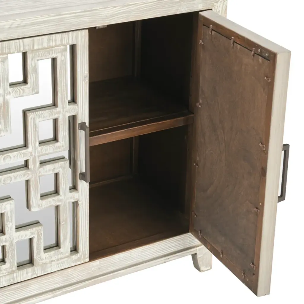 This striking buffet has it all: grace, style, and function. A study in symmetry and refinement, it features four drawers, including the top one with a silverware insert, and adjustable shelves for convenient and ample storage. But its striking details are what make this sideboard so unique: arabesque caste grilles set over delicately antiqued glass door front and charming nickel pulls put it in a class of its own.