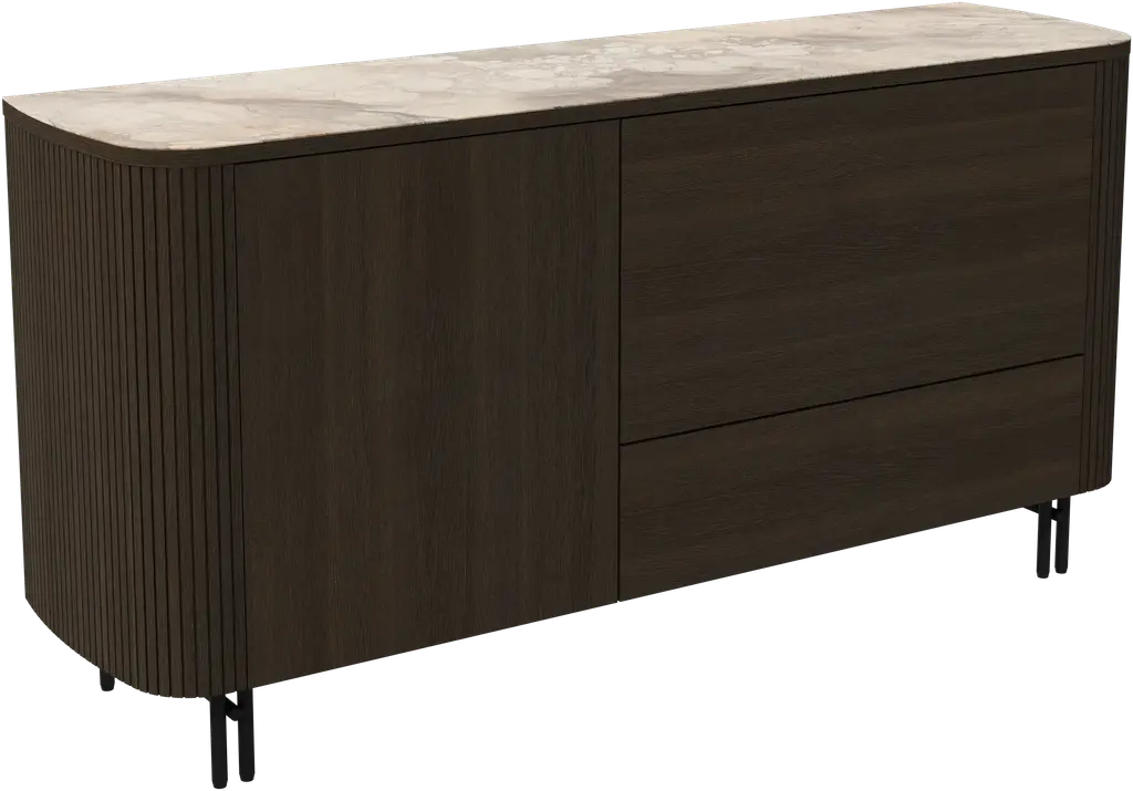 Inspired by mid-century elegance, the Morten Georgsen-designed Santiago sideboard features a versatile drop-down front revealing a wooden shelf, perfect for discreet storage or creating a mini bar area. Its timeless design is enhanced by intricate bevelled details and customisable options, including a selection of ceramic or wood tops and a choice between wooden or matt black metal legs. Available in multiple sizes to suit your interior needs.
