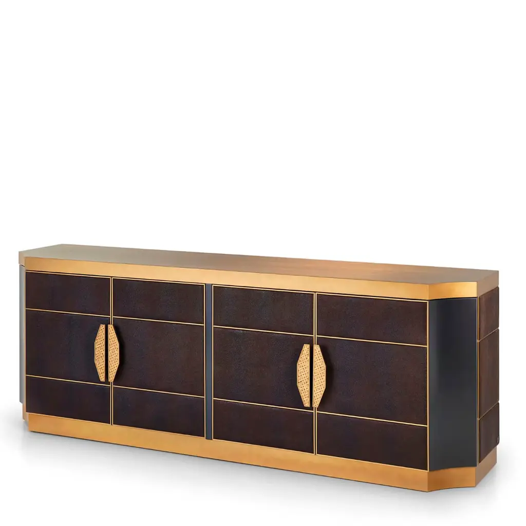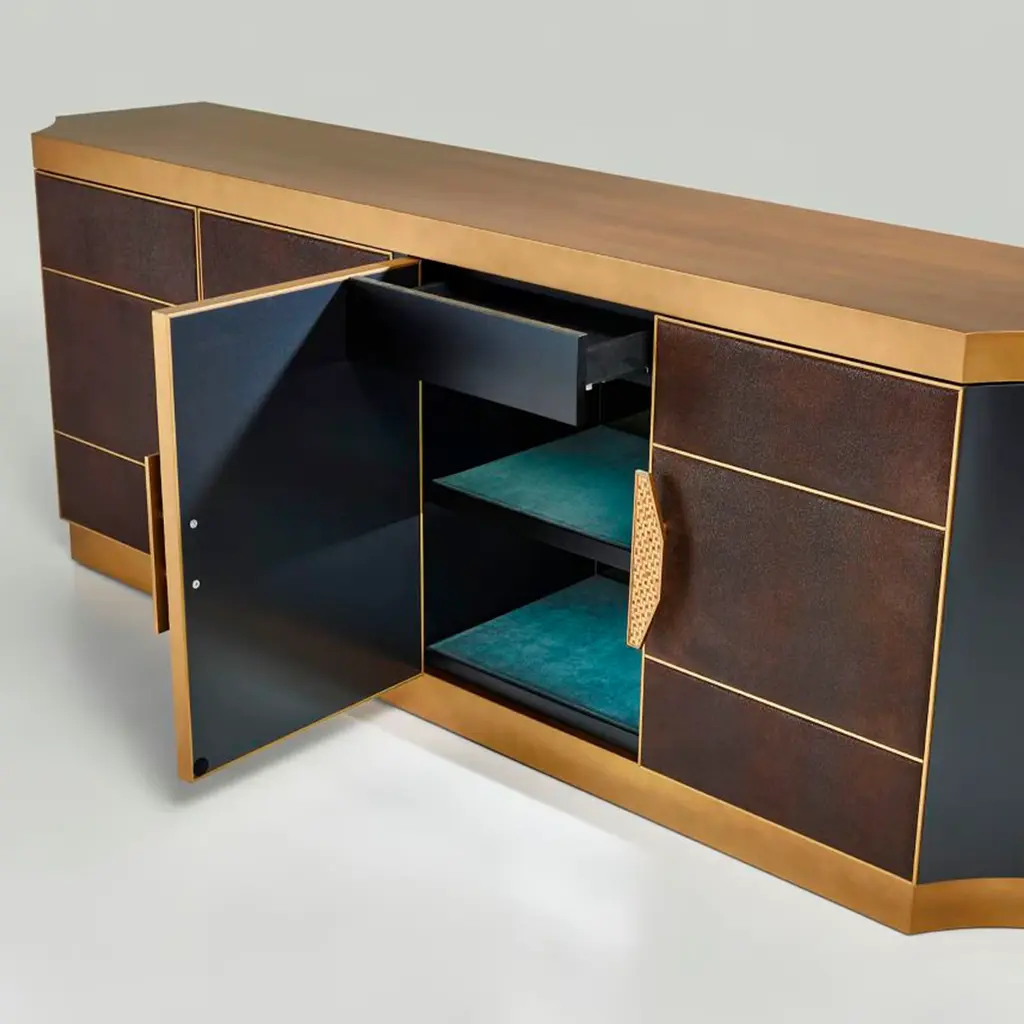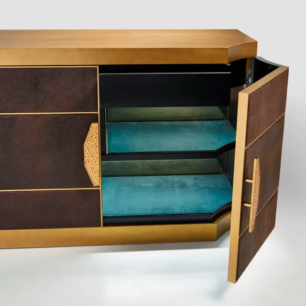 A unique, exclusive piece of furniture. The shape is decisive and the refined choice of the materials with which it is made completes the Haute style. The minute mosaic of the handles makes it irresistible.