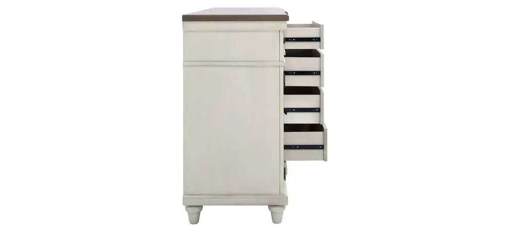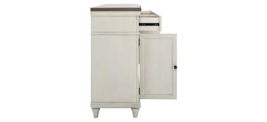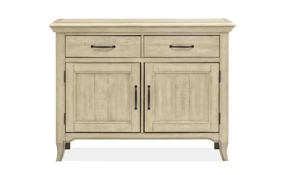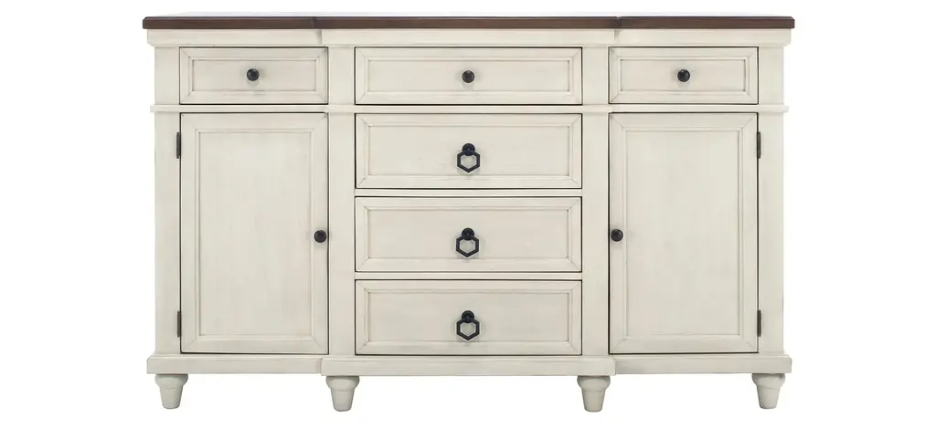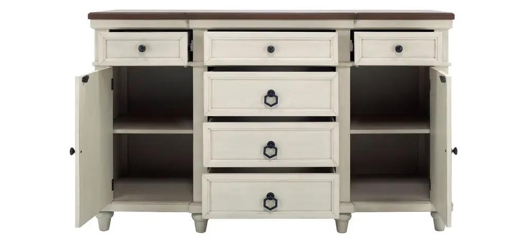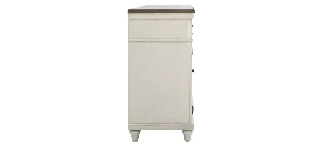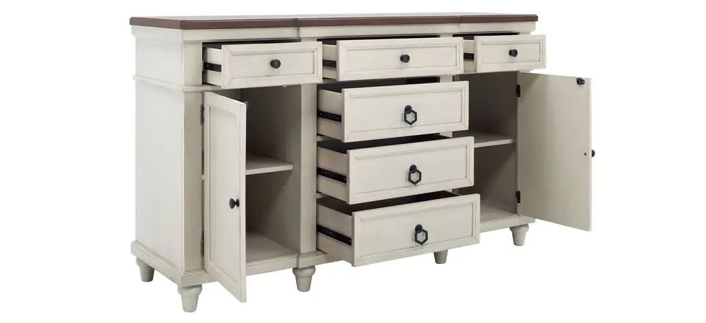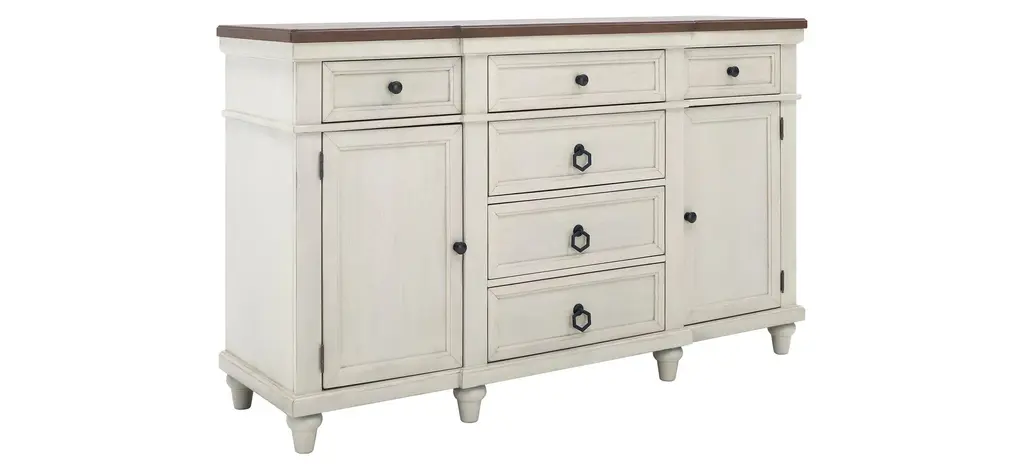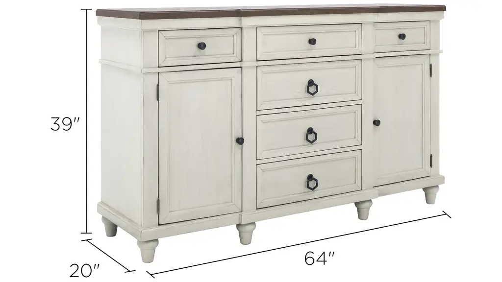The Saybrook sideboard creates the ideal atmosphere for everything from weeknight dinners to holiday feasts. This casual buffet's attractive two-tone finish combines off-white body with a warm brown top. Turned legs show off just a touch of traditional style. And two different drawer pulls add a nice mix-and-match aesthetic.