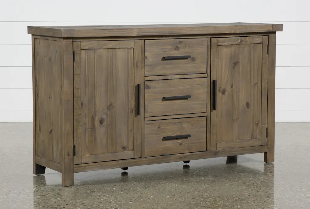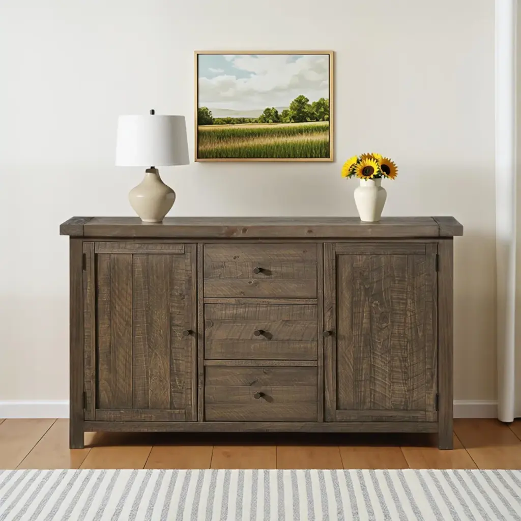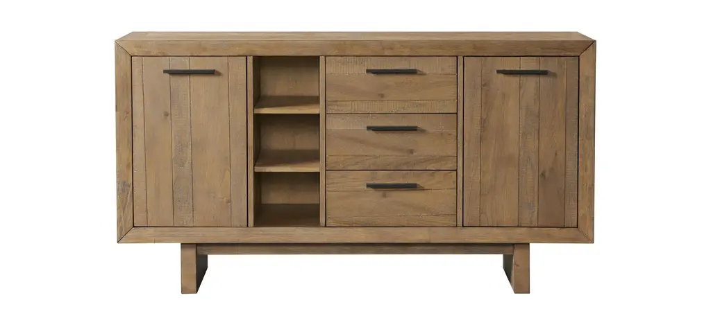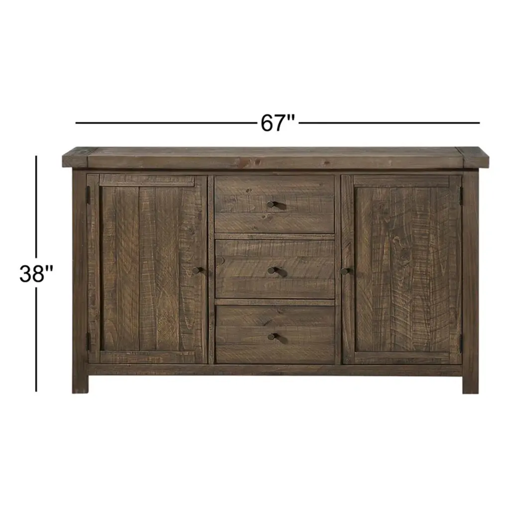 With all-solid wood construction, clean lines, and functional appeal, the Schuler collection replicates the look of a historical farmhouse with the warm appearance of reclaimed wood. Thick, naturally rough-hewn planks of butcher block pine form the tabletop with flint-cast iron tension rods and cross-bracing, providing a durable industrial-style foundation.