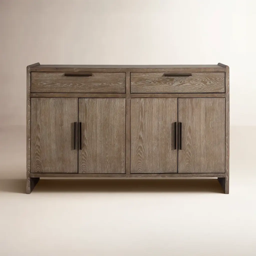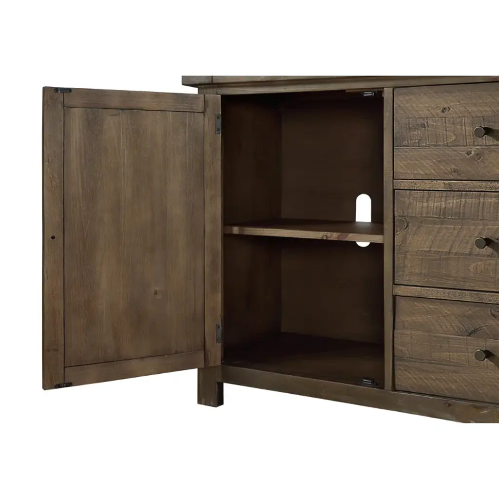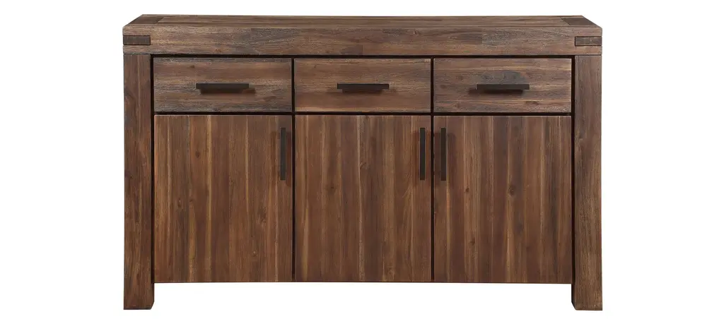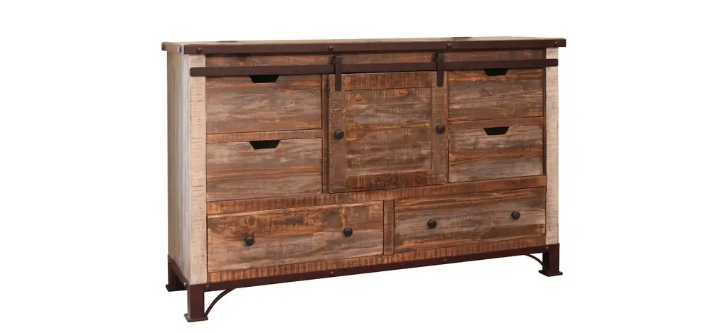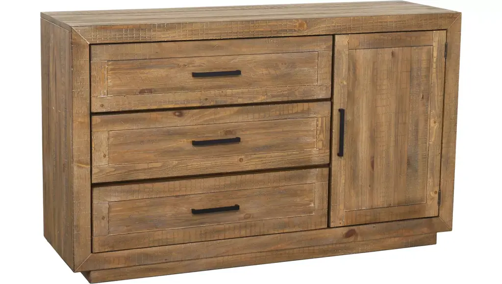 With all-solid wood construction, clean lines, and functional appeal, the Schuler collection replicates the look of a historical farmhouse with the warm appearance of reclaimed wood. Thick, naturally rough-hewn planks of butcher block pine form the tabletop with flint-cast iron tension rods and cross-bracing, providing a durable industrial-style foundation.