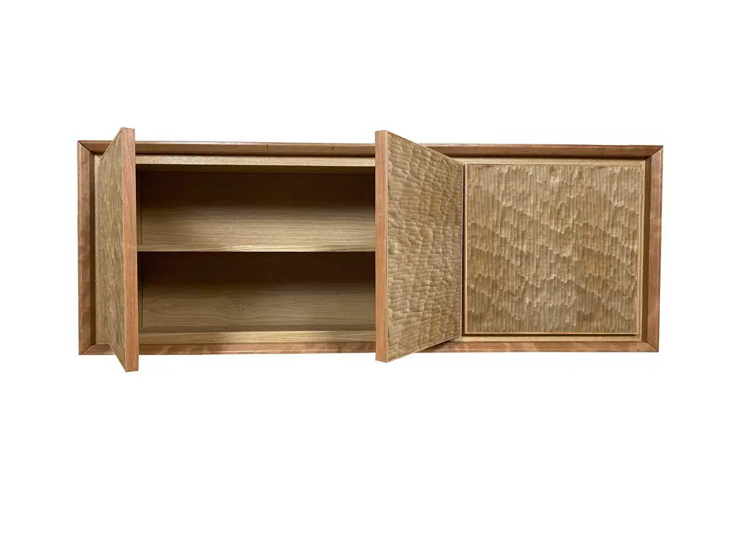 Suspended belief "sculpted belief" by Mascia Meccani for Meccani Design, 2022. Handmade in oak, cherry and with the spells carved in maple. Two internal shelves. Each piece is unique. Labeled by Maker