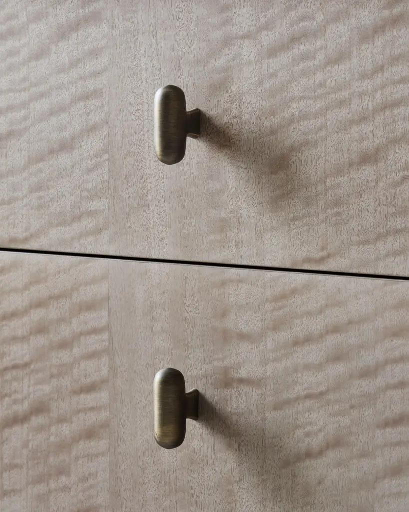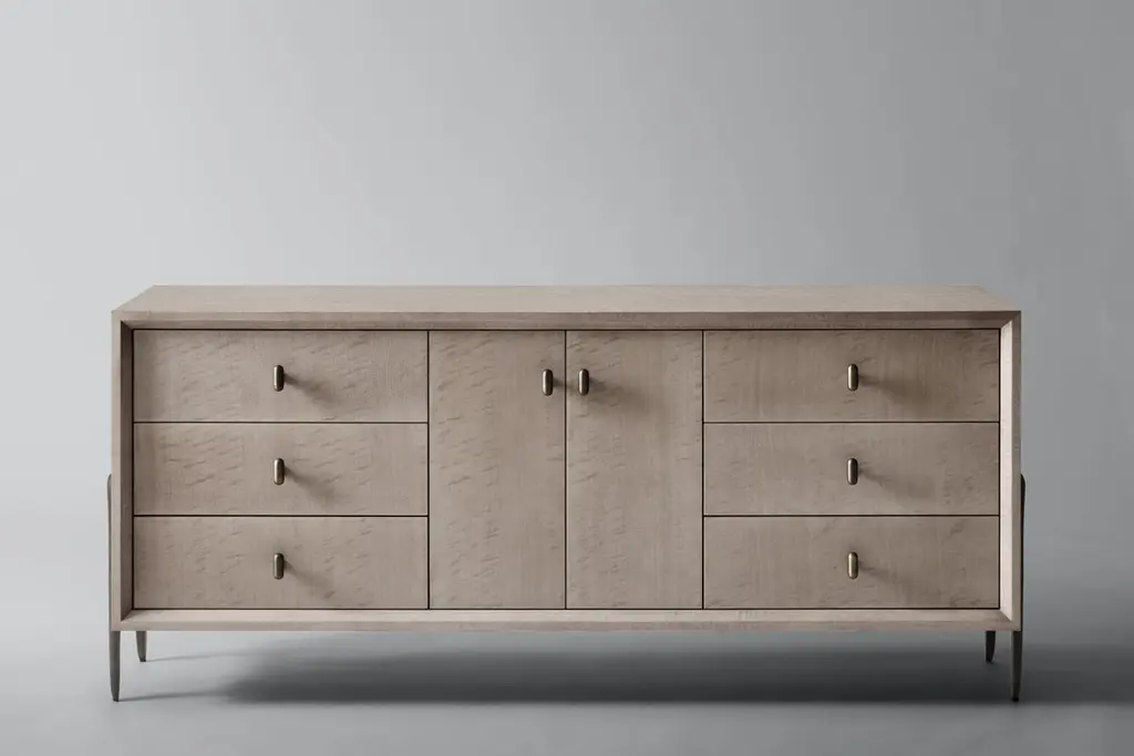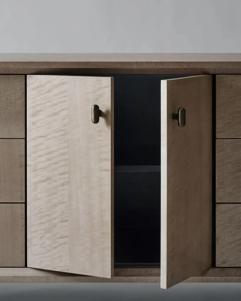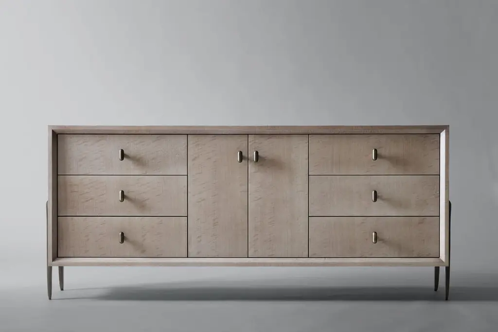 Informed by the refined craftsmanship of mid-century Italian design, the Serge Credenza features sculptural two-legged brackets, with a gently tapered silhouette and articulated edge. Nuanced millwork - beveled along the interior frame, with six drawers and two doors – are embellished by elongated pulls in matching metal.