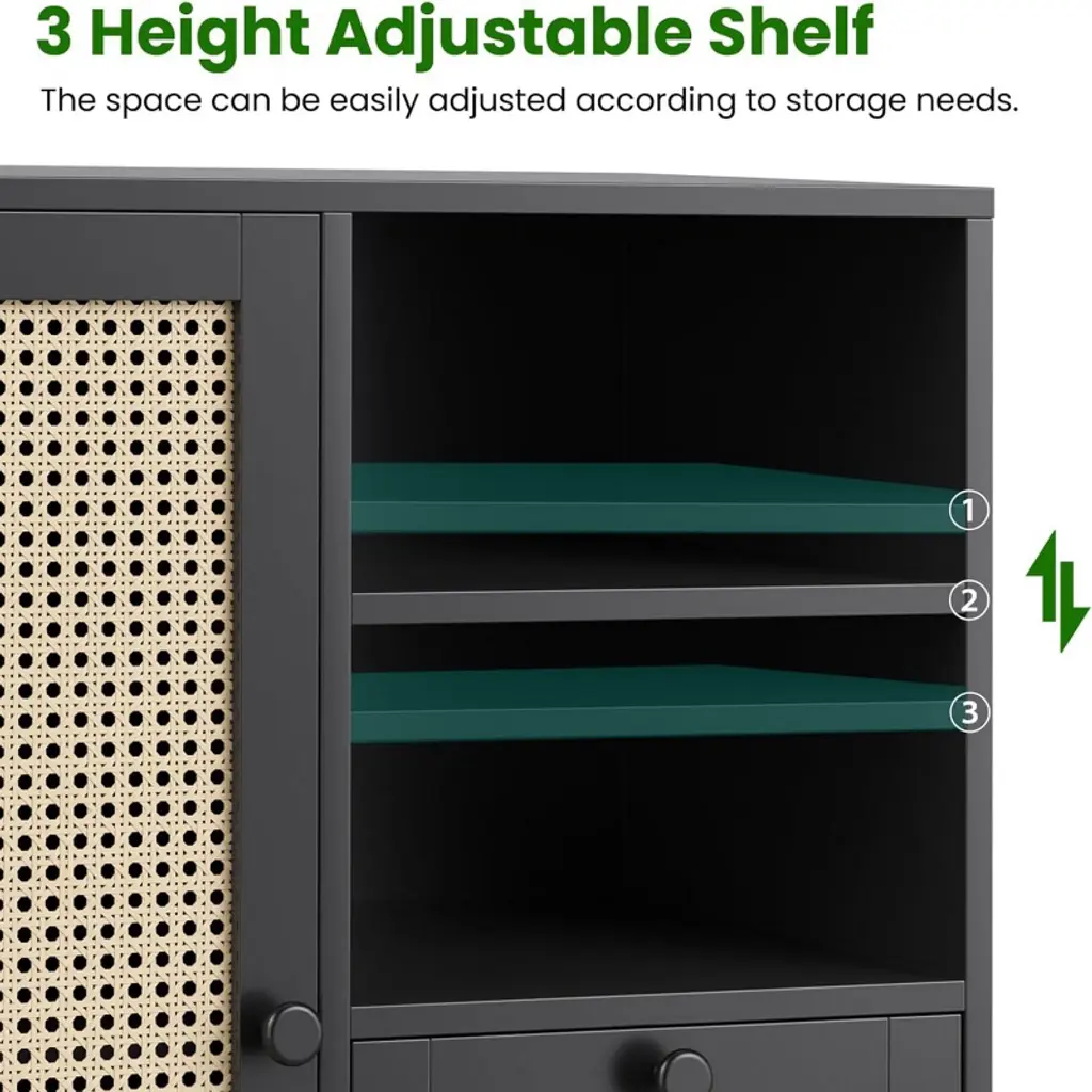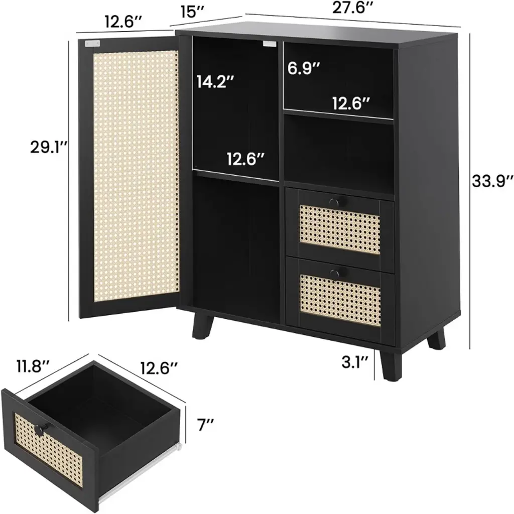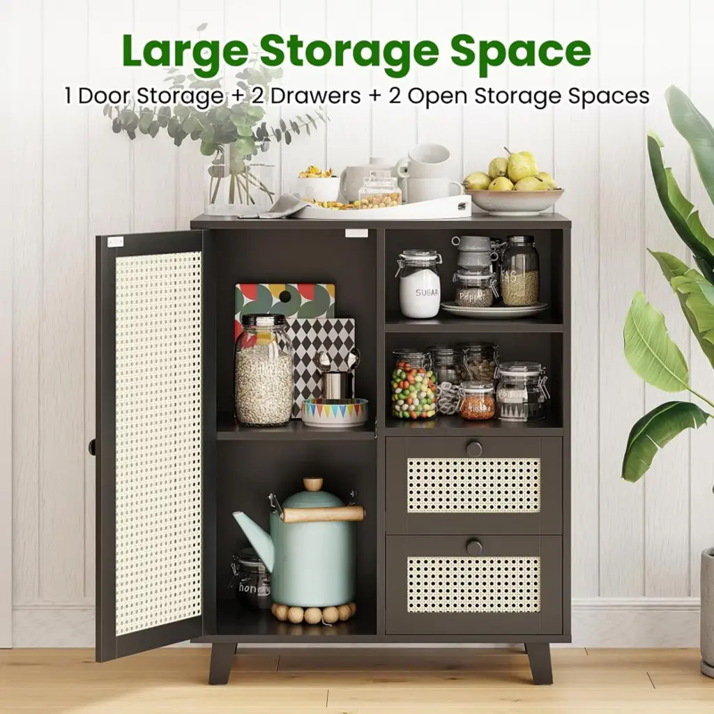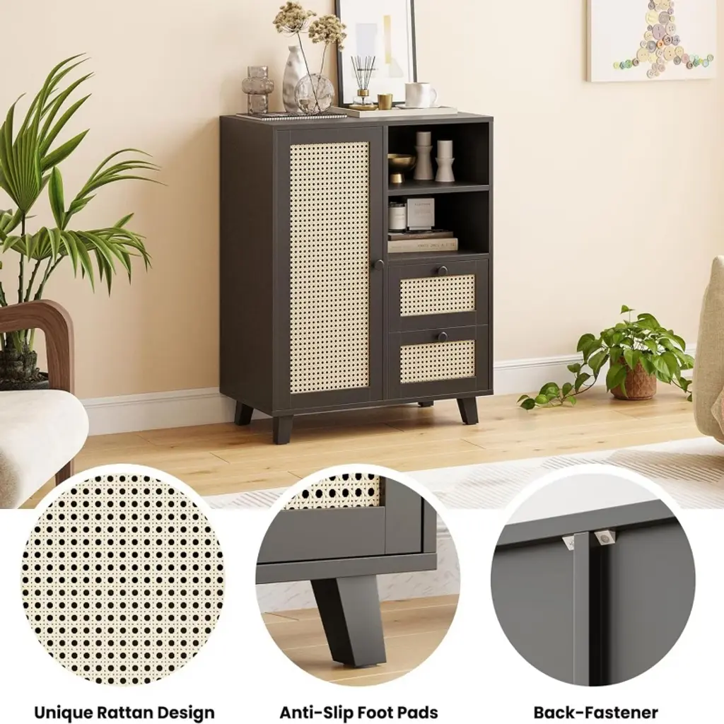 SEVOBAL accent cabinet features a rattan-front door for natural, airy aesthetics, concealing items to keep spaces tidy. It has two smooth-gliding drawers for small essentials and a sturdy build with floor-protecting foot pads for durability. Versatile for kitchens, living rooms, or entryways, it adds sophistication while organizing belongings. Assembly is easy with labeled parts and clear instructions—ideal for functional, stylish home storage.
