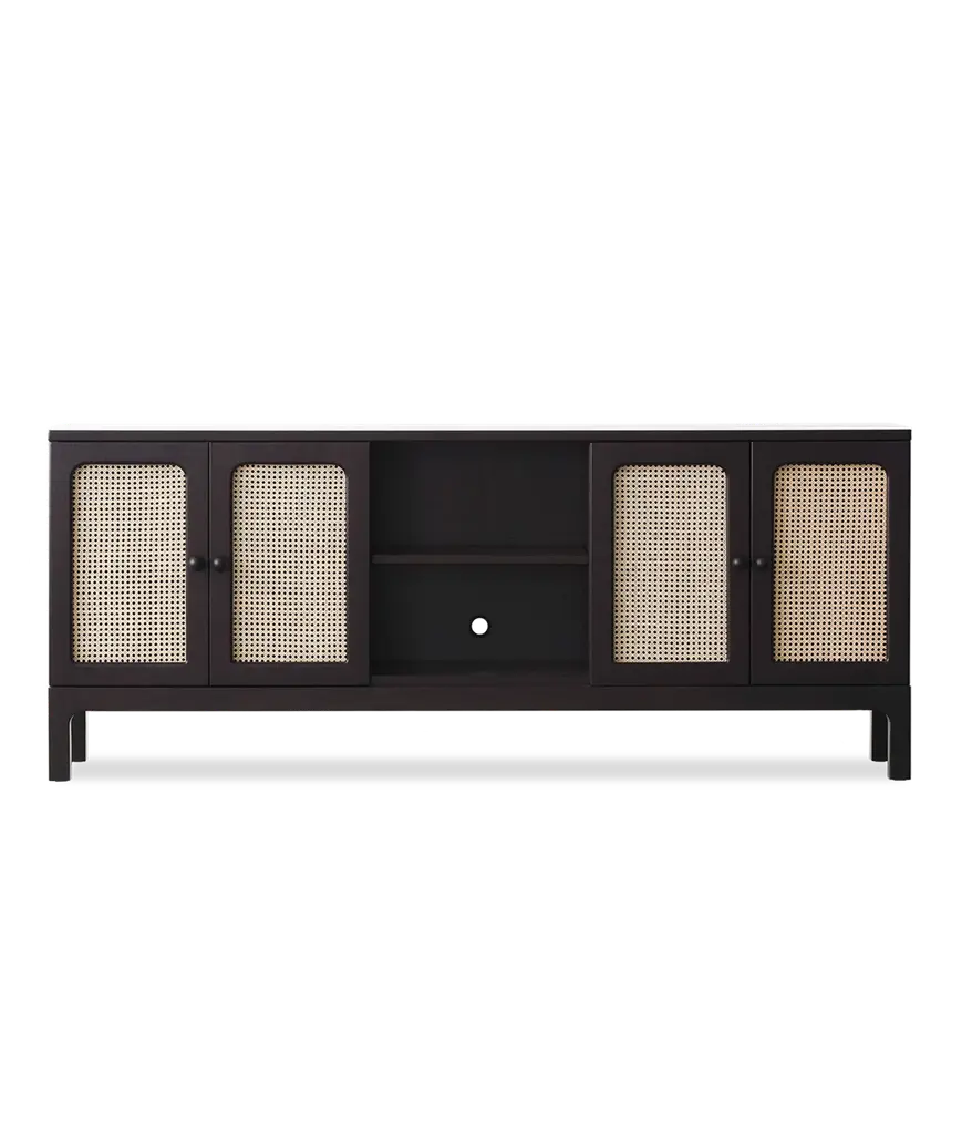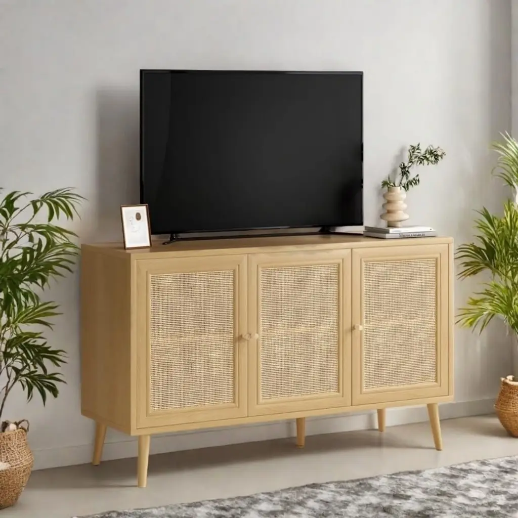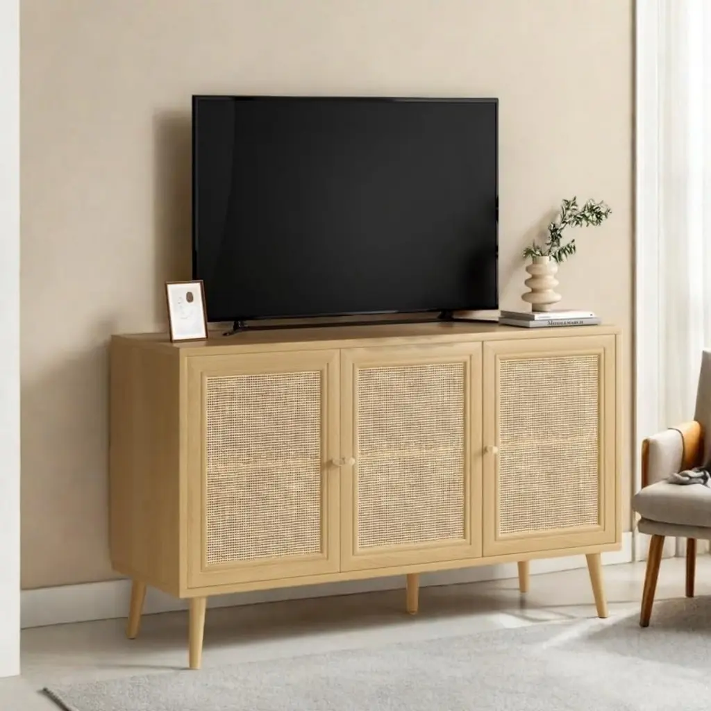 SEVOBAL three door sideboard pairs natural rattan doors with a clean silhouette to deliver generous storage and relaxed style in one compact footprint. Behind each woven panel sits roomy shelving ready for dishes, linens, or bar essentials, while the wide top welcomes lamps or serving trays. Anti tip hardware and sturdy legs ensure steady daily use in dining, living, or entryway spaces, and wipe clean surfaces keep upkeep simple.