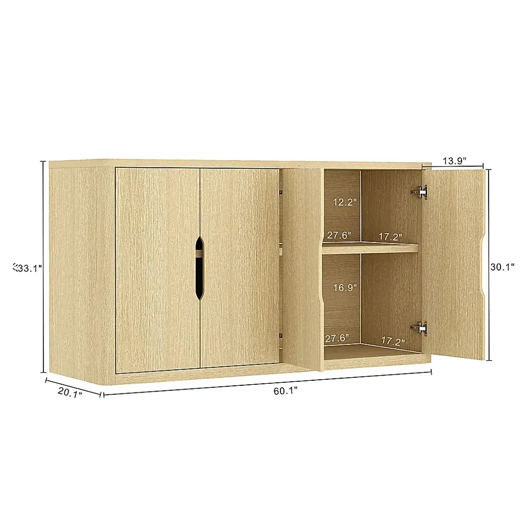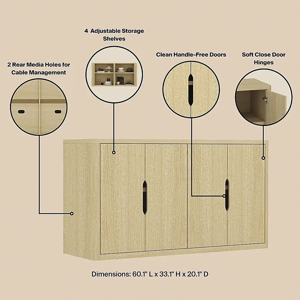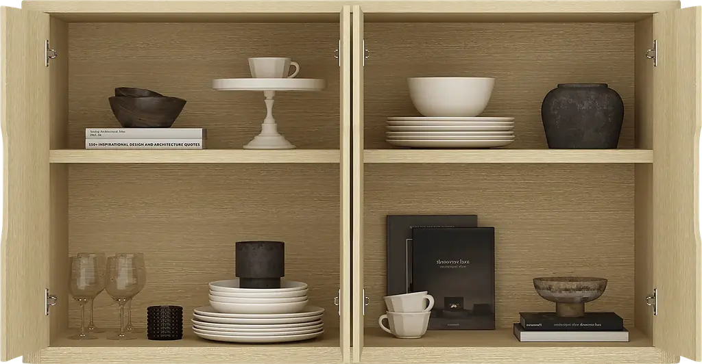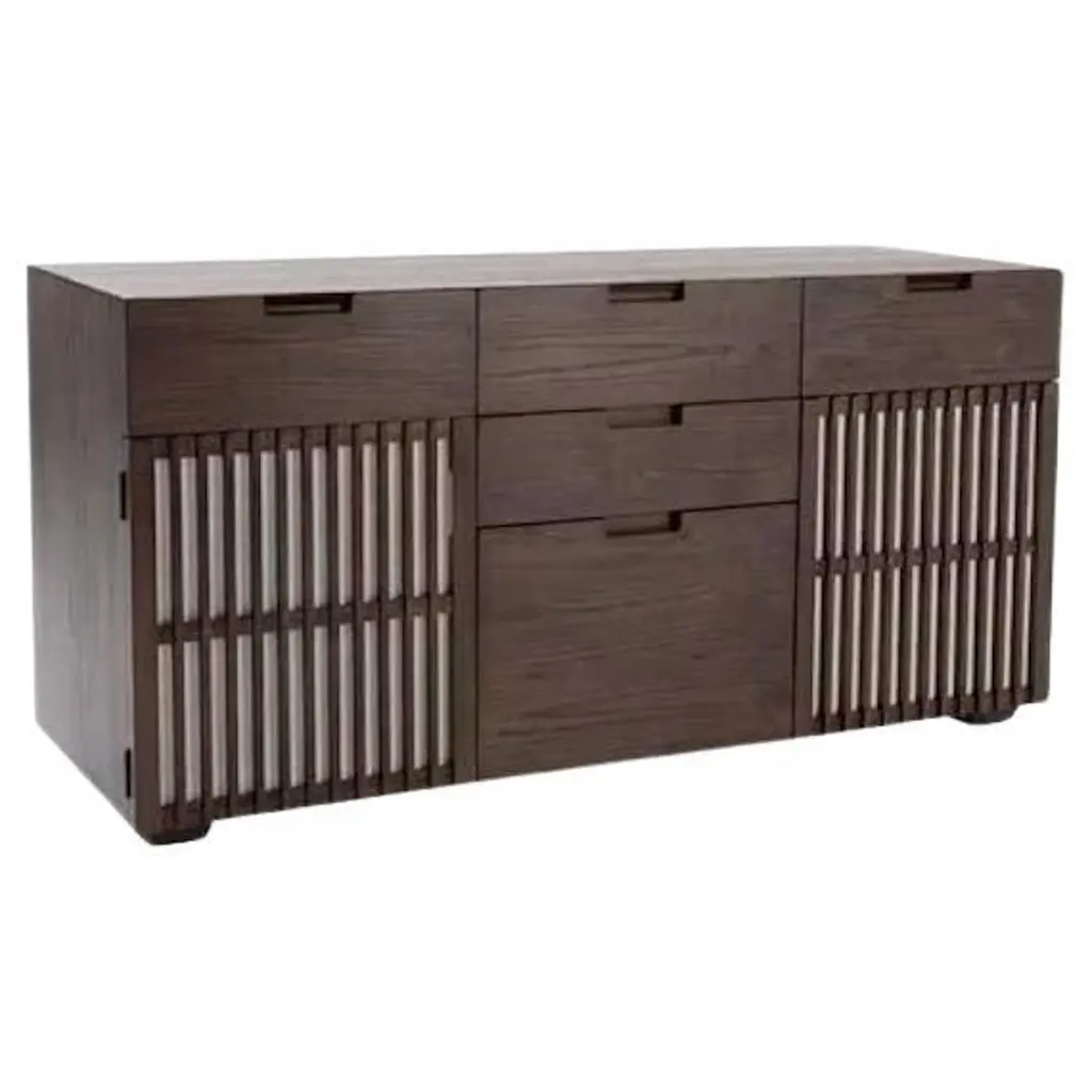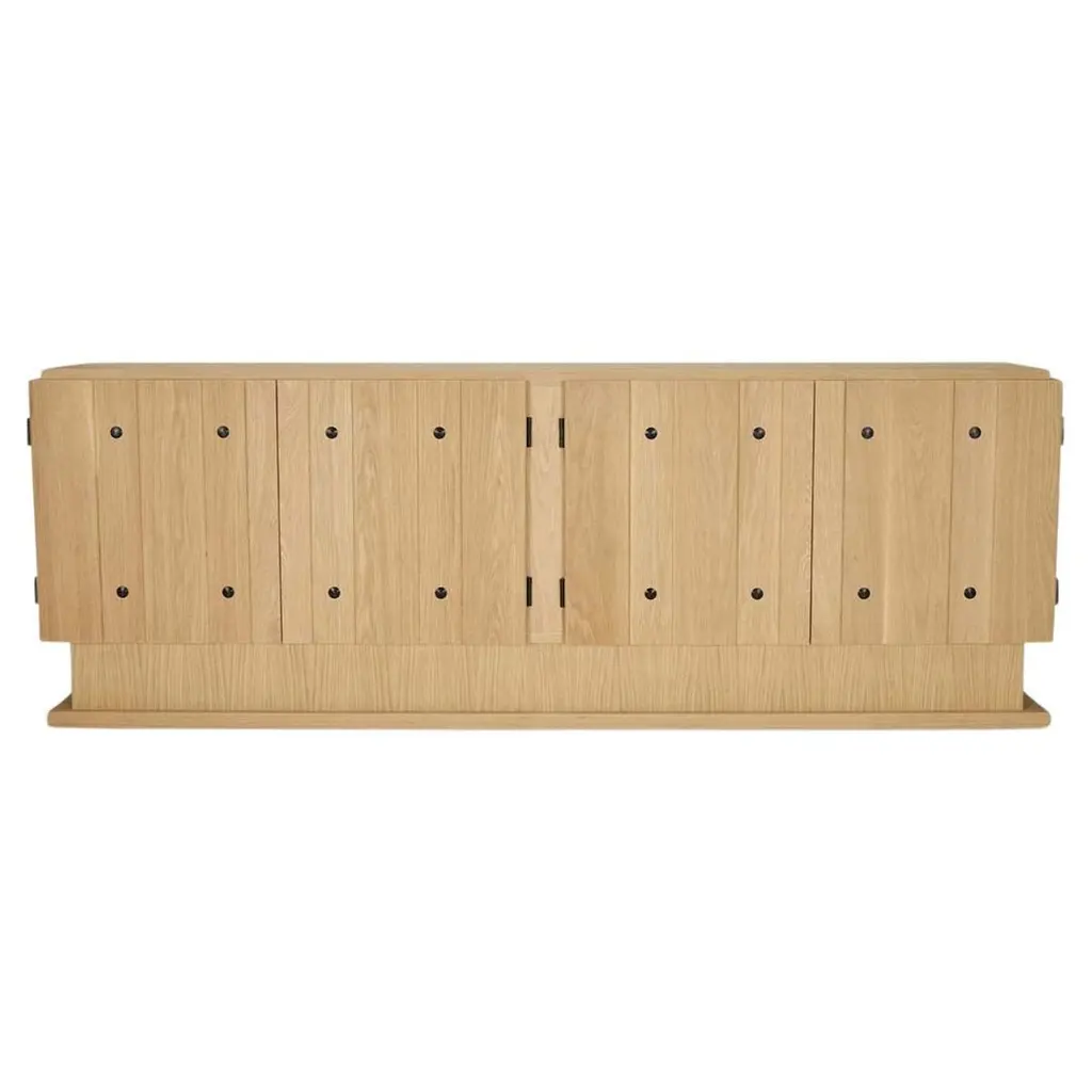 The Shadebooks V natural sideboard brings grounded elegance and tactile richness to modern interiors. With a focus on sculptural form and refined simplicity, each piece features clean lines, tailored silhouettes, and signature cutout pulls that double as subtle design statements. This sideboard is thoughtfully crafted with adjustable shelving and ample storage, offering functionality without compromising on style. Finished in warm, wood-grain tones, Shadebooks is designed to blend seamlessly into any space. Timeless yet distinctive, this piece offers a harmonious balance of quiet beauty and everyday utility. Customer assembly is required.