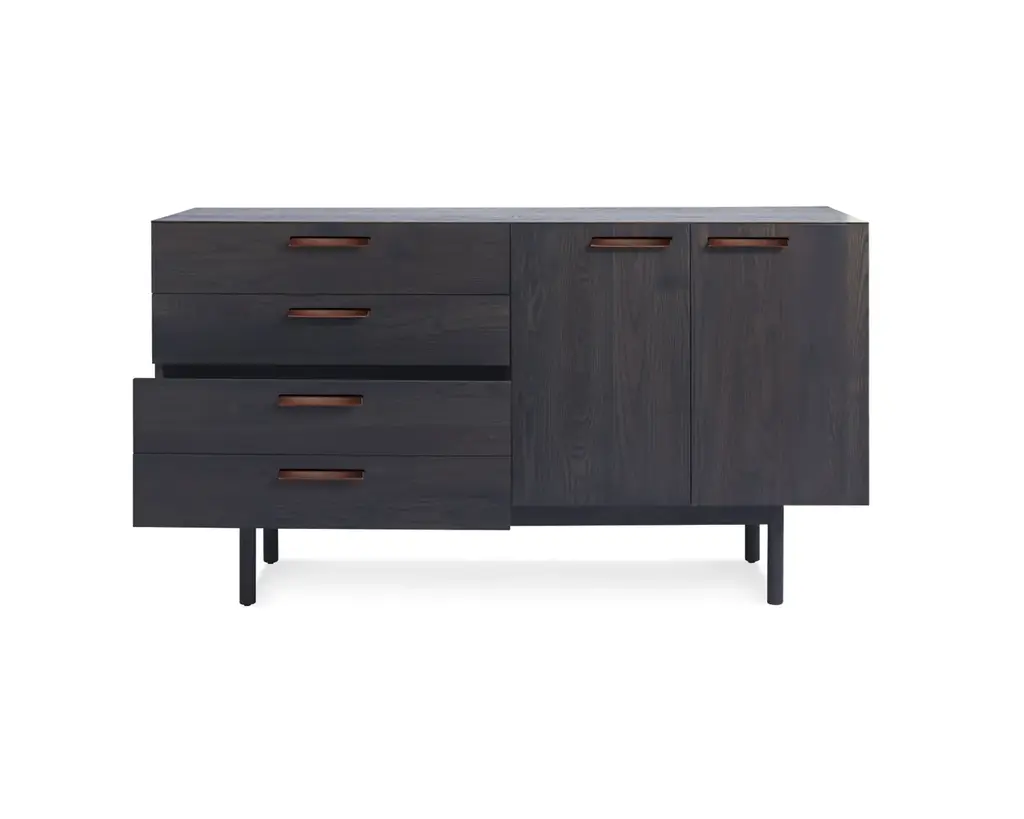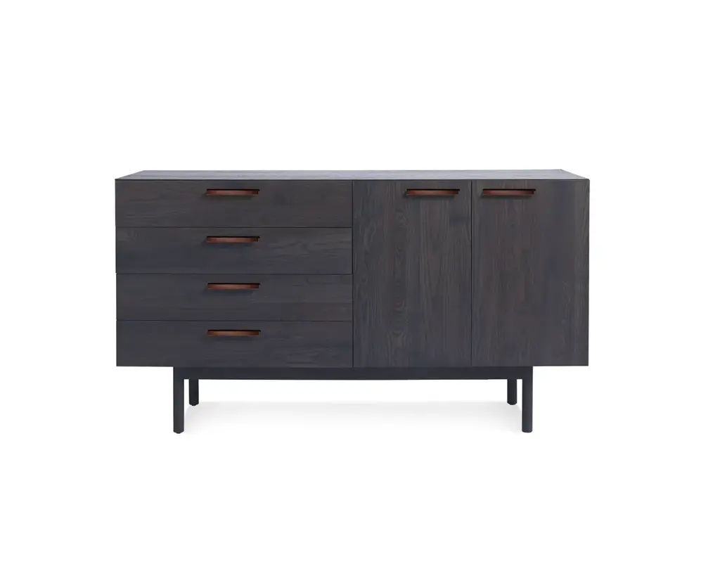 Layers of clean details. Warm wood and full grain leather pulls add storage panache and practicality to the bedroom, living room or dining room. Door units feature adjustable shelves and wire management holes. Available in Smoke, Light Walnut and natural Walnut.