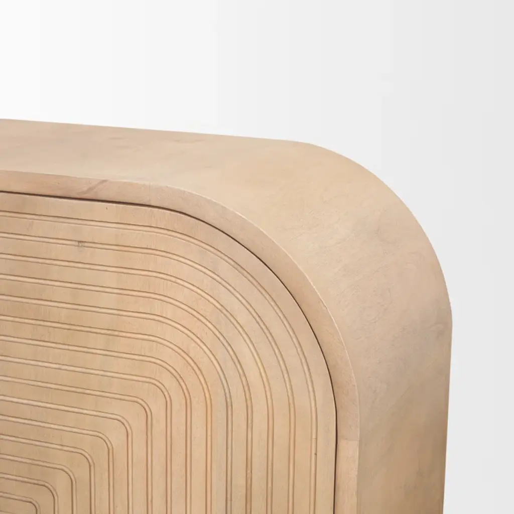 Vernalee Curio Cabinet is crafted from solid mango with CNC doors, featuring a unique reverse fluted design that adds depth, texture, and character. Made from solid mango wood in a light brown finish, each door showcases the natural beauty of the wood, with recessed handles seamlessly integrated into the intricate fluted pattern. With two fixed shelves behind four push-to-open doors, this modern yet grounded piece offers both style and functionality, making it a versatile addition to your home.