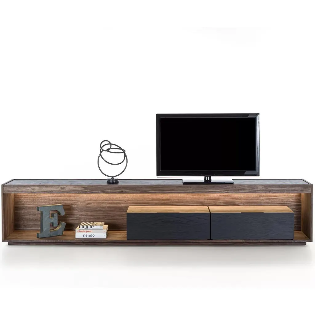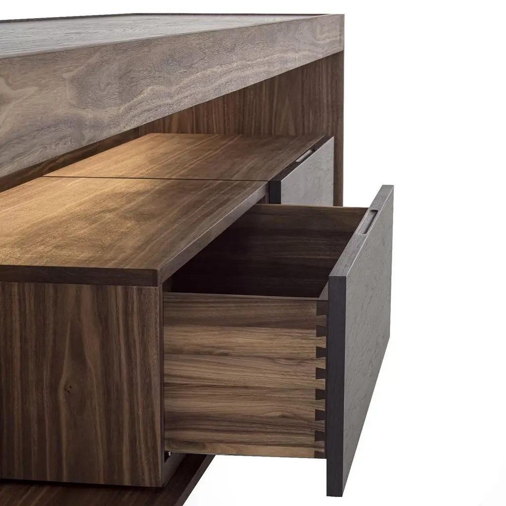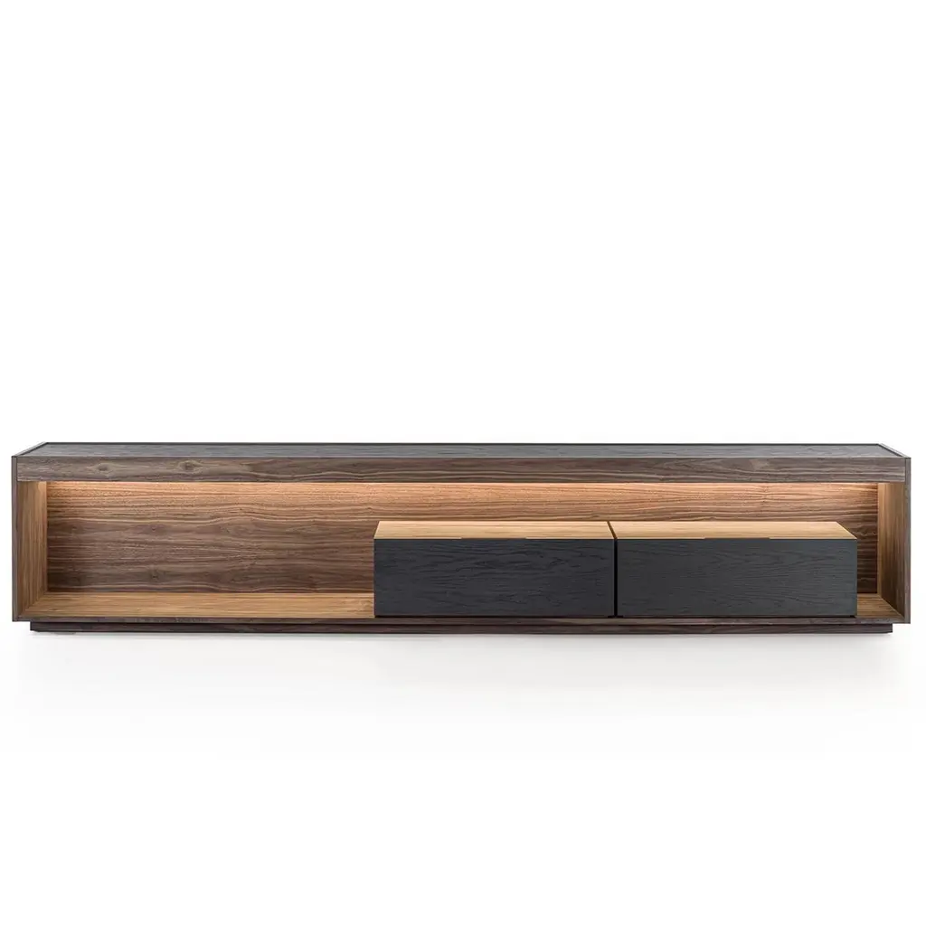 TV Sideboard Show Walnut with all structure in solid walnut wood.Opened sideboard made in oak veneered slatted wood and solid walnut wood, with 2 drawers with front side in pigmented solid oak in black finish. the 2 drawers are assembled with traditional dovetail joints.Sideboard with recessed top and LED lighting in the open compartment.Also available on request in solid oak.Also available on request in:L200xD50xH60cm, price: 11700,00€.L300xD50xH60cm, price: 14700,00€.