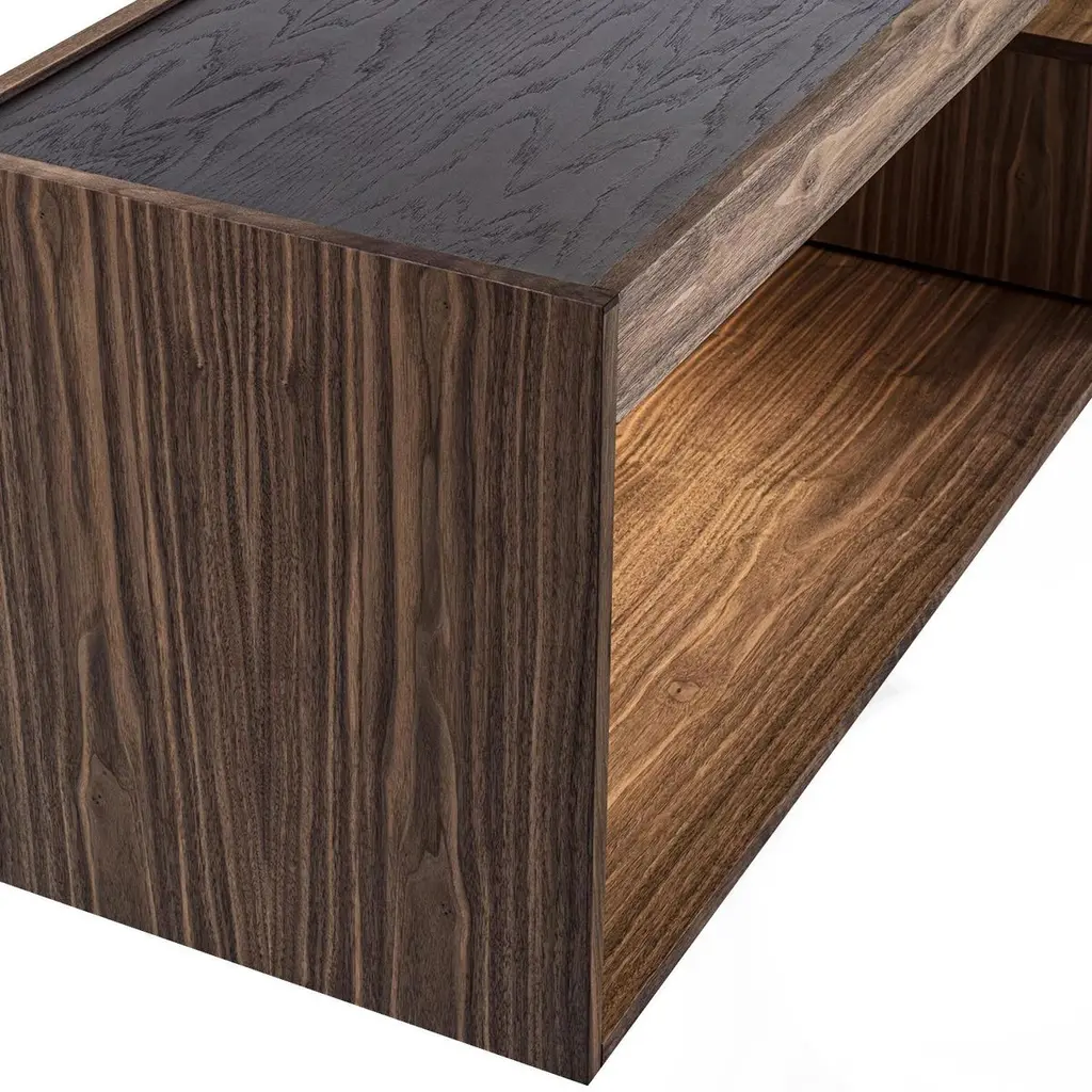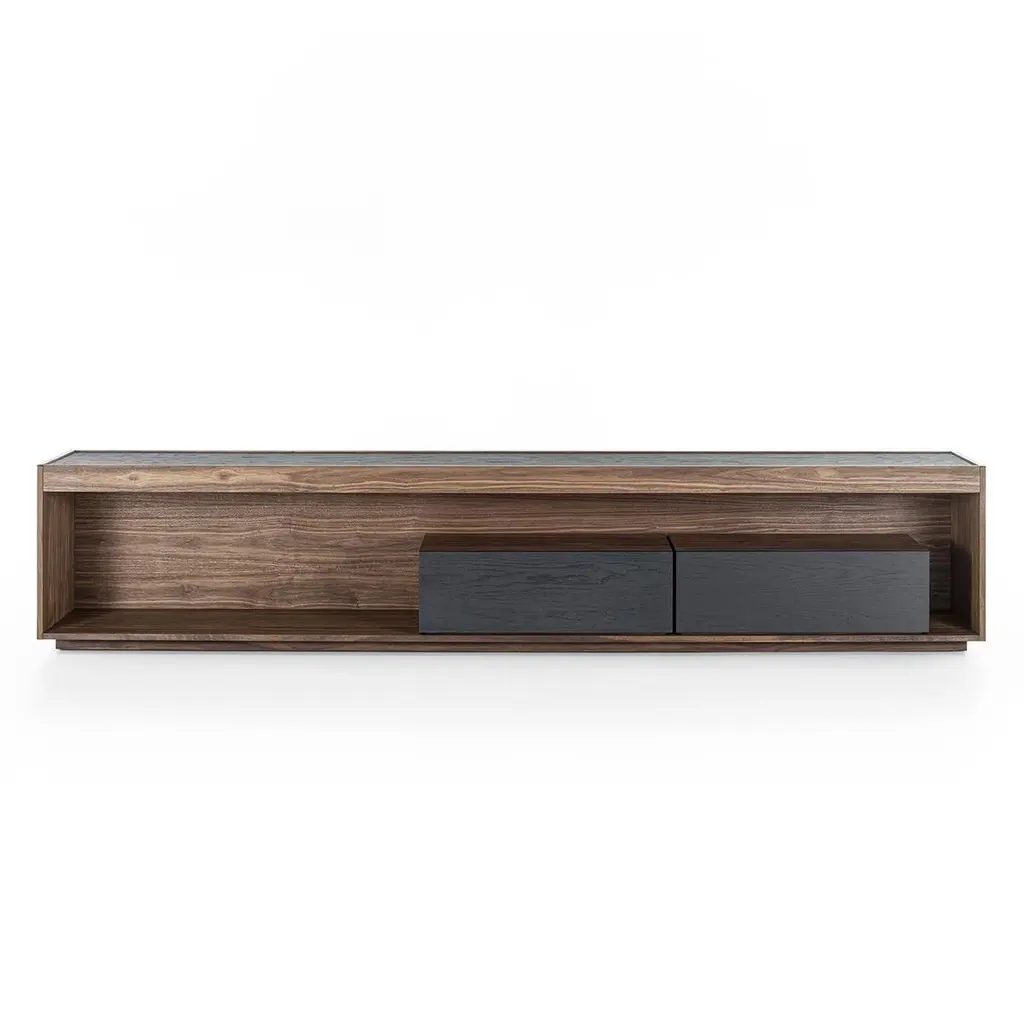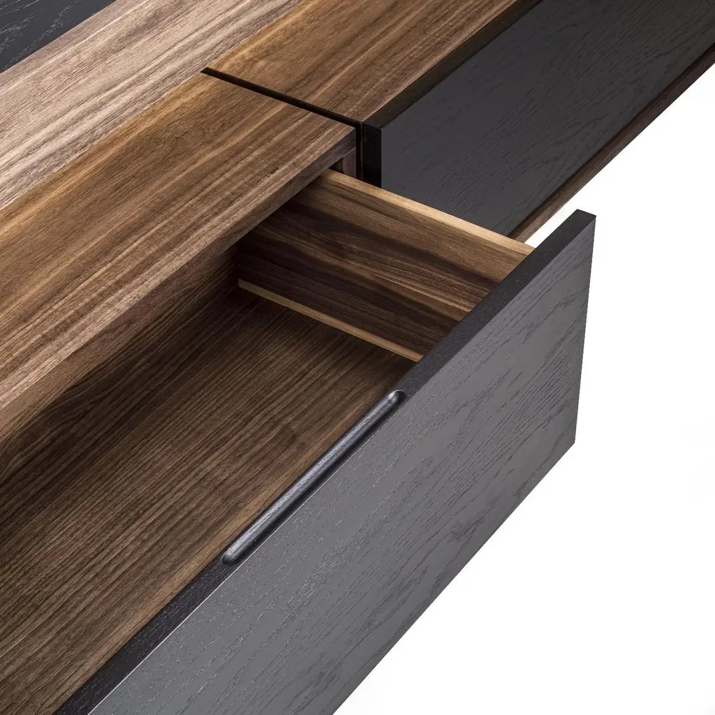 TV Sideboard Show Walnut with all structure in solid walnut wood.Opened sideboard made in oak veneered slatted wood and solid walnut wood, with 2 drawers with front side in pigmented solid oak in black finish. the 2 drawers are assembled with traditional dovetail joints.Sideboard with recessed top and LED lighting in the open compartment.Also available on request in solid oak.Also available on request in:L200xD50xH60cm, price: 11700,00€.L300xD50xH60cm, price: 14700,00€.