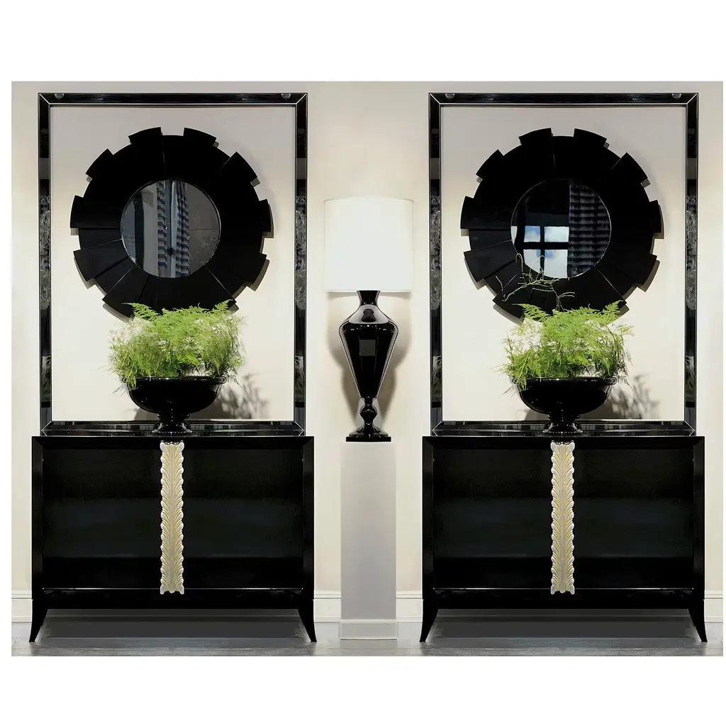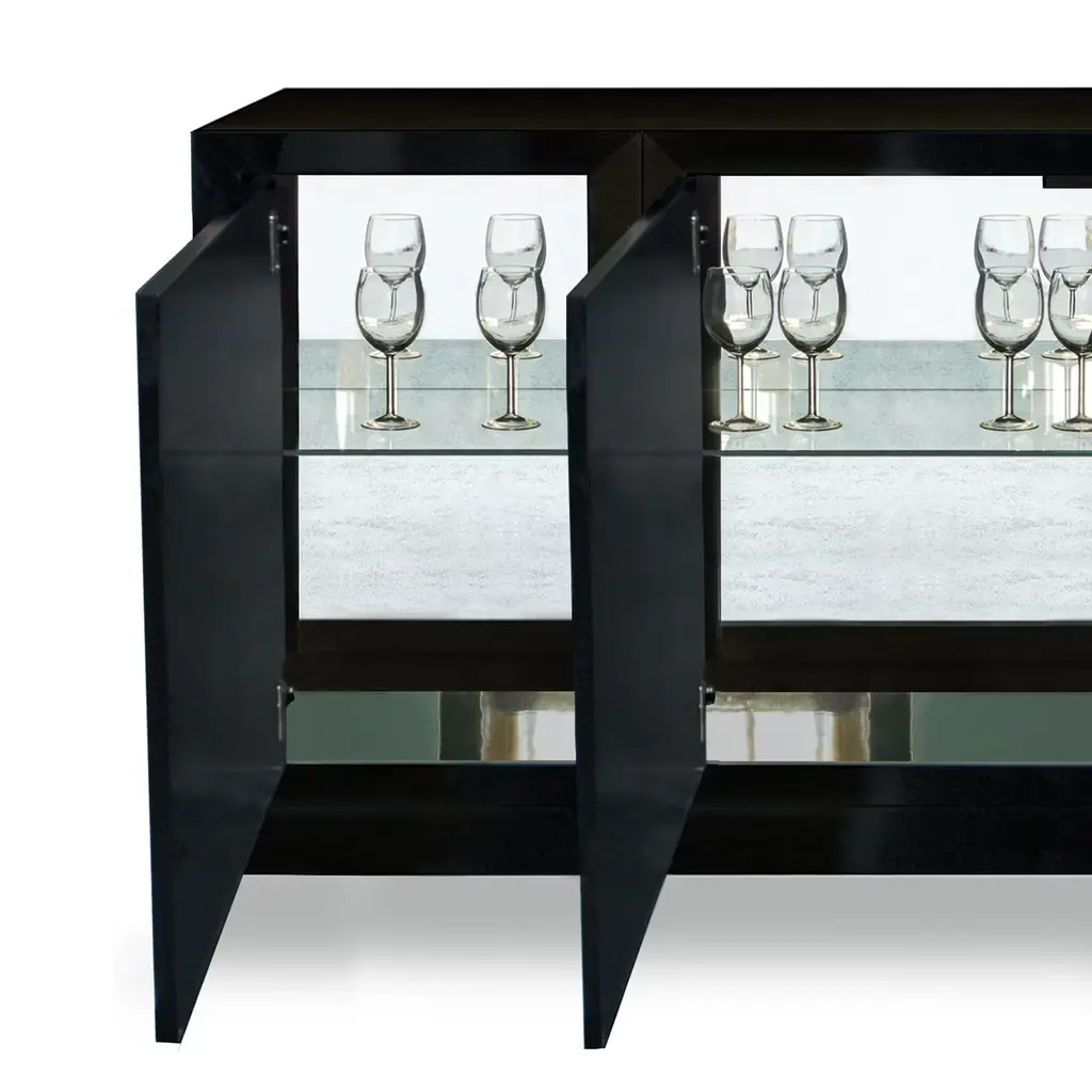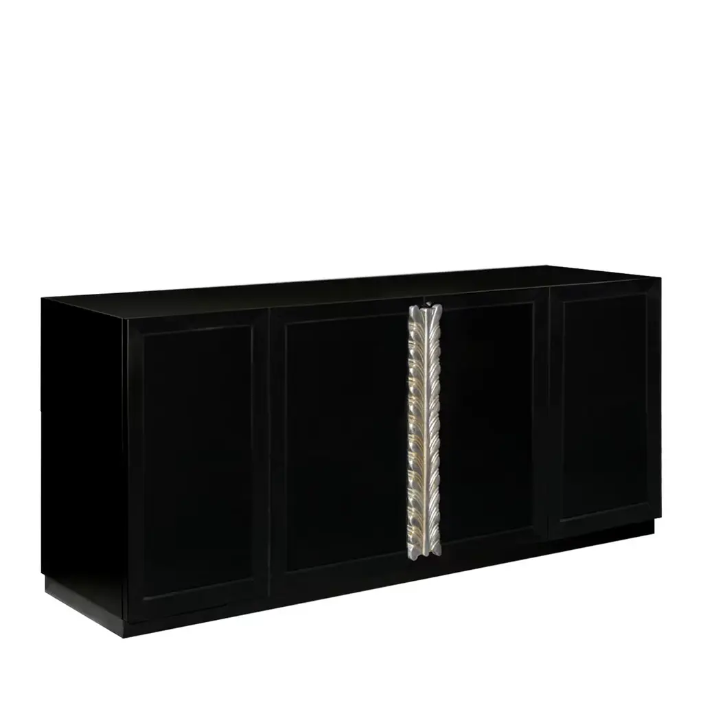 This four-door sideboard, is beautifully crafted by the finest Italian artisans and is finished in a hard, super sleek black gloss lacquer. The carved wooden leaf shaped handle, with the intense effect of the hand-applied silver leaf, offers a subtly glamorous appeal. Designer: Isabella Costantini. Please ask the Concierge for customization options.