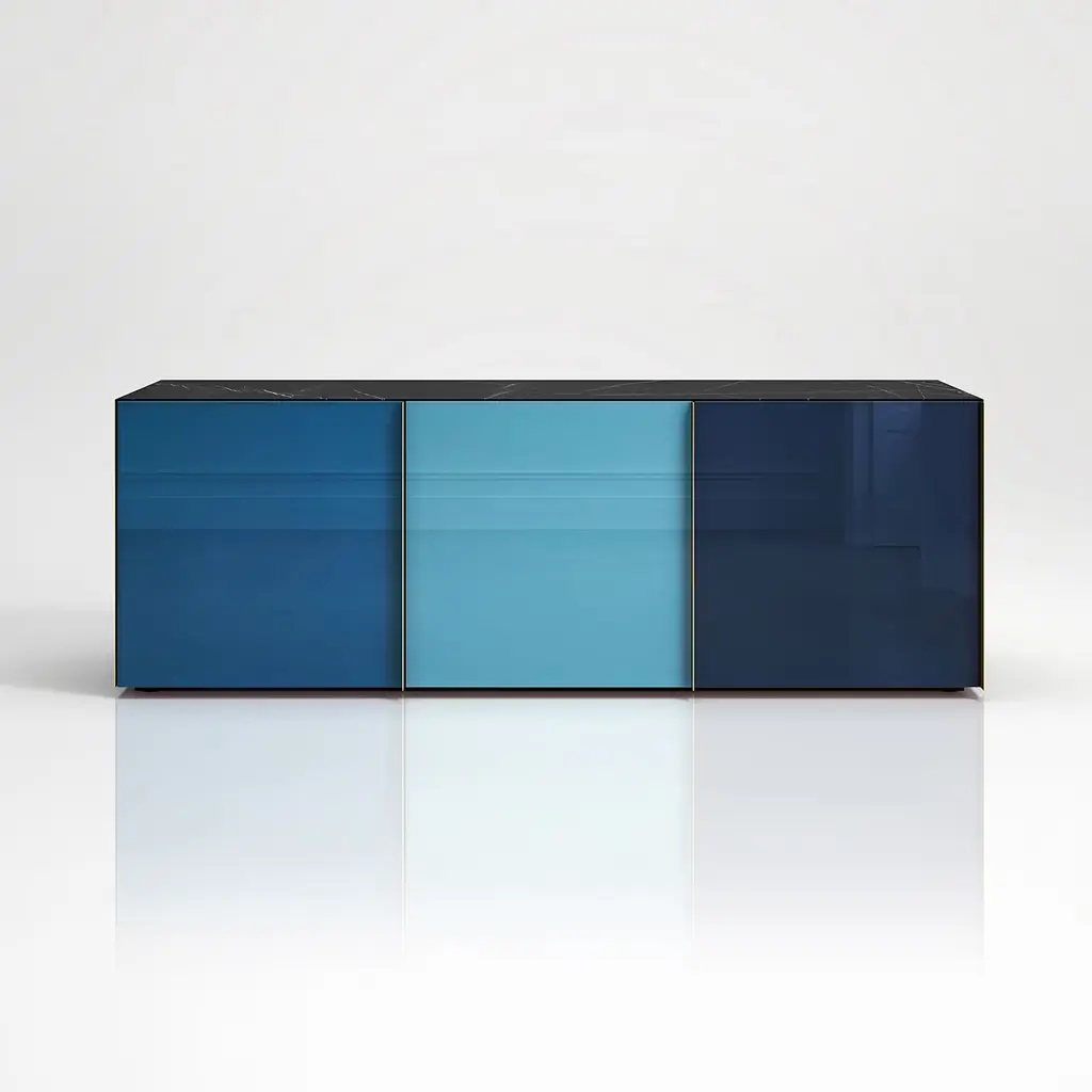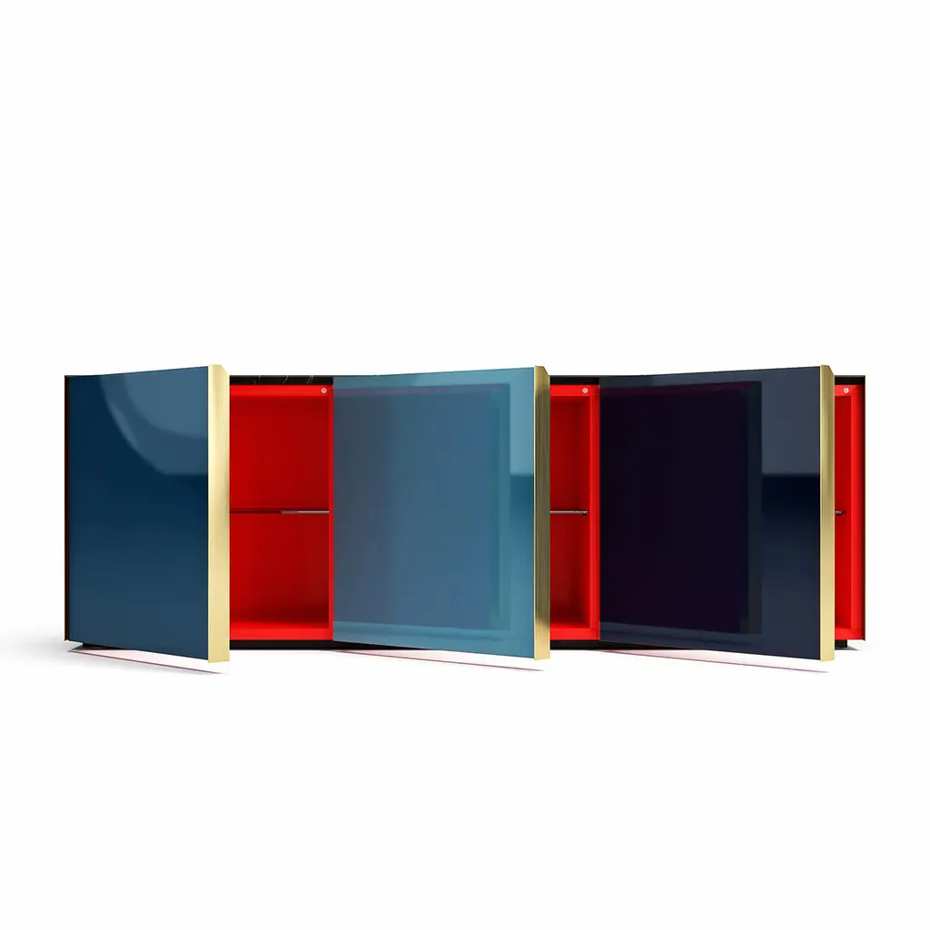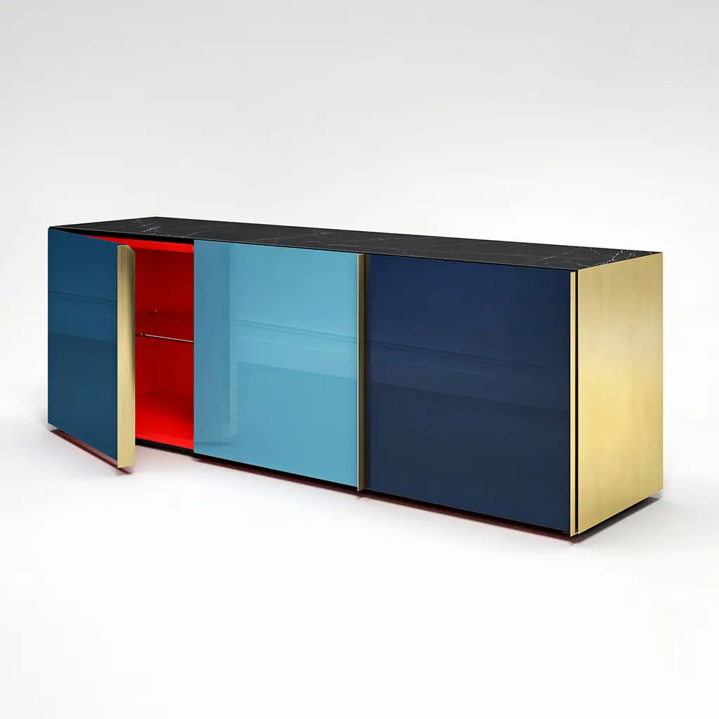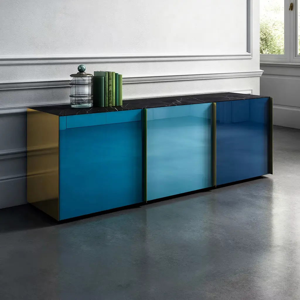 This wooden sideboard will be a statement piece in any modern home in part thanks to the sophisticated, back-paint technique gracing the glass doors in intense tones of blue. Fitted with three doors that open to reveal a spacious interior organized in glass shelves, the sideboard is enlivened by luminous brass side panels and handles for a subtle luxury edge. The precious top in New Saint Laurent marble completes the design.