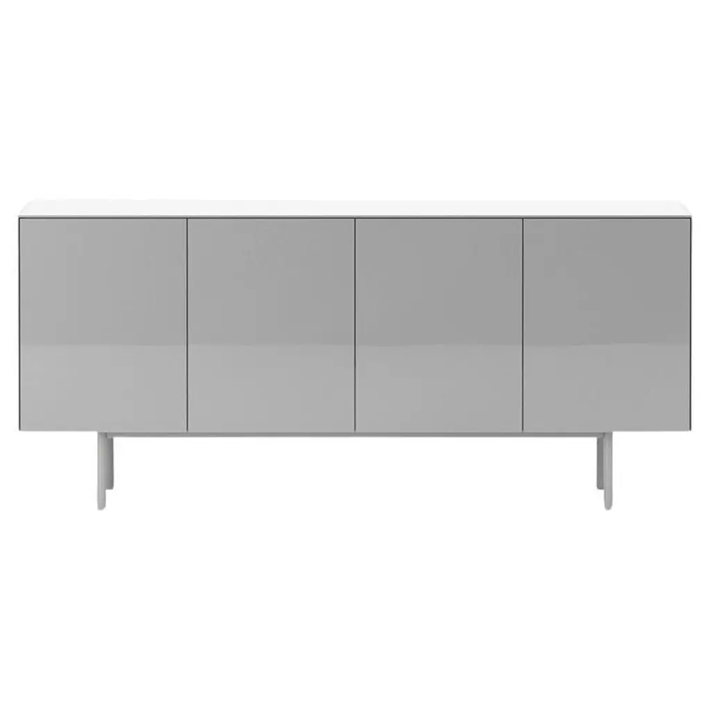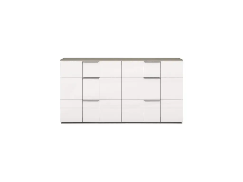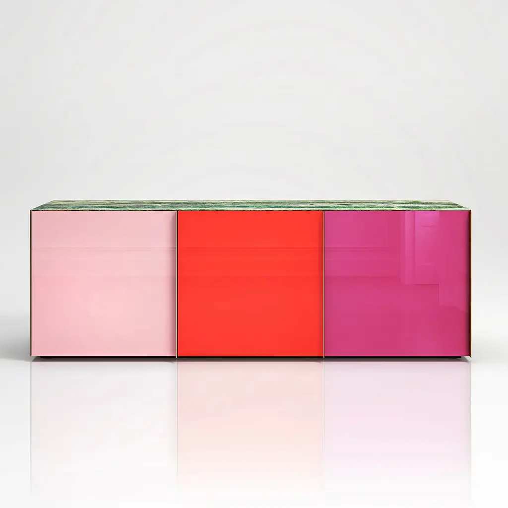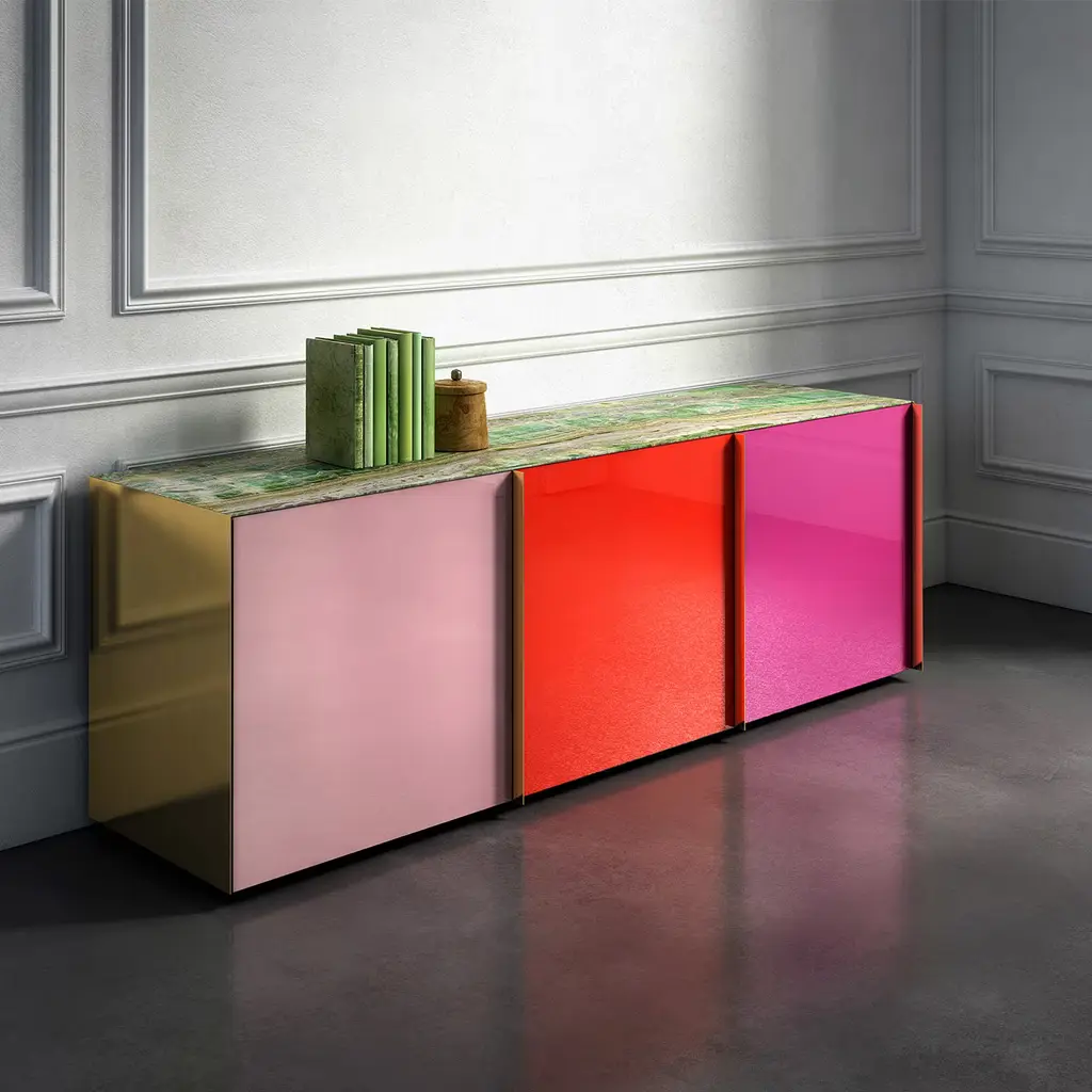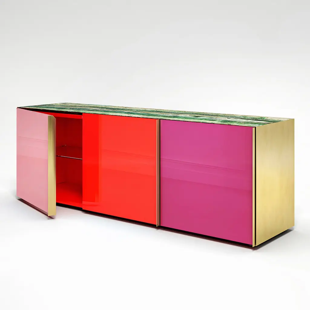 This eye-catching sideboard stands out for its vibrant colors and mesmerizing reflections. Its silhouette comprises a lacquered wooden structure equipped with three glass shelves, framed by side brass panels, and closed on the front by three glass doors back-painted in captivating hues ranging from delicate pink to bright red. A prized top in Emerald onyx completes the design. Available in other material and color variants, please ask the Concierge for further details.