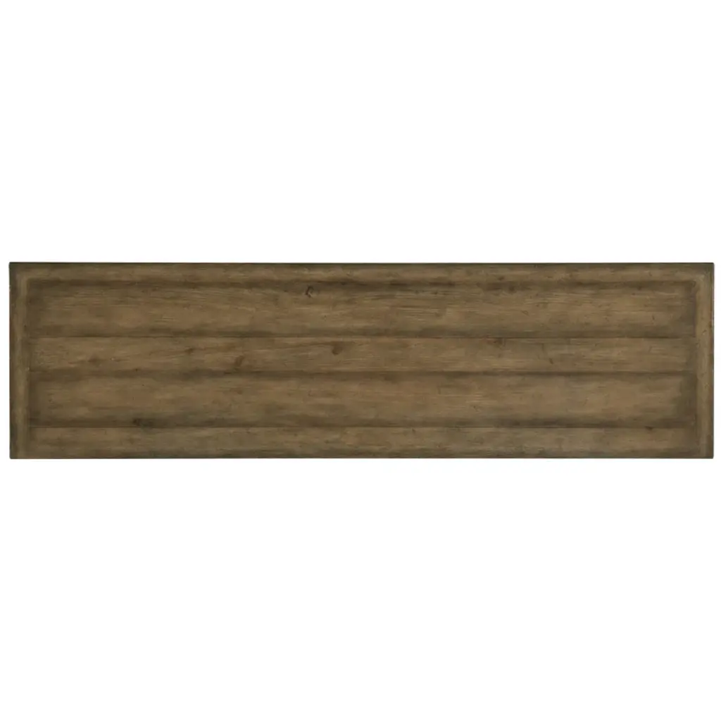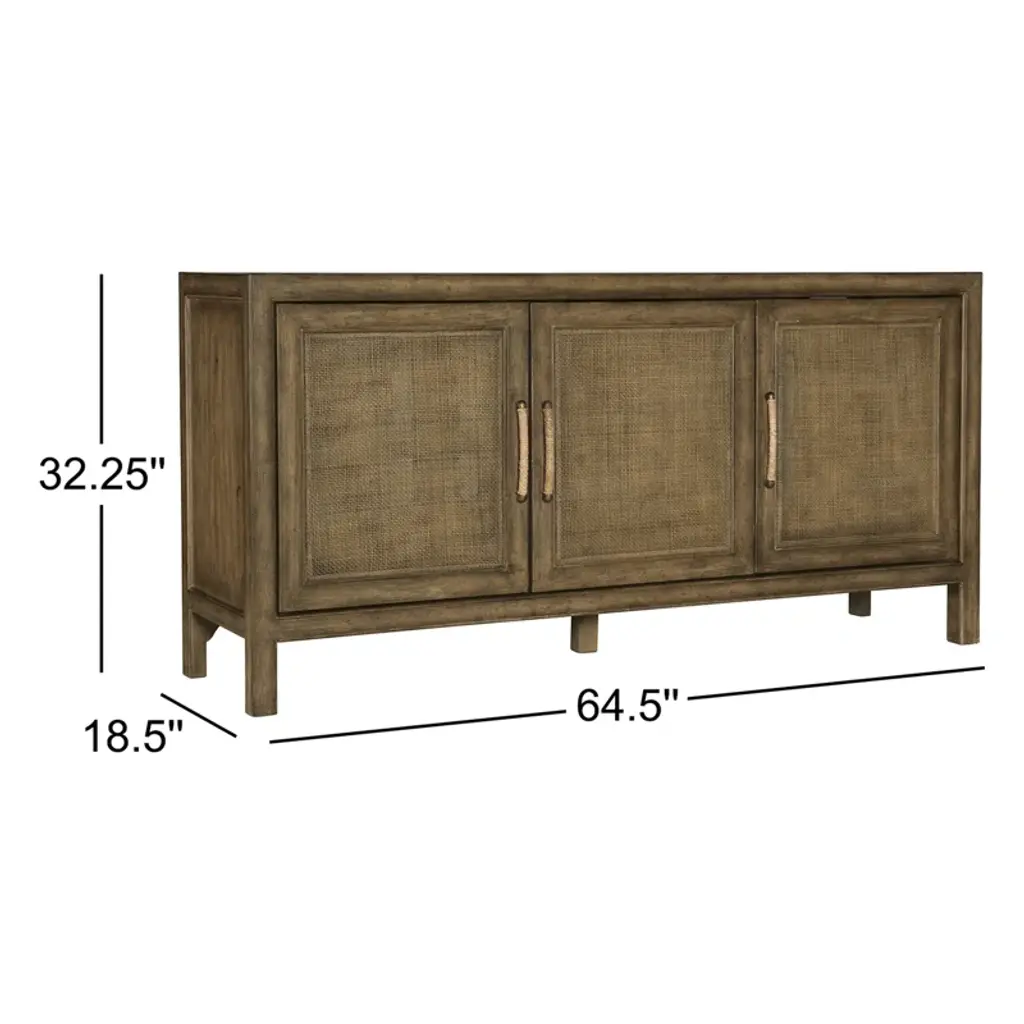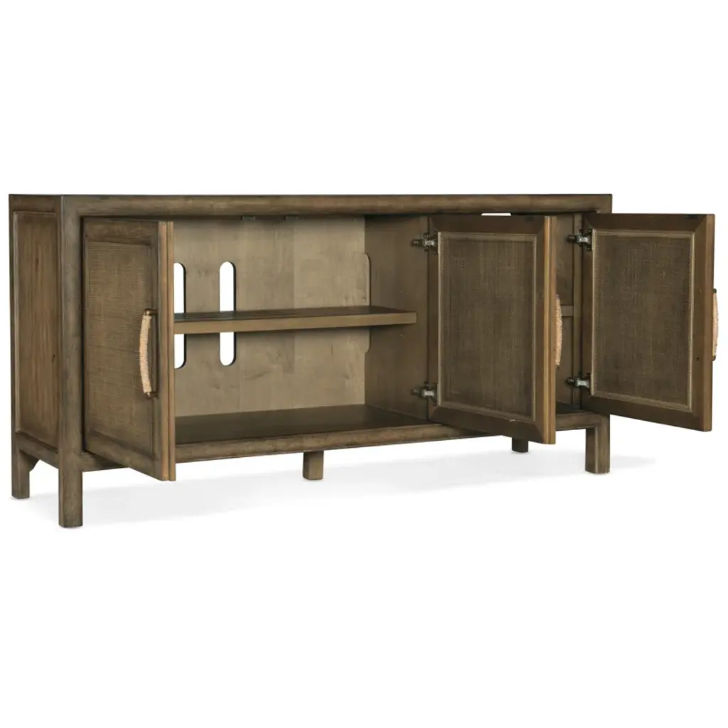 With a laid-back tropical vibe, the sundance media console has three rattan-front doors with soft-close hinges and is finished in the cliffside, a rich brown with light burnishing on the edges. Crafted of pecan veneers and rattan with a solid wood edge top, the console has one vented adjustable shelf behind the left pair of doors and one vented adjustable shelf behind the right door, a ventilated back panel, and one 3-plug electrical outlet. Accommodates a 70-inch flat-screen TV.