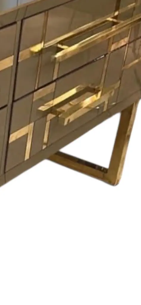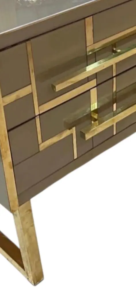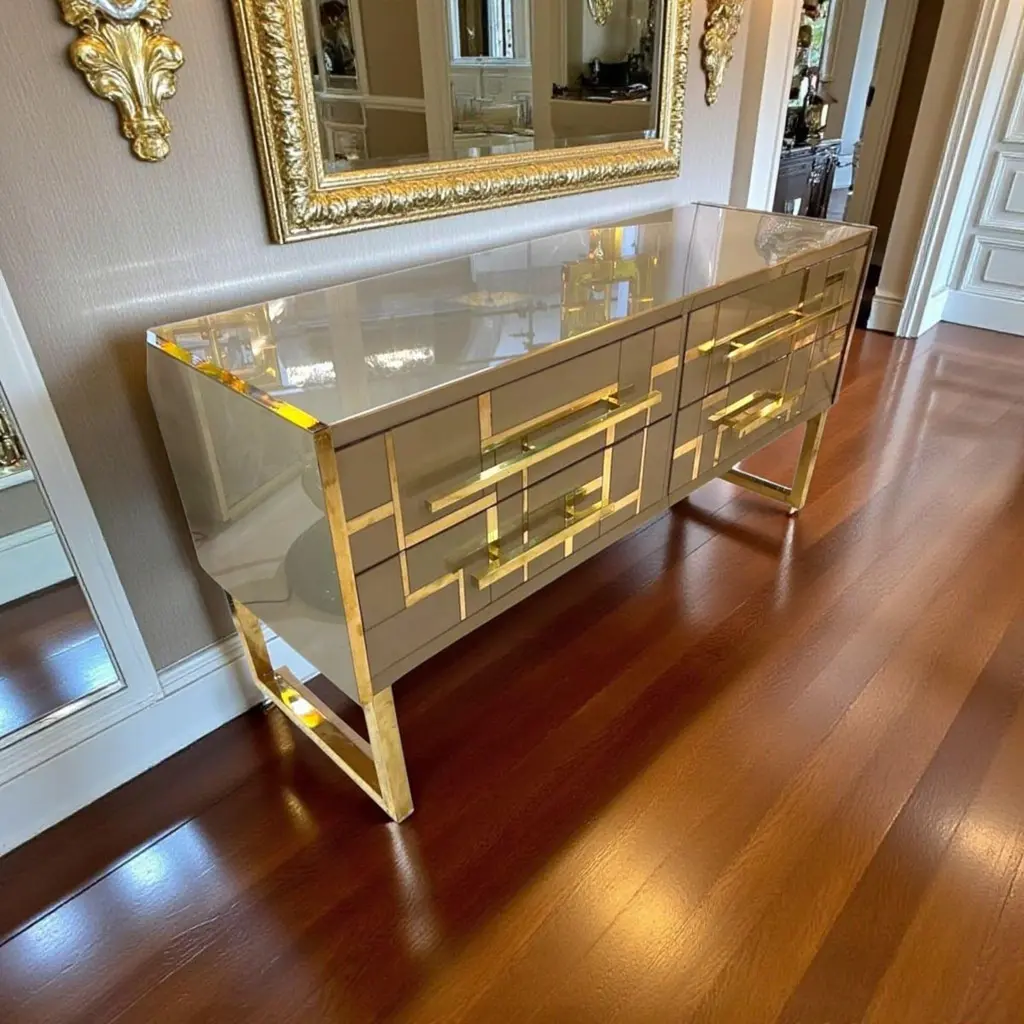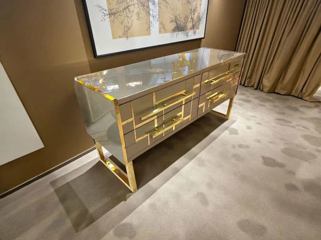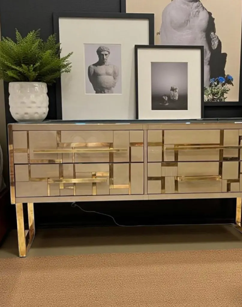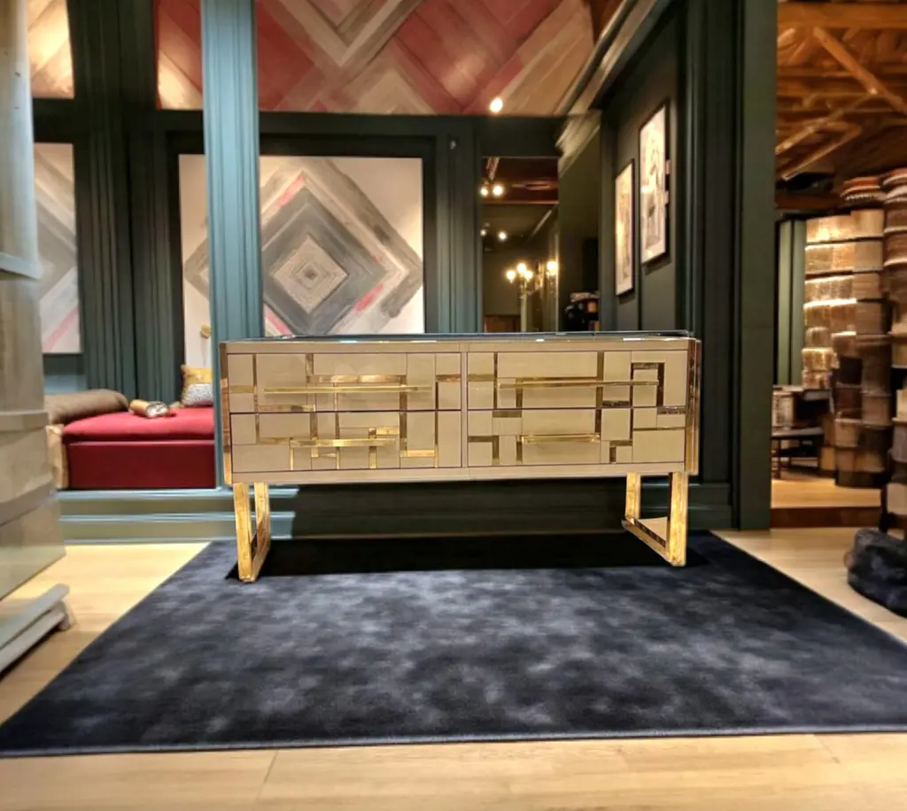 Among the protagonists of the new contemporary luxury furniture is this extraordinary piece of furniture, produced and designed by Justfurnituress. A piece that combines craftsmanship and design, in which geometric rigour meets the preciousness of materials.The gold-colored artistic glass surface captures and reflects natural light, while the brass inlays draw sophisticated textures that transform the complement into a true domestic work of art. The structure, made of birch, poplar or walnut, lends solidity and versatility, with the possibility of being completely customized in size, color and finish.A piece of furniture that is not limited to functionality, but becomes a scenographic and identity element, able to enhance the environments with an exclusive and timeless character. With this creation, Justfurnituress confirms its vocation to transform interior design into a tailoring and refined experience.
