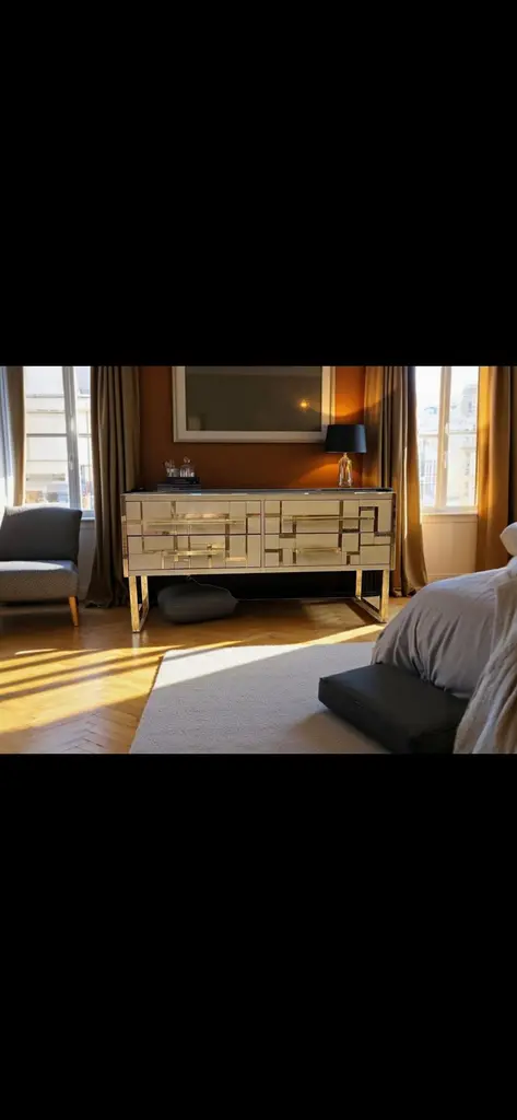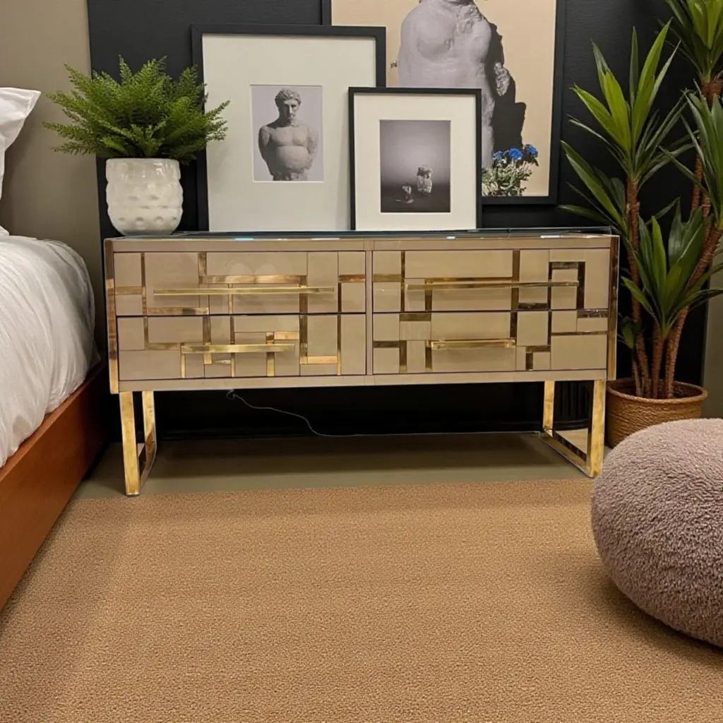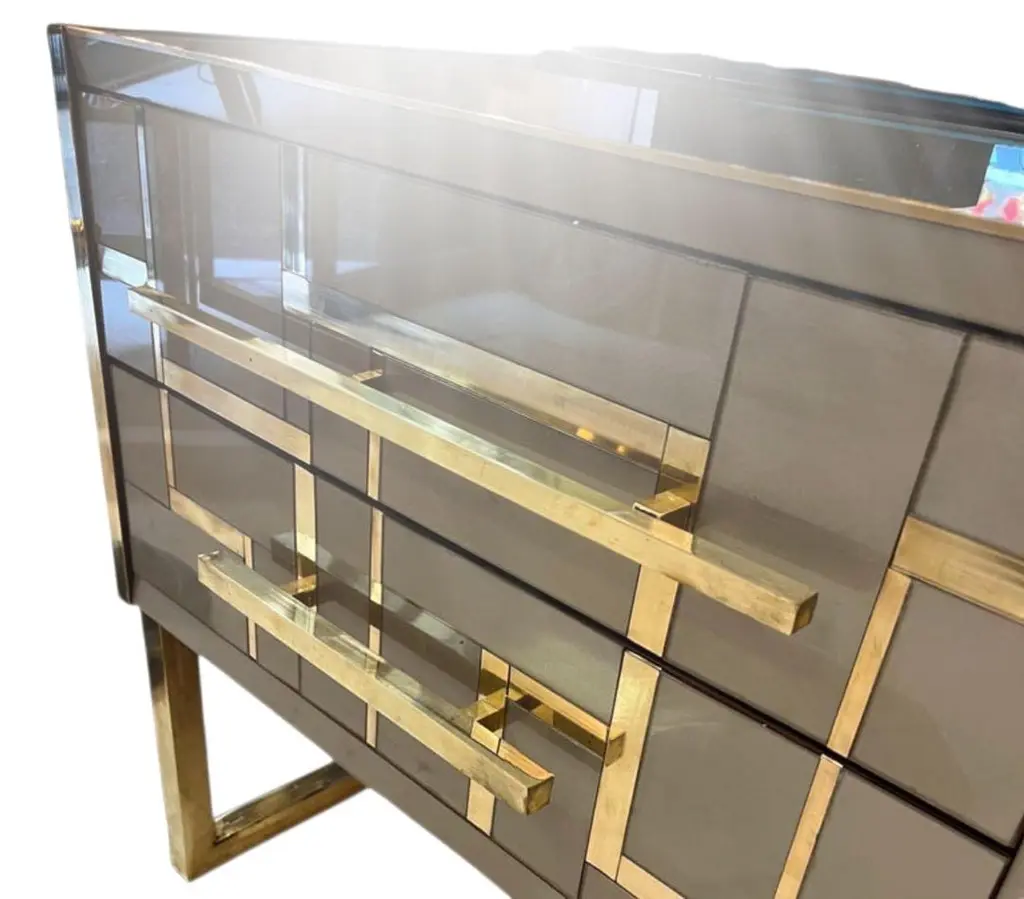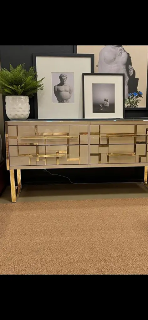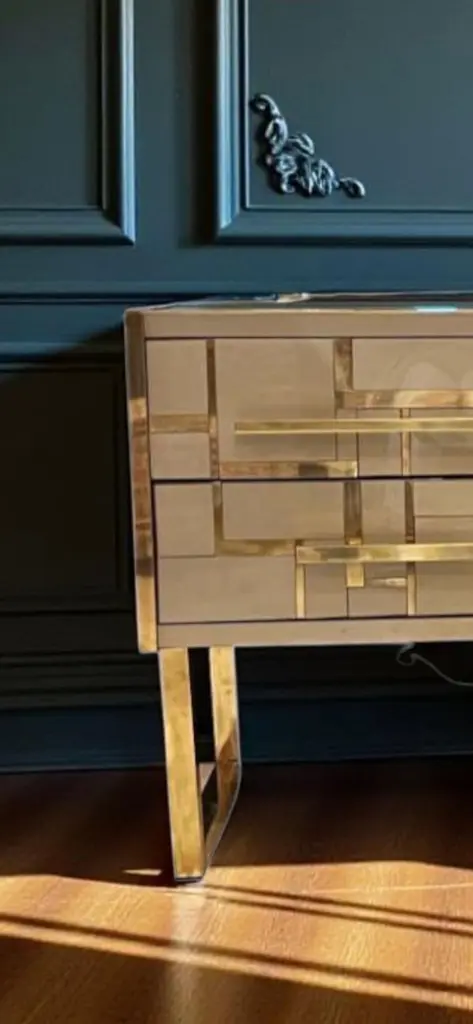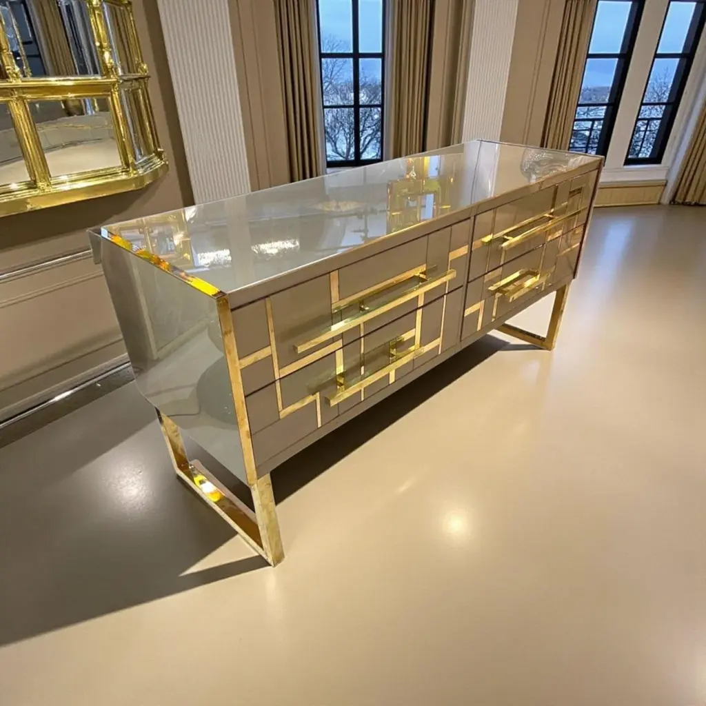 Among the protagonists of the new contemporary luxury furniture is this extraordinary piece of furniture, produced and designed by Justfurnituress. A piece that combines craftsmanship and design, in which geometric rigour meets the preciousness of materials.The gold-colored artistic glass surface captures and reflects natural light, while the brass inlays draw sophisticated textures that transform the complement into a true domestic work of art. The structure, made of birch, poplar or walnut, lends solidity and versatility, with the possibility of being completely customized in size, color and finish.A piece of furniture that is not limited to functionality, but becomes a scenographic and identity element, able to enhance the environments with an exclusive and timeless character. With this creation, Justfurnituress confirms its vocation to transform interior design into a tailoring and refined experience.