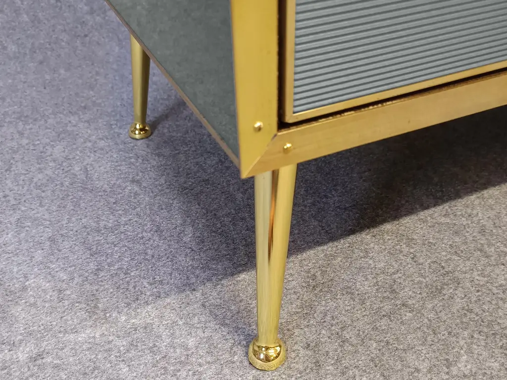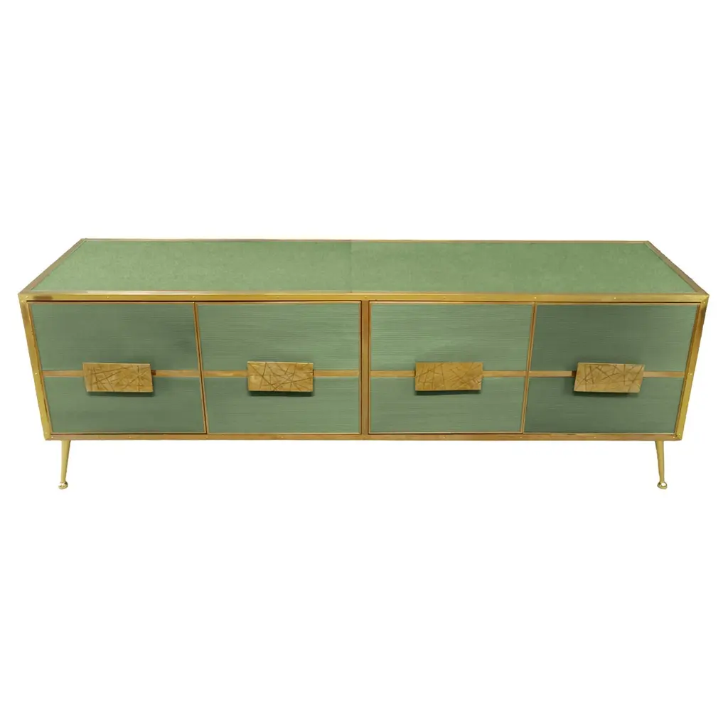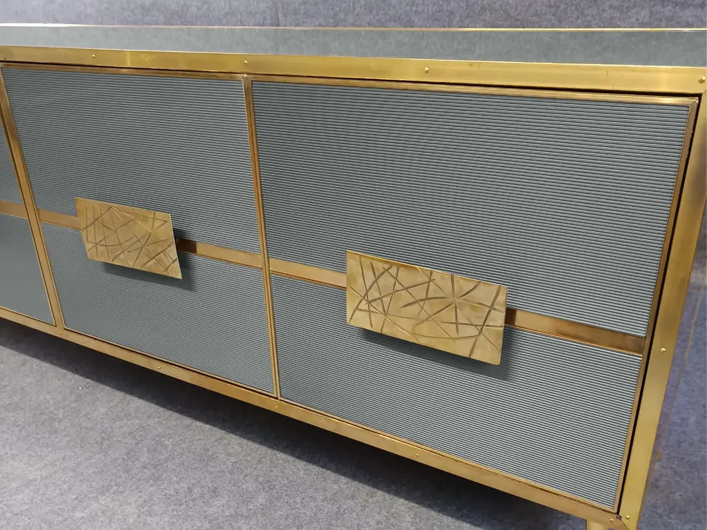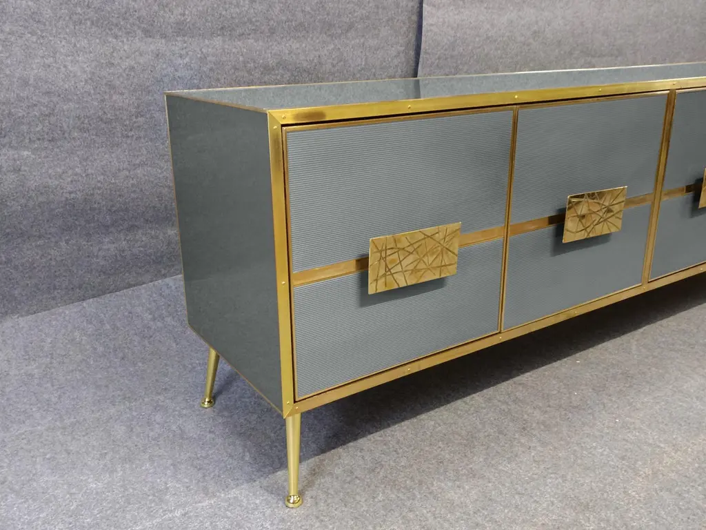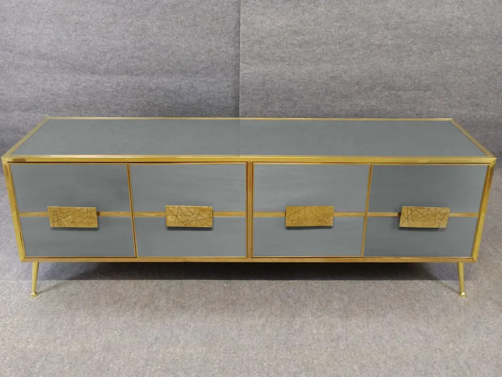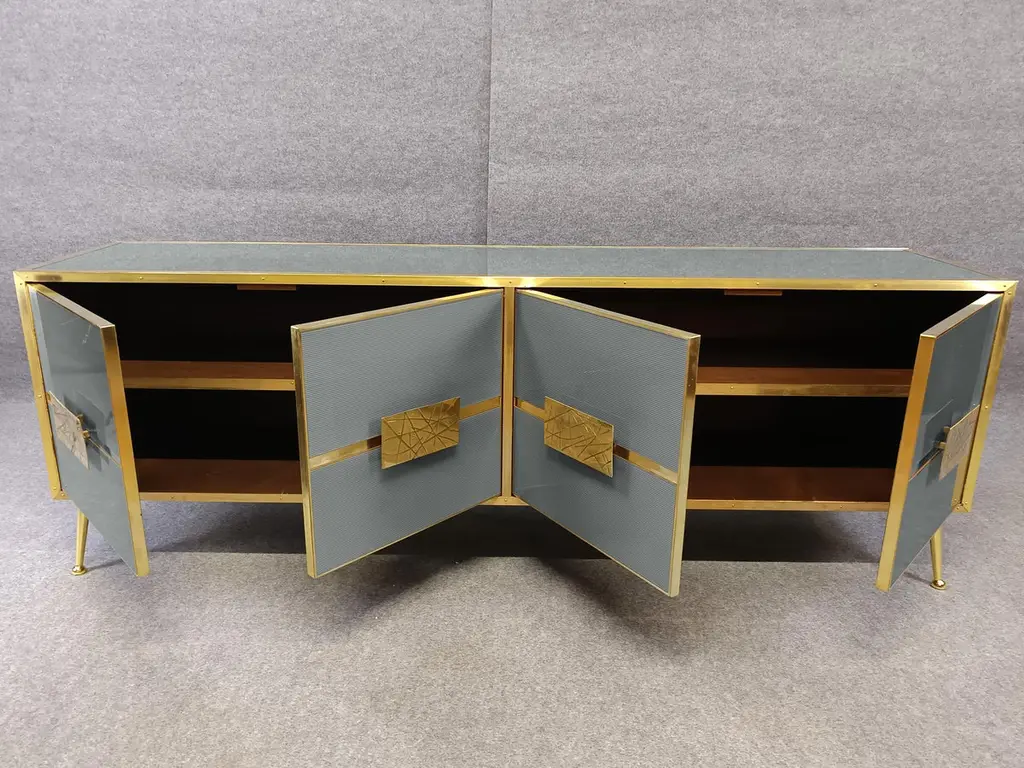 Grey sideboard with Murano glass doors 'Stile Grisinato' Made in ItalyFeaturing four intricately designed Murano glass doors, this piece is a true work of art.The sideboard is constructed from high-quality materials, including birch, brass, and opaline murano glass, to ensure durability and a quality feel.Handmade square brass handles and polished brass inserts add a touch of vintage charm. Beyond its aesthetic appeal, this sideboard offers substantial utility with its spacious interior. The four Murano glass doors open to reveal ample storage space, ideal for organizing dinnerware, linens, or other household items. The production of this handcrafted sideboard takes 7-8 weeks, making it a tailor-made addition to your home. Perfect for those who appreciate craftsmanship and timeless design.