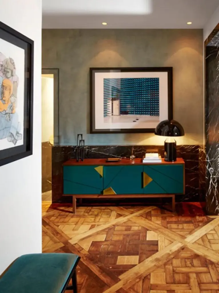 Jazz sideboard is a high quality product by Mambo Unlimited Ideas, crafted in polished or matte oak wood veneer structure and feet, brass applications and lacquered doors. It features three dimensional designs on its doors, elegant oxidized brass handles and discreet wood feet.This sideboard is divided in three doors, with shelves inside. Made to Order.