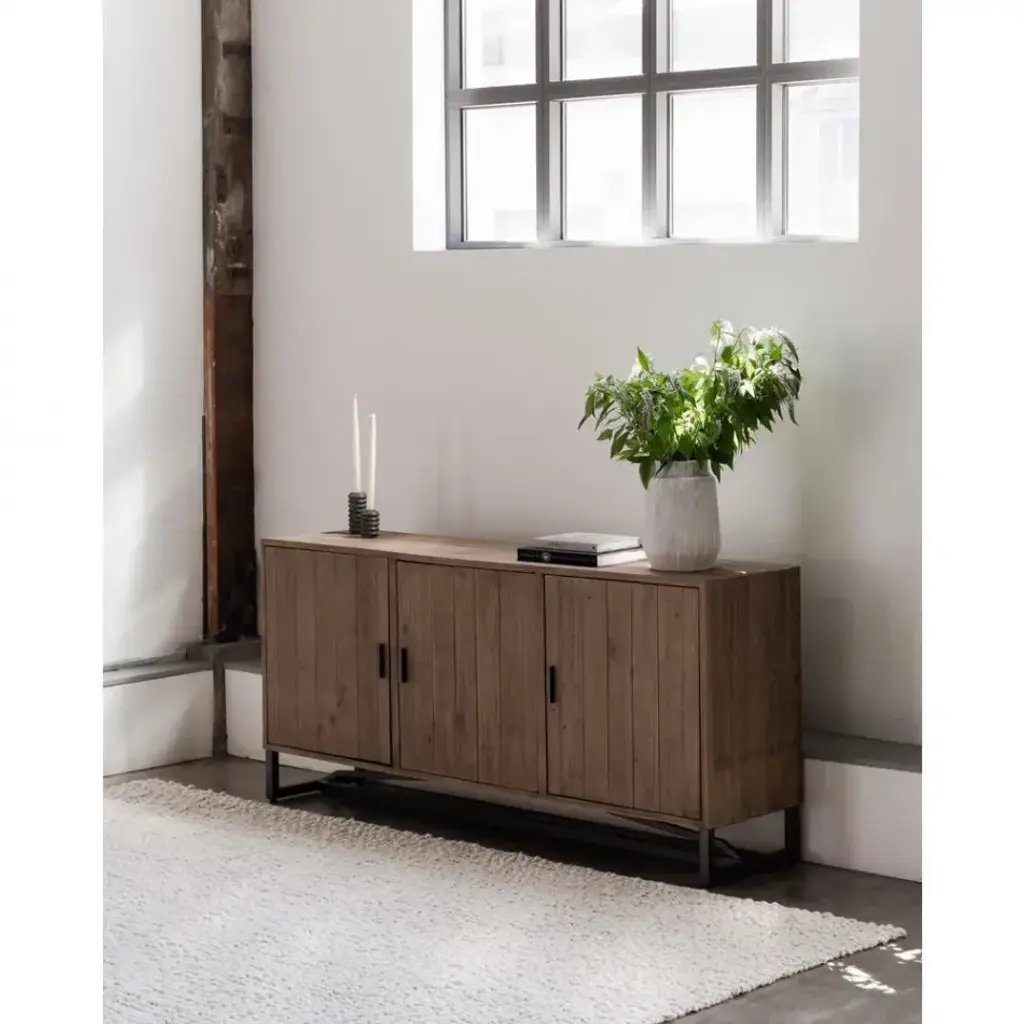 The Sierra sideboard is a stunning testament to the beauty of reclaimed pine and the art of sustainable design. Showcasing the natural wood grain and distinctive knot patterns inherent to the material, this sideboard offers functional storage with six generously-sized shelves. Elevated by a solid metal base, this piece embraces a transitional design that seamlessly unites the warmth of rustic aesthetics with the clean lines of contemporary style.