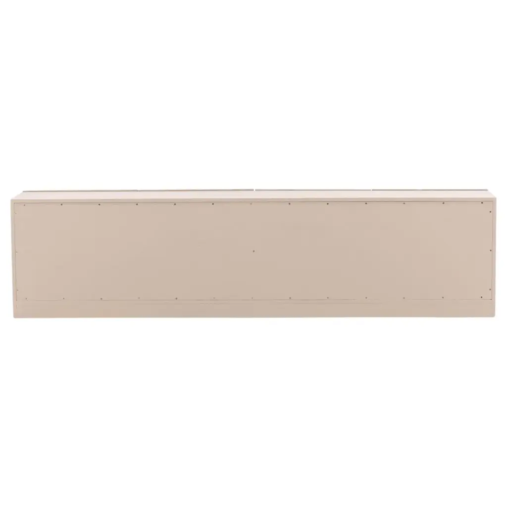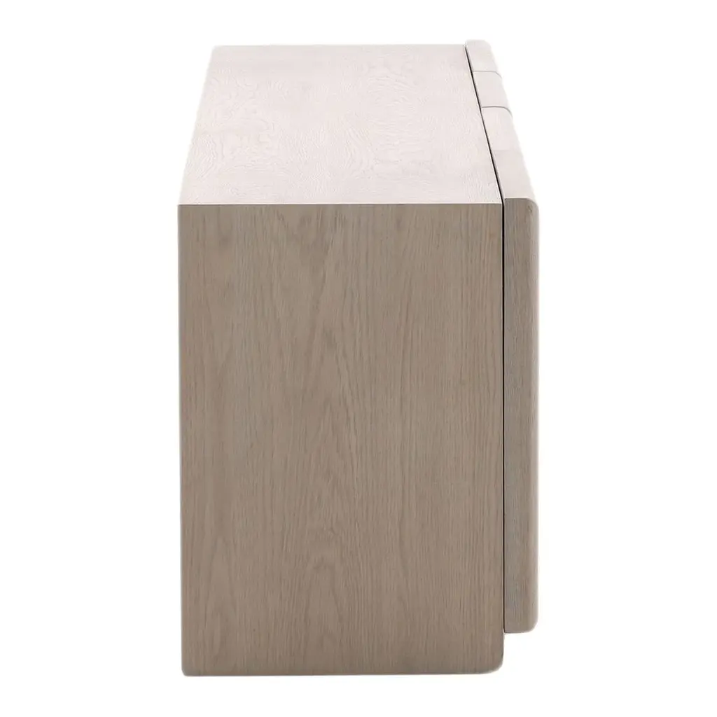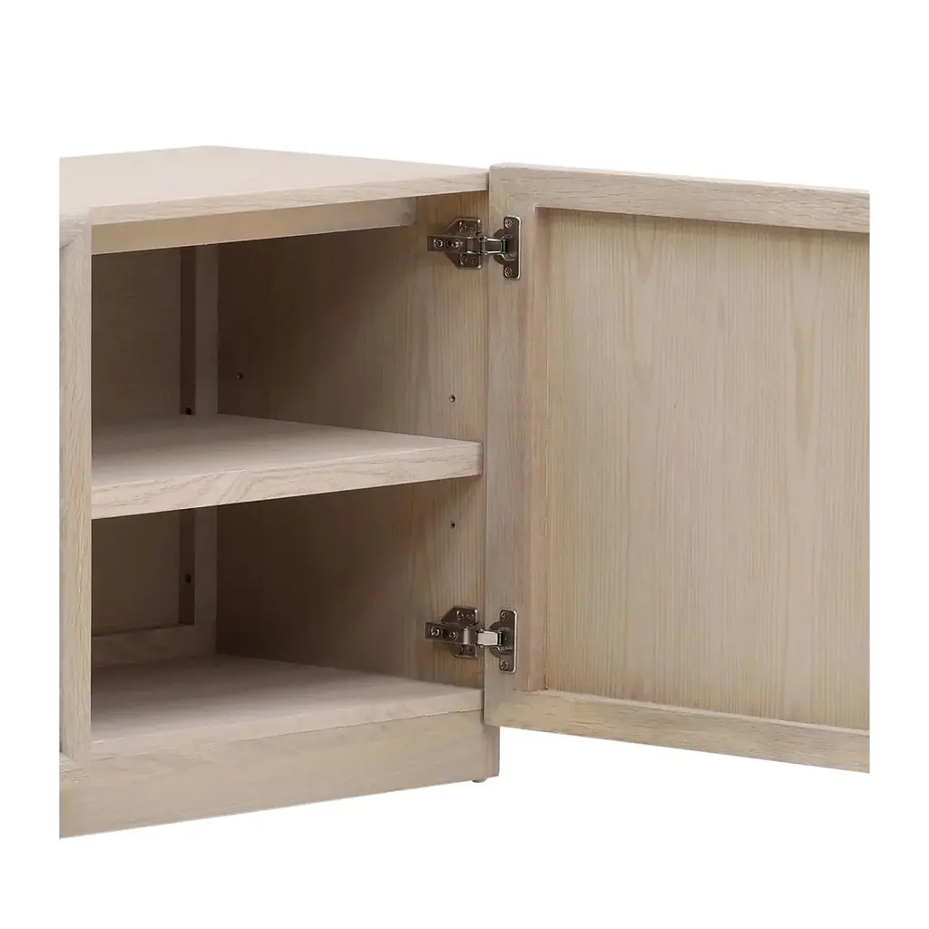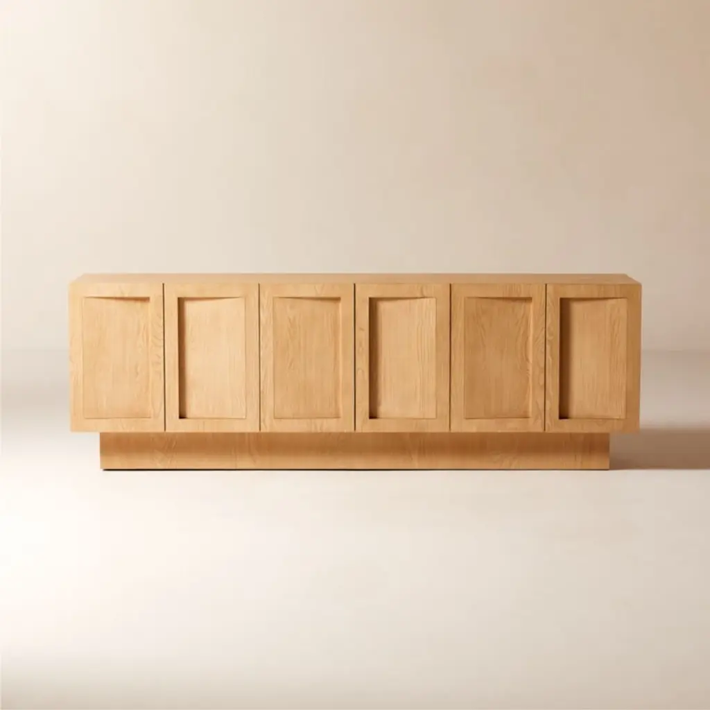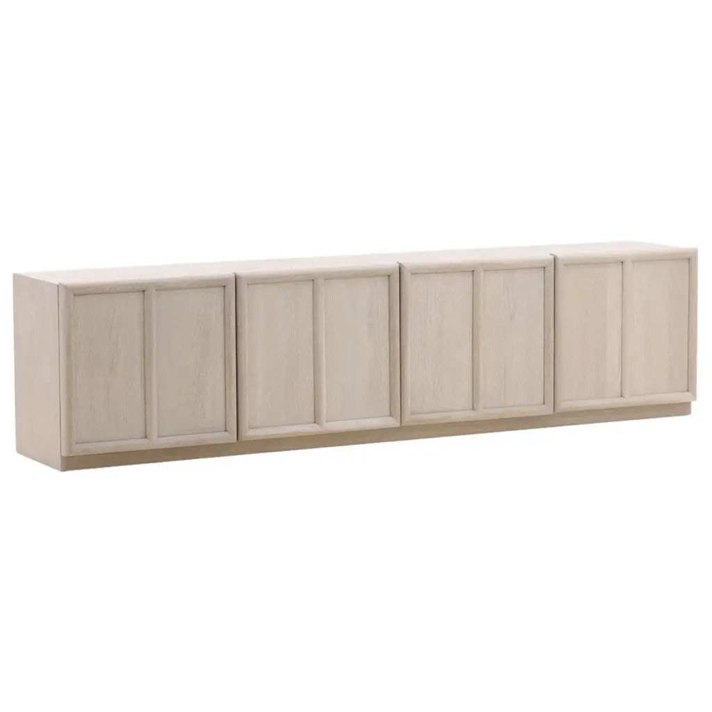 Simple contemporary long low profile sideboard / credenza crafted from beautiful light blond toned oak wood. Four doors open to ample storage space and shelving. Great for many uses. Weighs approx. 165 lbs.