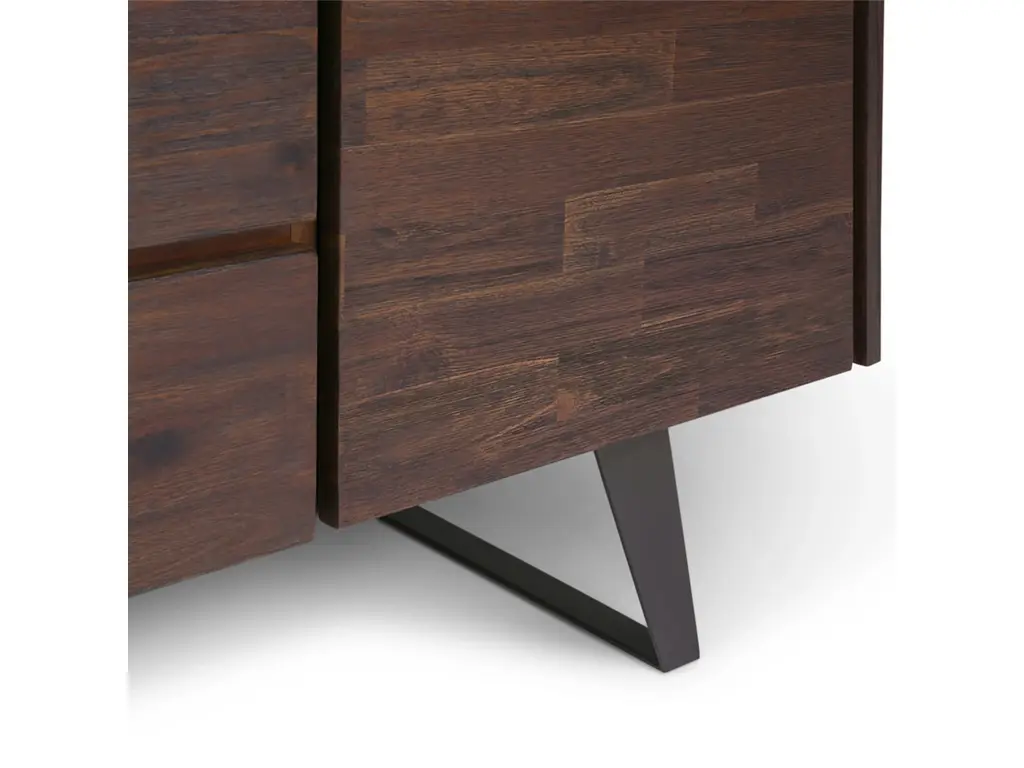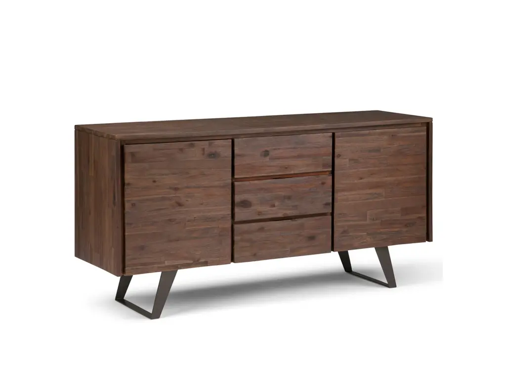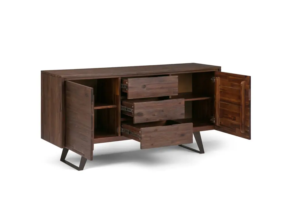 Elevate modern dining with the clean lines of the Modern Industrial Lowry Sideboard Buffet handcrafted from Solid Acacia Wood and Metal. The refined design provides generous storage behind drawers and doors with hidden self-pulls, creating a streamlined look. Metal legs provide a mixed-material accent. Each door conceals an adjustable shelf.