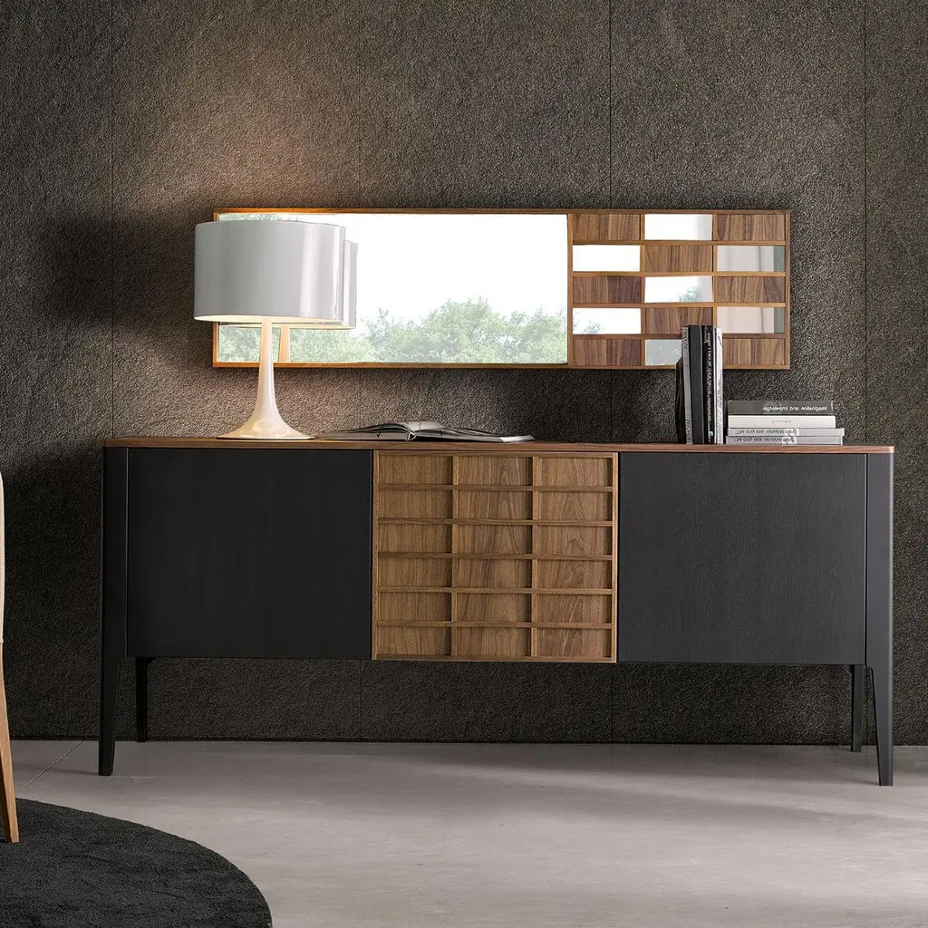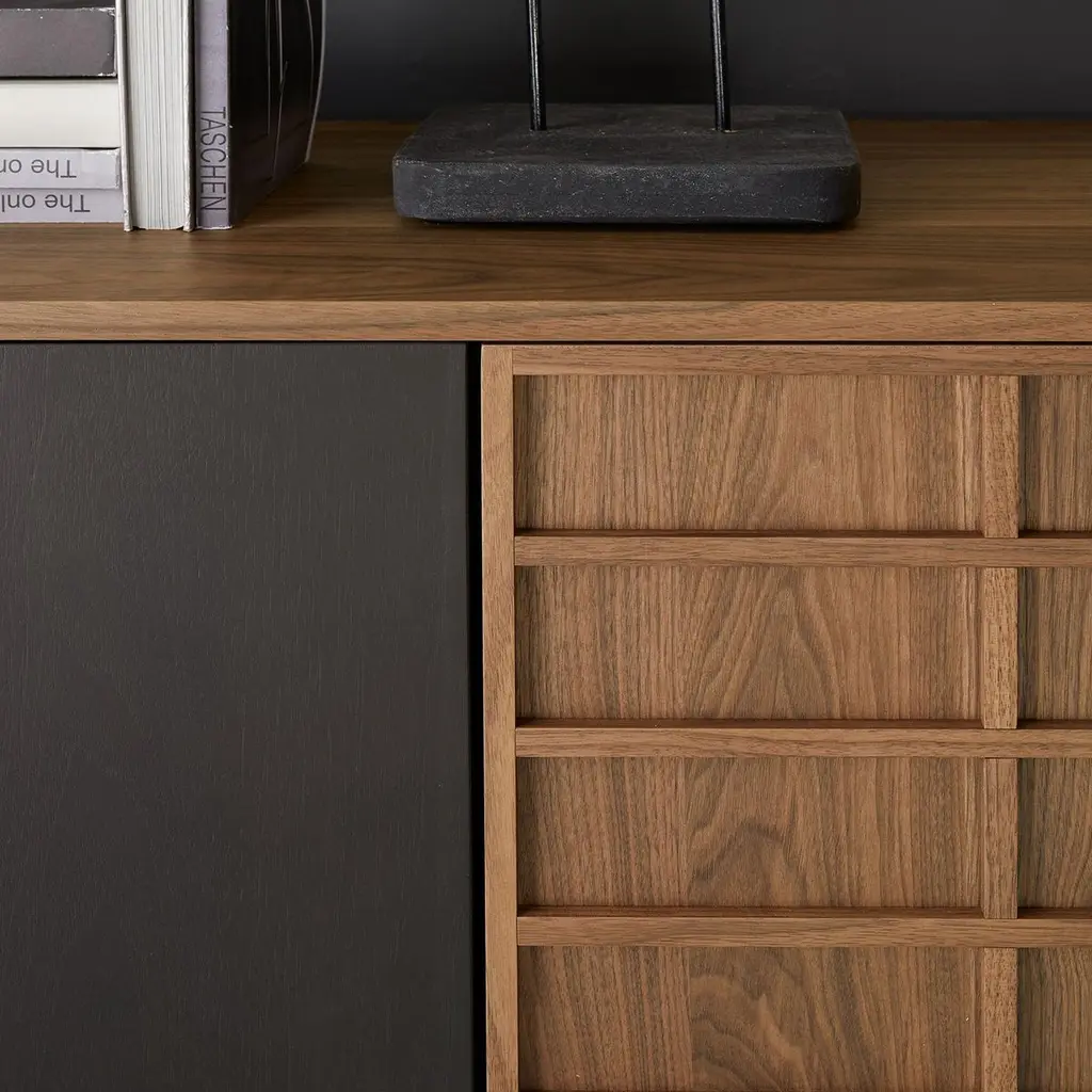 This sideboard features 3 wooden doors in an anthracite finish with 3 glass shelves. The opening has integrated wooden handles and push-pull mechanism in Havana finish.