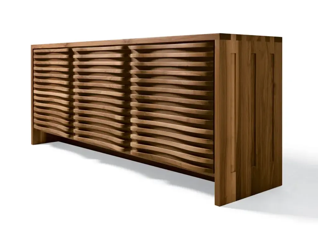 Wood in its most natural state coupled with high accuracy working, together a symbol of Italian excellence. The A-121 sideboard unites these concepts with the characteristic curvature of the Valore doors, heightening form with a hint of eccentric originality.Frame in solid canaletto walnut. Available in three-door version with two internal compartments and glass shelves. Doors in solid walnut and Wenge.• Door: VALORE• Colour: Natural walnut• Finish: Oil