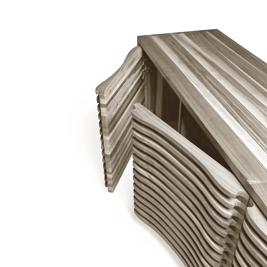 The Sinuo solid wood cabinet is the contemporary reinterpretation of a classic. A prestigious design piece, born from the experience and passion of our craftsmen. Its three-dimensional front creates a refined contrast between lights and shadows and makes the sideboard appear different depending on the perspective.