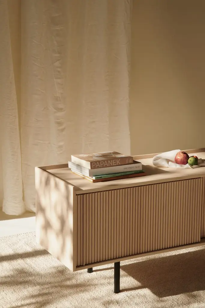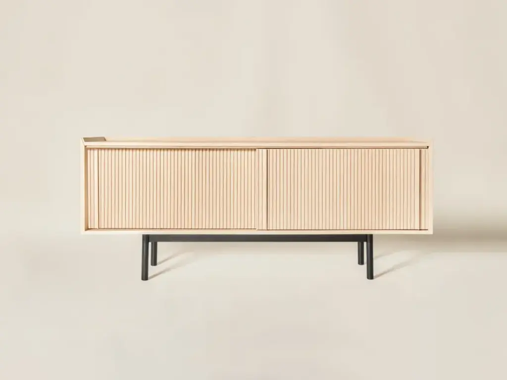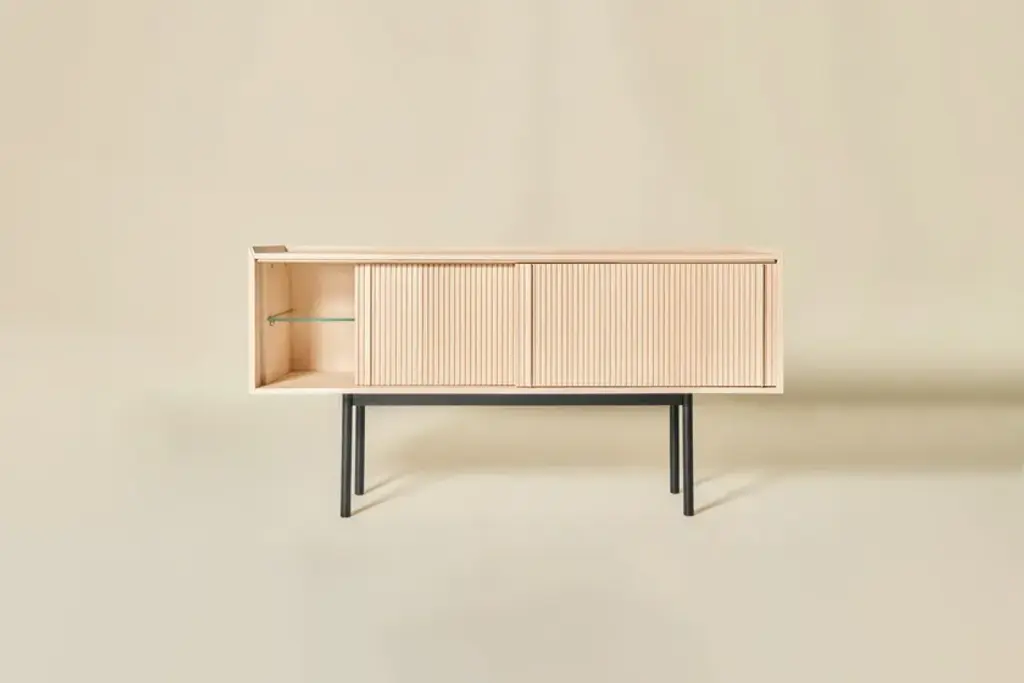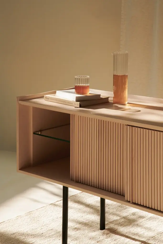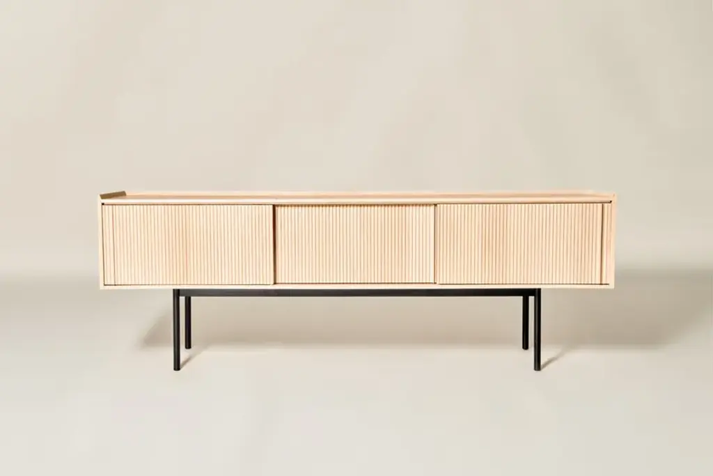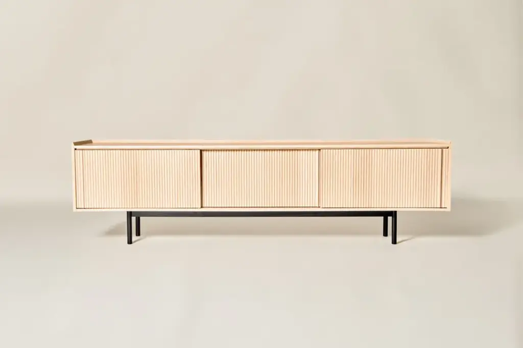 Sipario stands out for its smart, contemporary design which reveals different details depending on the point of view. The vertical pattern of the staggered layers generates a rhythm of shadows. With the 2023 collection we introduce contemporary furniture in line with the current interior trends. Our artisan knowledge meets the point of view of the young designers from Cono Studio to originate a novel language in our production. The Sipario sideboard creates a frame where the staggered layers and their vertical pattern produce a fascinating rhythm of shadows. As a result, the essence of solid ash wood reveals different details depending on the point of view. The top is a deliberate invitation to give space to your everyday objects and fully enjoy the environment. The sideboard is available with two or three side-opening doors, and with high or low legs. FRAME: Made through traditional solid white ash woodworking technique. DOORS: Corrugated white ash. INTERIOR AND SHELVES: Ash interior complete with wooden or glass shelves. DETAILS: Blum® hinges - Soft close sliding doors. LEGS: Metal with black matte finish. Material: White Ash solid woodFinishing: Natural, acrylic finish - Brown, acrylic finish - Black, acrylic finish Variants: 2 or 3 doors Maintenance: For cleaning, we recommend a soft cloth moistened with water. Avoid aggressive alcohol-based detergents.Dale is constantly looking for new perspective and inspirations. In collaboration with the designers from Cono Studio, we have produced a collection of contemporary furniture in solid white ash wood. A new language for Dale Italia, with an essential and current aesthetic, capable to create warm, intimate and welcoming ambientes that feel like home. Discover the new range of white ash solid wood furniture with a contemporary design. Essential lines, contrasts and rhythms create stylish and exclusive elements. Monolithic and geometrical shapes create balances between solids and voids. In an warm, oneiric vision of space, rhythms of surfaces and shadows enhance each detail. A set complete of chair, table, coffee table, sideboard, and mirror, where space and matter become balance and shadow enhances each detail. Introducing Ash Wood For the first time, Dale Italia introduce a new variety of solid wood. White ash, available in the finishes: black, brown, and natural. Essential yet impactful. Contemporary yet warm. A semi-hard, light and durable wood, which adds brightness to the interior with an ultra-modern touch.Embracing a new language Dale Italia’s new collection embraces a contemporary language that expresses our values of quality craftsmanship and Made in Italy excellence. The solid ash wood furniture stands out for its monolithic, essential and geometric shapes. Whilst the rhythm of the surfaces creates a seductive play of shadows. Ours is an oneiric vision of space, to create an intimate, natural and warm ambient that feels like home.Dialoguing with Cono Studio The collection comes from the synergic dialogue between Dale Italia and the designer studio Cono Studio. Another first for us, purposed to involve our clients in an exclusive experience of contemporary furniture. As a result, each element expresses its own unique identity, but always in armory with the full collection.