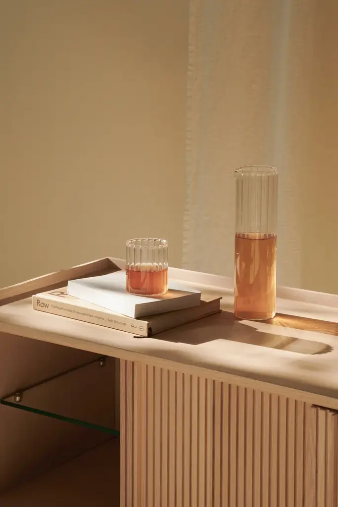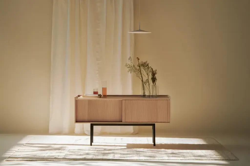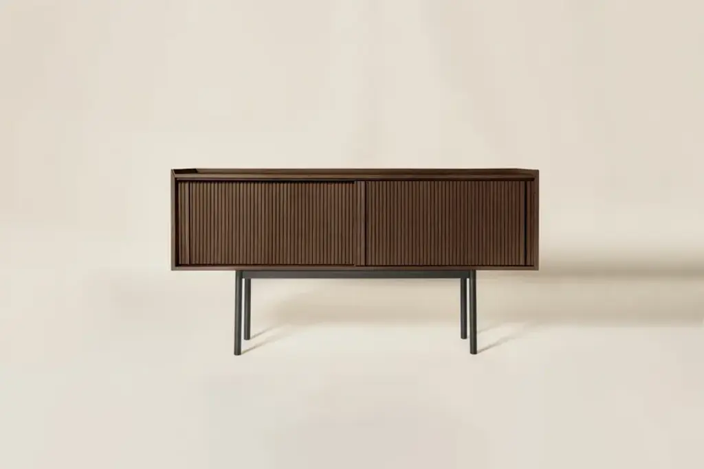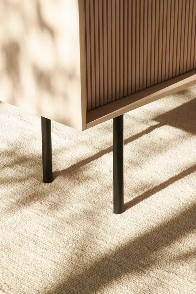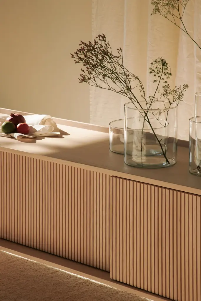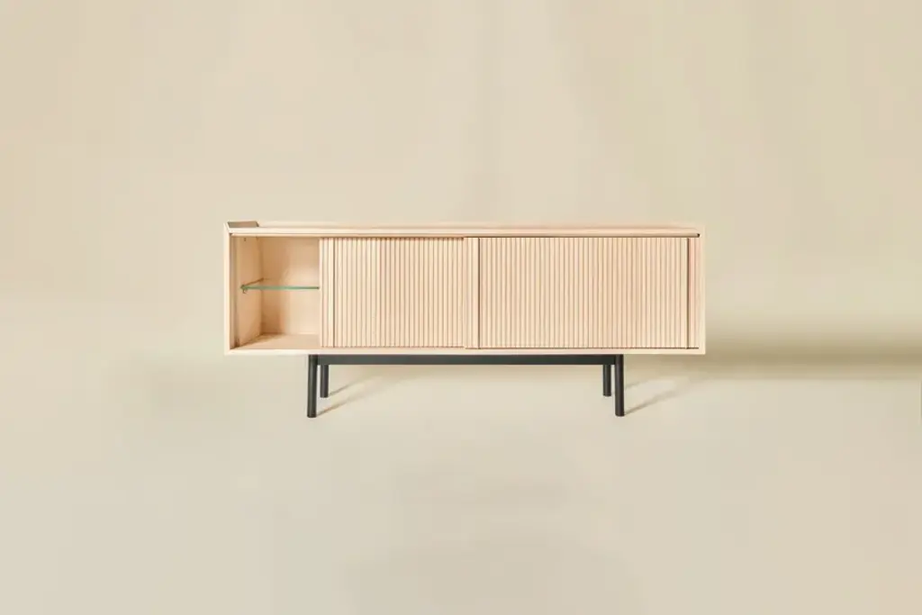 Sipario stands out for its smart, contemporary design which reveals different details depending on the point of view. The vertical pattern of the staggered layers generates a rhythm of shadows. With the 2023 collection we introduce contemporary furniture in line with the current interior trends. Our artisan knowledge meets the point of view of the young designers from Cono Studio to originate a novel language in our production. The Sipario sideboard creates a frame where the staggered layers and their vertical pattern produce a fascinating rhythm of shadows. As a result, the essence of solid ash wood reveals different details depending on the point of view. The top is a deliberate invitation to give space to your everyday objects and fully enjoy the environment. The sideboard is available with two or three side-opening doors, and with high or low legs. FRAME: Made through traditional solid white ash woodworking technique. DOORS: Corrugated white ash. INTERIOR AND SHELVES: Ash interior complete with wooden or glass shelves. DETAILS: Blum® hinges - Soft close sliding doors. LEGS: Metal with black matte finish. Material: White Ash solid woodFinishing: Natural, acrylic finish - Brown, acrylic finish - Black, acrylic finish Variants: 2 or 3 doors Maintenance: For cleaning, we recommend a soft cloth moistened with water. Avoid aggressive alcohol-based detergents.Dale is constantly looking for new perspective and inspirations. In collaboration with the designers from Cono Studio, we have produced a collection of contemporary furniture in solid white ash wood. A new language for Dale Italia, with an essential and current aesthetic, capable to create warm, intimate and welcoming ambientes that feel like home. Discover the new range of white ash solid wood furniture with a contemporary design. Essential lines, contrasts and rhythms create stylish and exclusive elements. Monolithic and geometrical shapes create balances between solids and voids. In an warm, oneiric vision of space, rhythms of surfaces and shadows enhance each detail. A set complete of chair, table, coffee table, sideboard, and mirror, where space and matter become balance and shadow enhances each detail. Introducing Ash Wood For the first time, Dale Italia introduce a new variety of solid wood. White ash, available in the finishes: black, brown, and natural. Essential yet impactful. Contemporary yet warm. A semi-hard, light and durable wood, which adds brightness to the interior with an ultra-modern touch.Embracing a new language Dale Italia’s new collection embraces a contemporary language that expresses our values of quality craftsmanship and Made in Italy excellence. The solid ash wood furniture stands out for its monolithic, essential and geometric shapes. Whilst the rhythm of the surfaces creates a seductive play of shadows. Ours is an oneiric vision of space, to create an intimate, natural and warm ambient that feels like home.Dialoguing with Cono Studio The collection comes from the synergic dialogue between Dale Italia and the designer studio Cono Studio. Another first for us, purposed to involve our clients in an exclusive experience of contemporary furniture. As a result, each element expresses its own unique identity, but always in armory with the full collection.
