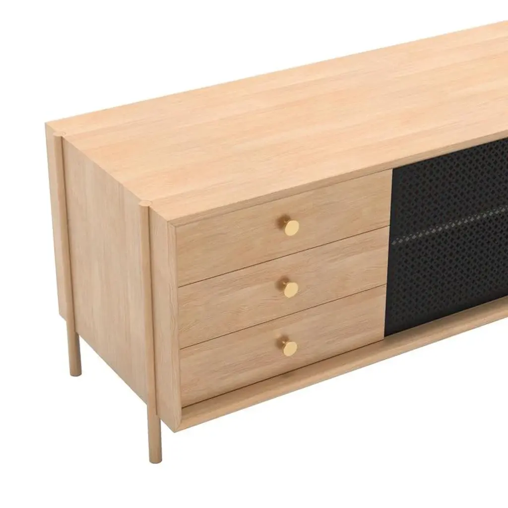 Slate grey metal gabin sideboard 162 cm with drawers natural oak by harto dimensions: w 162 x d 45 x h 49 cm. Materials: solid wood, wood veneered mdf, painted metal. Weight: 52.0 kg the 162cm gabin sideboard with drawers holds a secret: there are not 3 drawers as its harmonious front suggests, but 2 drawers, one of which is deeper and very practical for storing your vases or files. On the sliding door side, the shelves are height-adjustable and the cable ports allow it to be transformed into a tv bench. The 162 cm