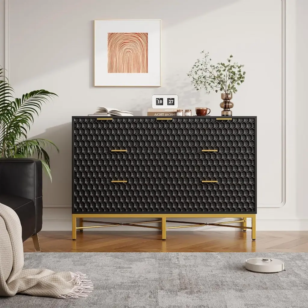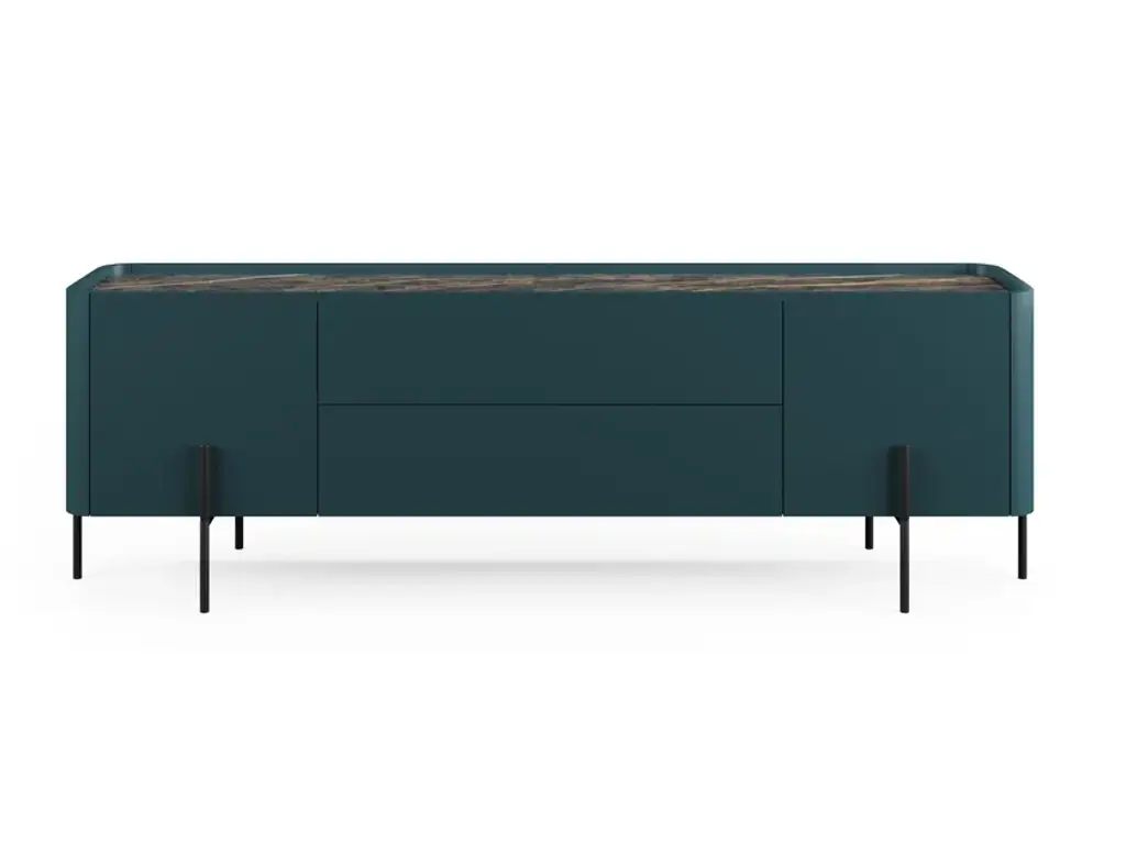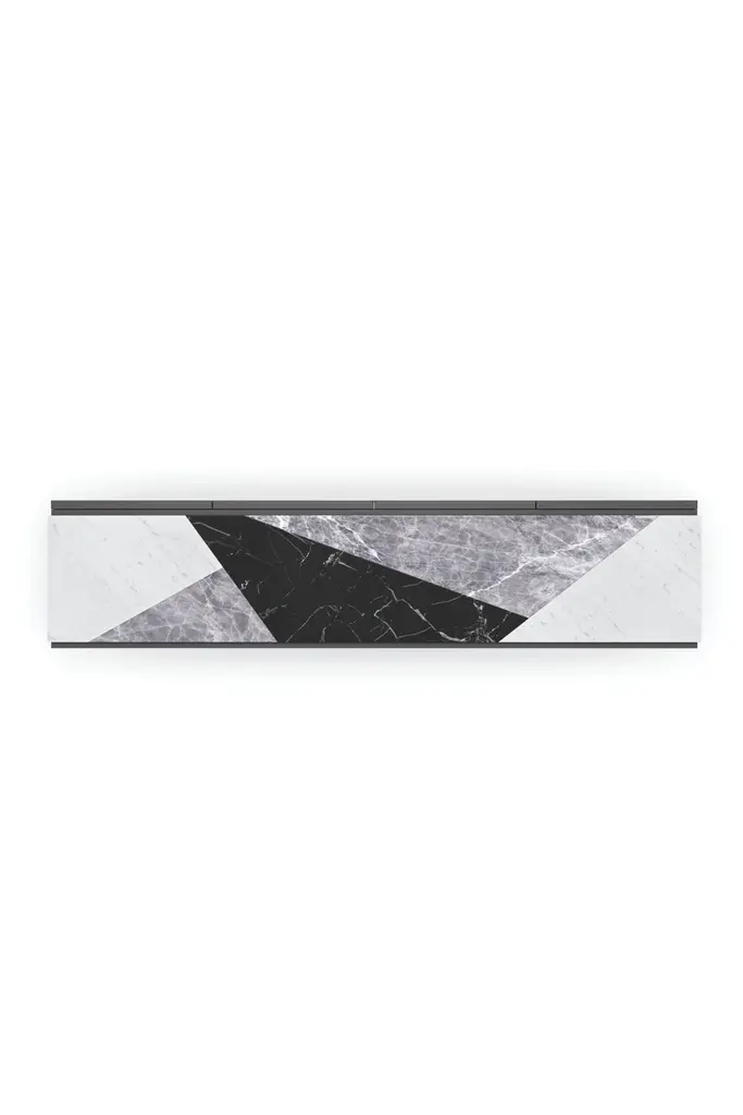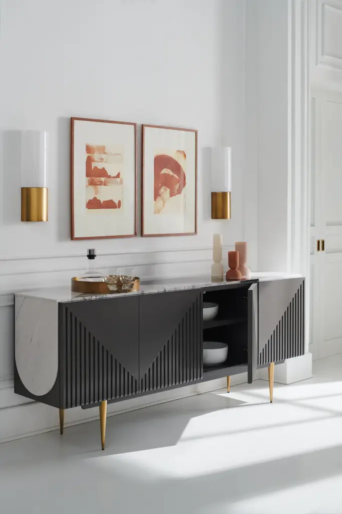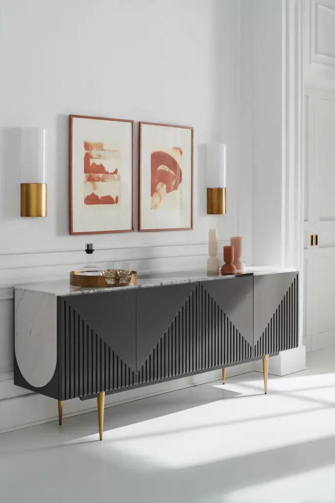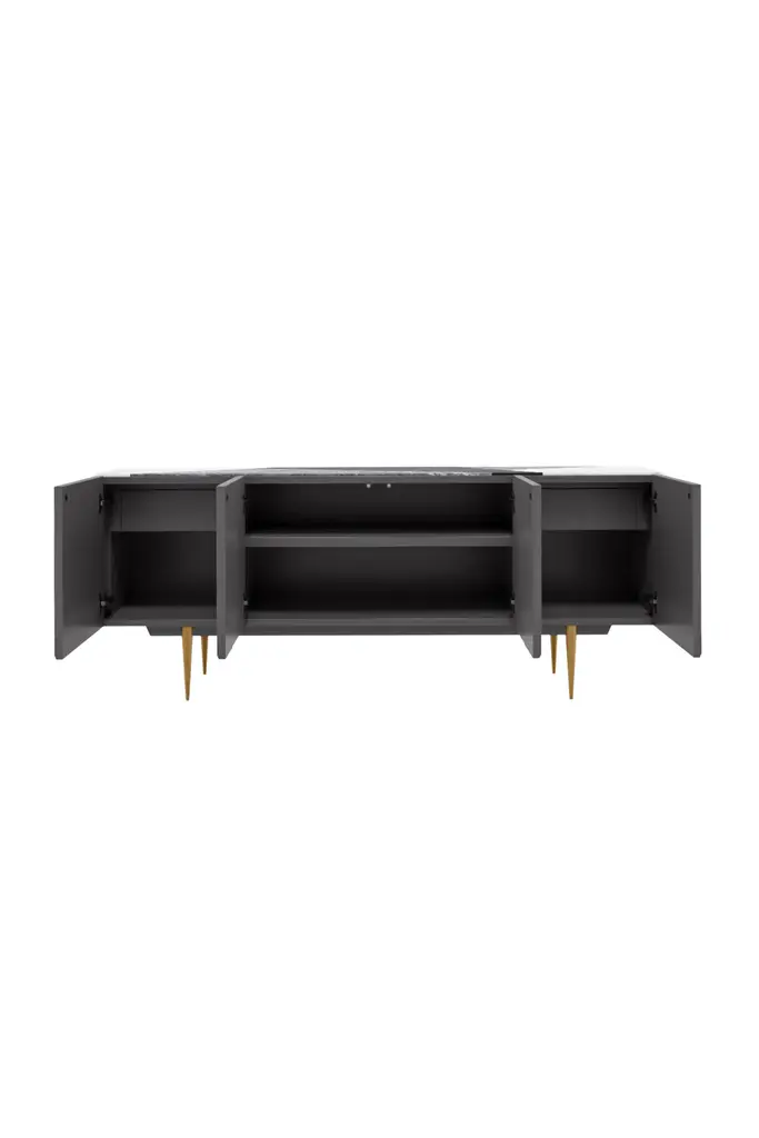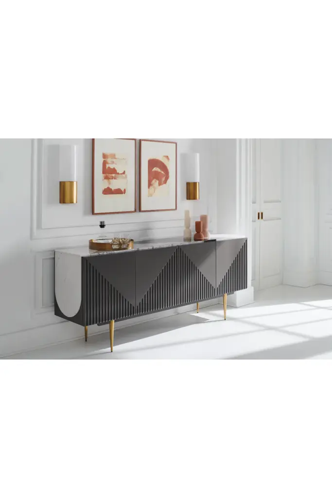 Bring a modern form to traditional dining with our Over the Edge buffet, finished in Warm Slate and a mix of polished marble and stone. Graphic slat details add dimension to this contemporary design, balanced on tapered metal legs in Champagne Gold. Perfect for happy hours and hosting, it offers generous storage with two drawers, adjustable shelves and open space, neatly concealed by touch-latch doors. Or, style as a statement-making console in living rooms, halls, and entryways.