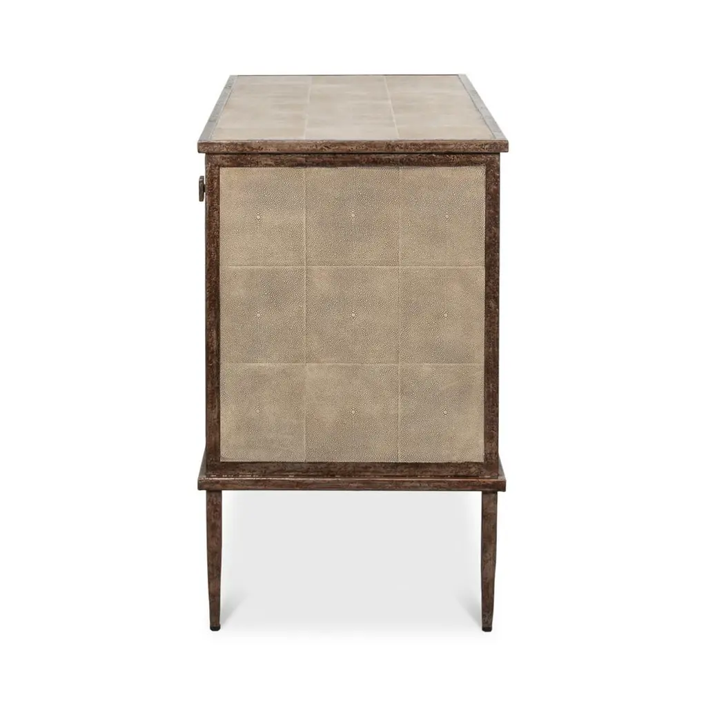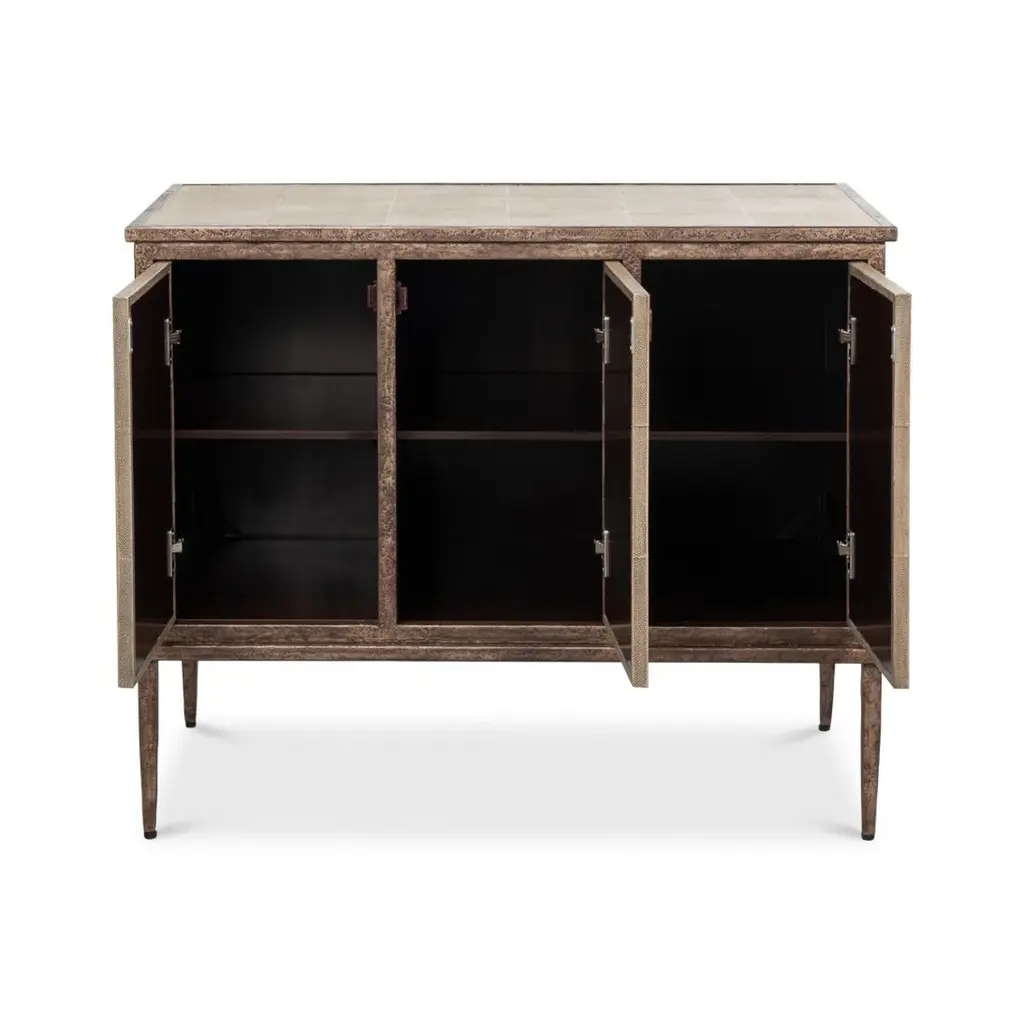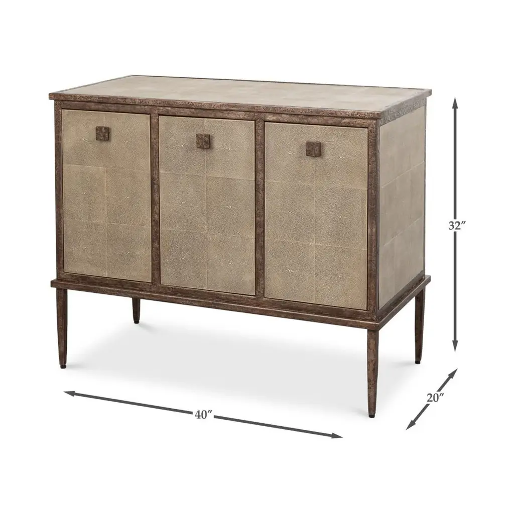 Blends modern design with luxurious craftsmanship, creating a standout piece for any sophisticated space. Wrapped in shagreen-embossed leather in a rich charcoal grey, it introduces refined texture and sleek elegance to your decor. The frame and accents, crafted from antique brass frosted metal, provide a subtle metallic contrast that enhances its contemporary allure.Designed for both style and functionality, this sideboard features three hinged doors that open to reveal ample storage for dinnerware, linens, or everyday essentials. Dimensions: 40" W x 20" D x 32" H