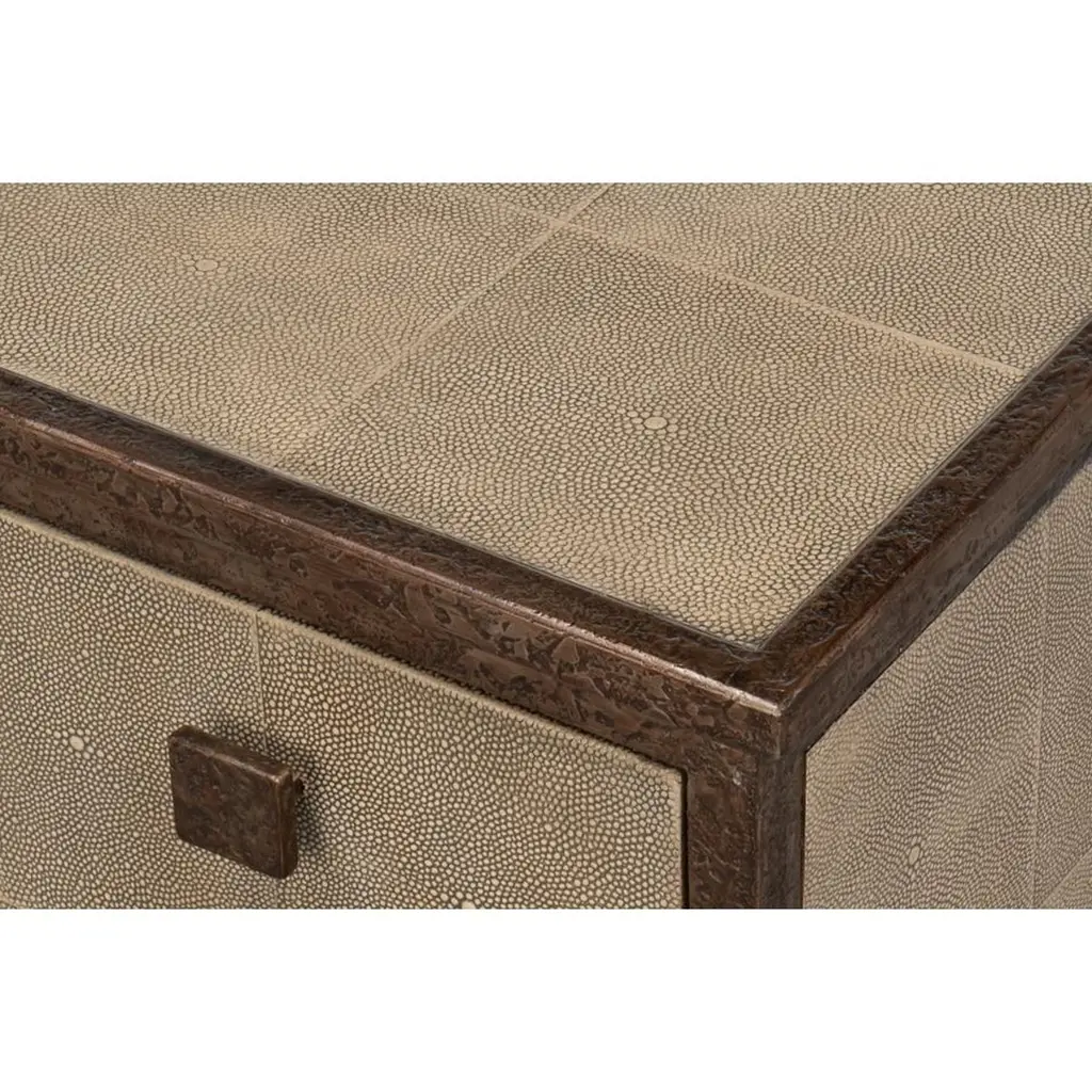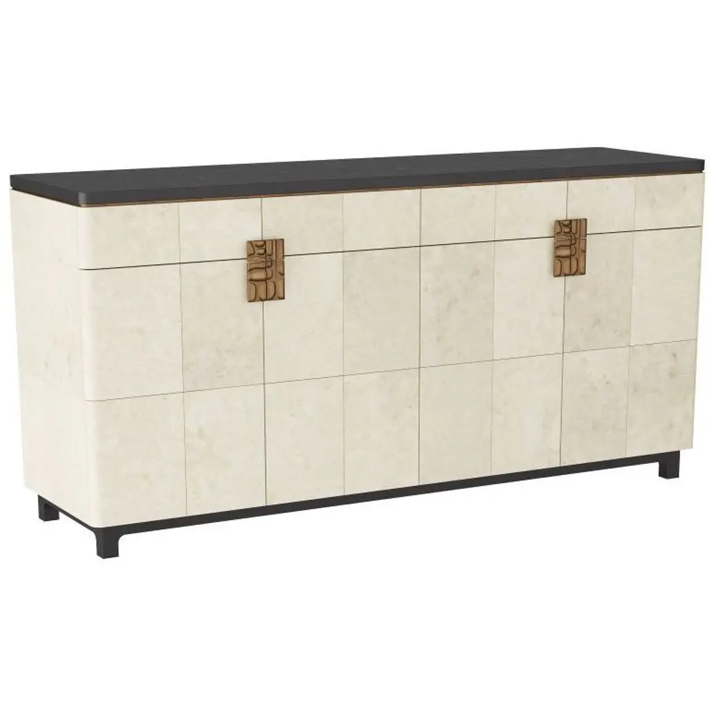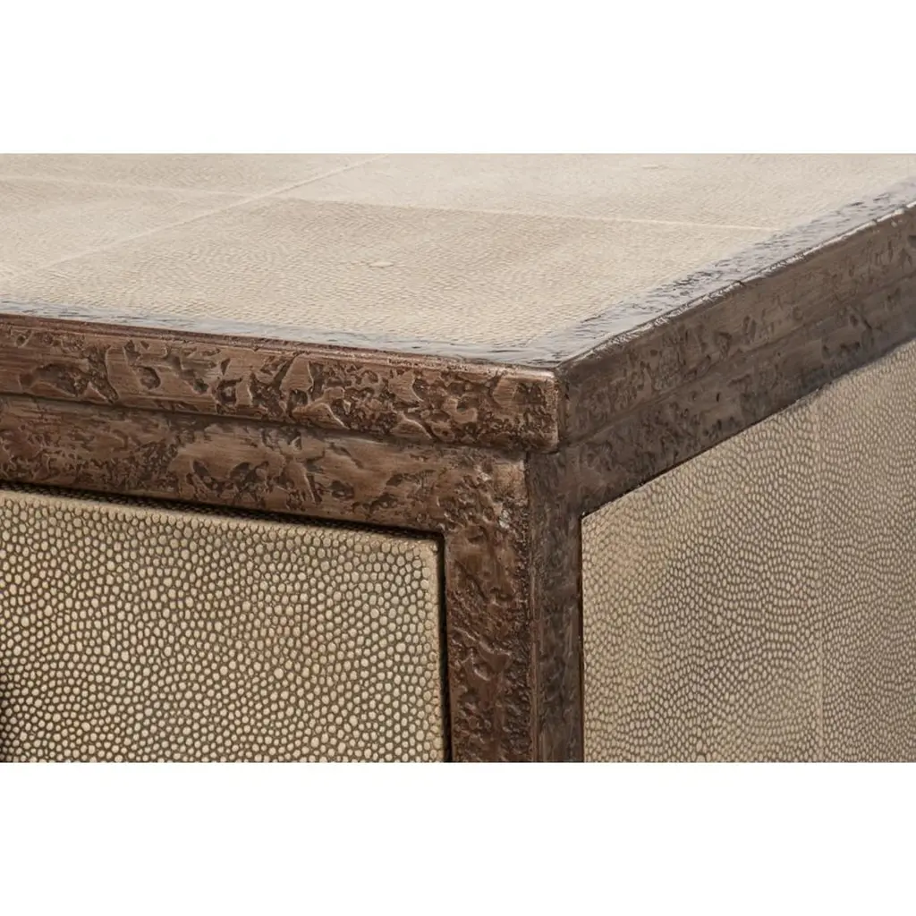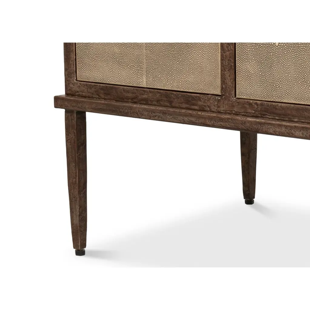 Blends modern design with luxurious craftsmanship, creating a standout piece for any sophisticated space. Wrapped in shagreen-embossed leather in a rich charcoal grey, it introduces refined texture and sleek elegance to your decor. The frame and accents, crafted from antique brass frosted metal, provide a subtle metallic contrast that enhances its contemporary allure.Designed for both style and functionality, this sideboard features three hinged doors that open to reveal ample storage for dinnerware, linens, or everyday essentials. Dimensions: 40" W x 20" D x 32" H