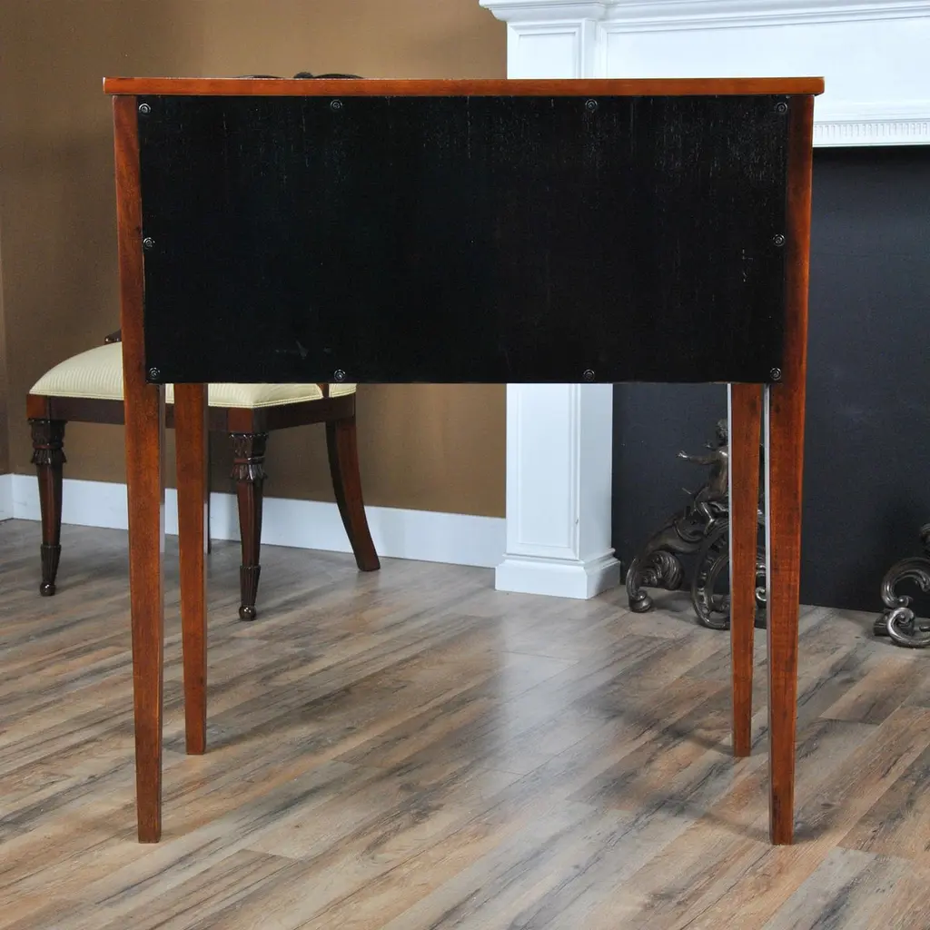 An ideal sideboard for use in smaller spaces in the dining room this version of the Small Federal Mahogany Sideboard is also designed to work with almost any decor. Ideal in a dining room the piece is also suited for use in a living room or hallway. Simple lines and sophisticated banding around the drawers give it a fresh, clean appearance that will never go out of style.Measures 34″w x 16″d x 38″h