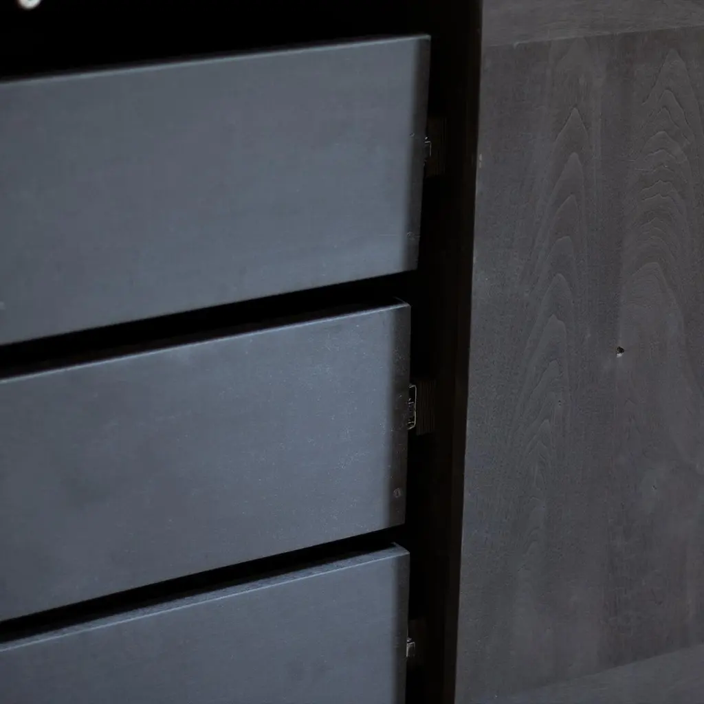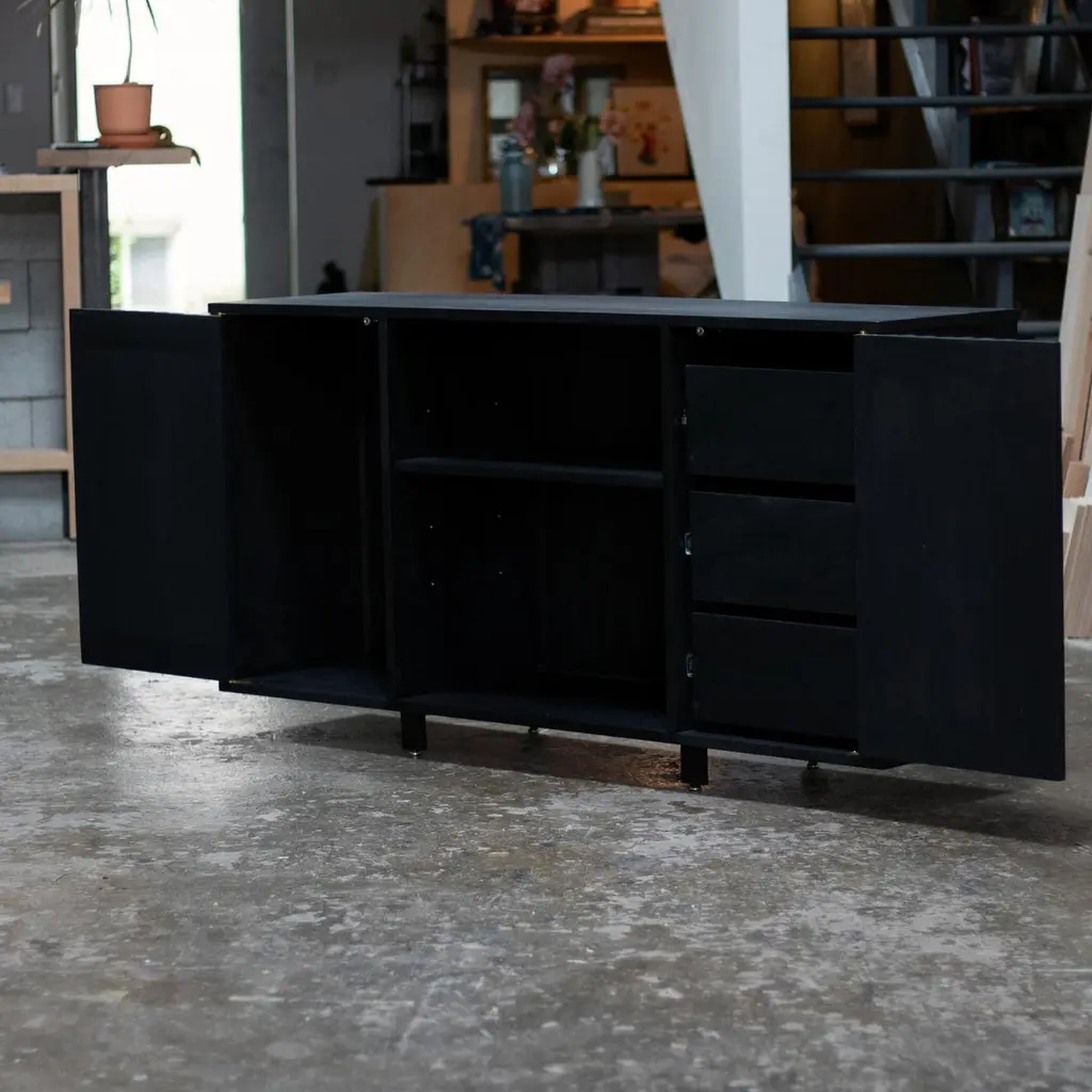 This cabinet is constructed of solid black walnut wood. The finish is India ink which provides a deep black colour while retaining the quality of the wood grain. Interior is customizable - shown here with three drawers.