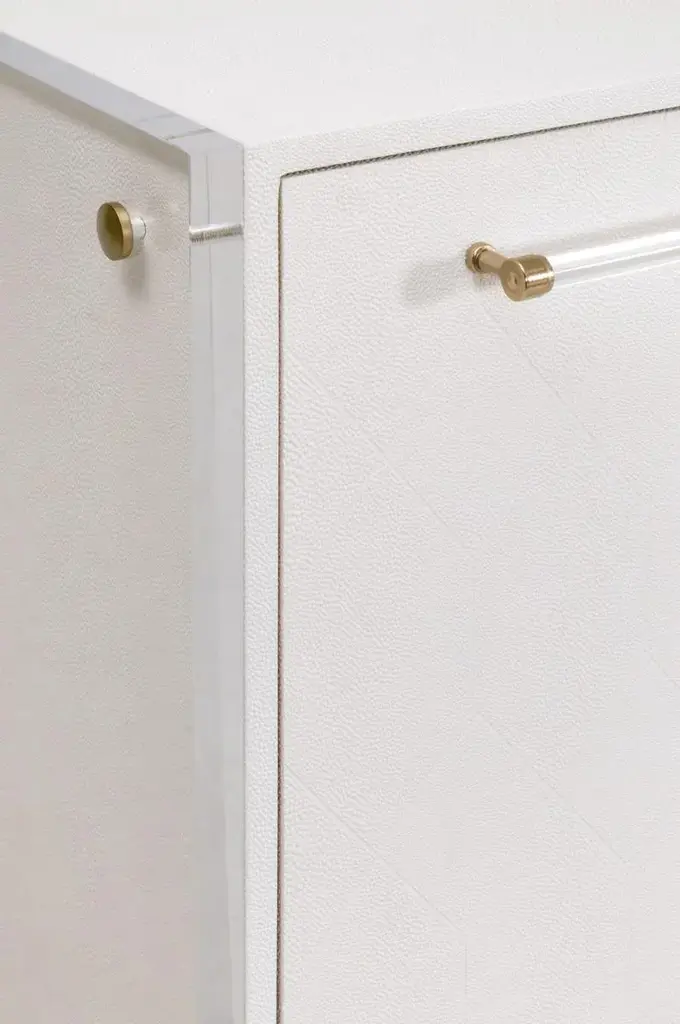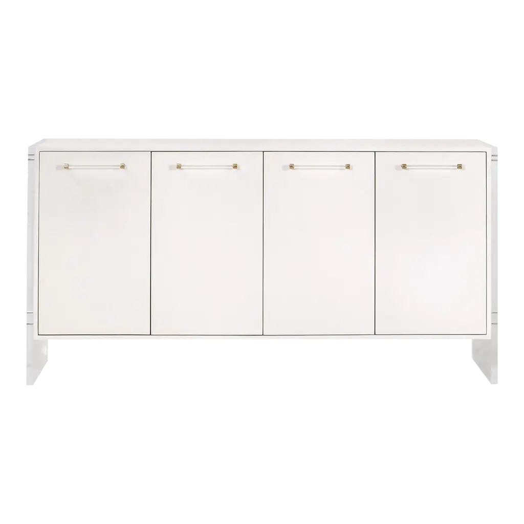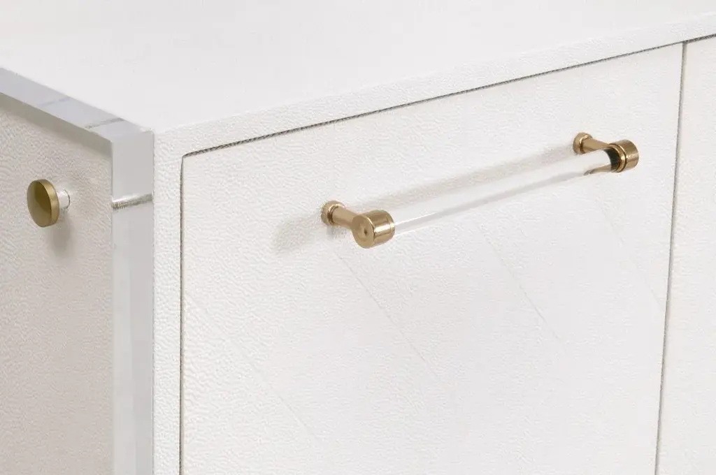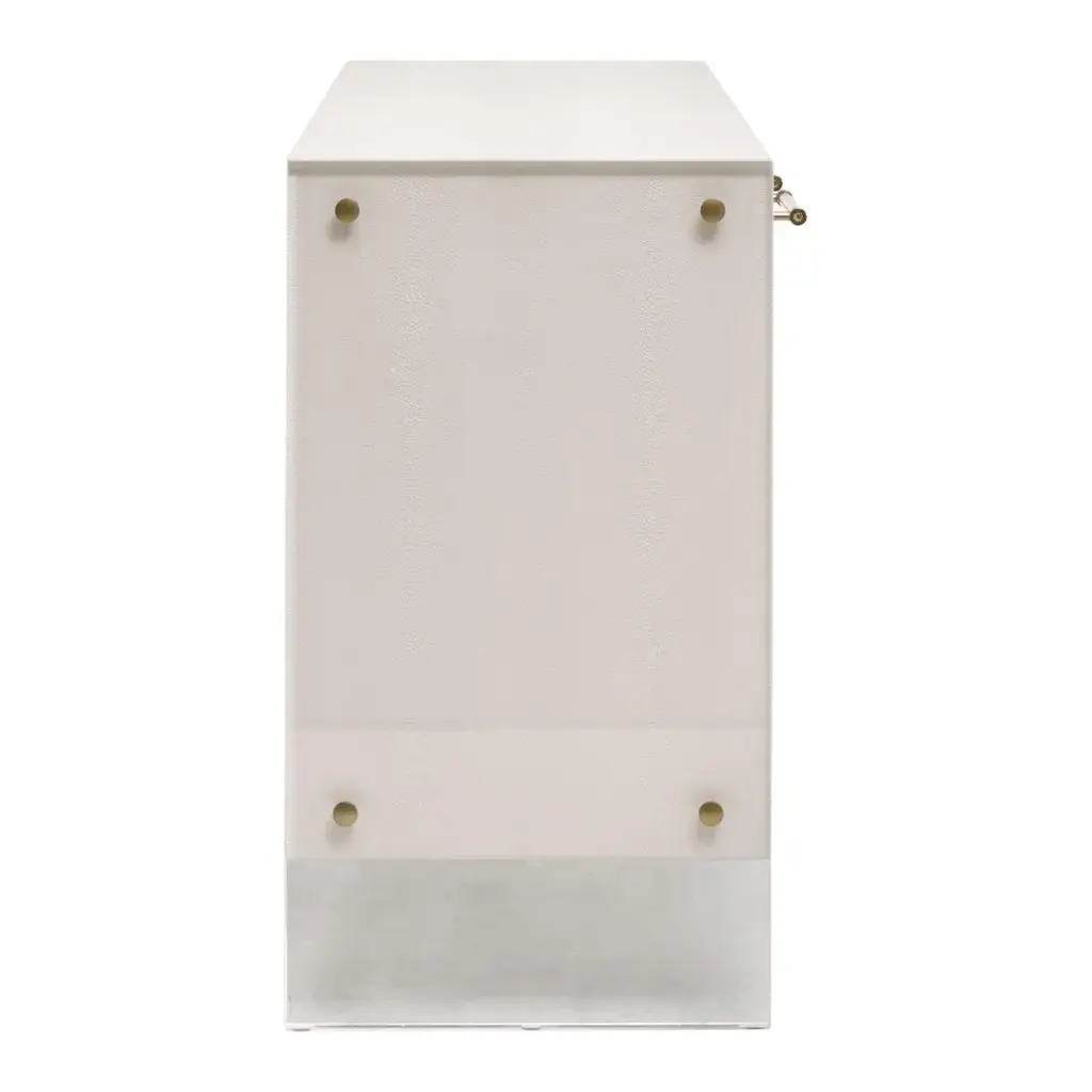 Sonia Shagreen Media Sideboard The Sonia Shagreen Media Sideboard by Essentials for Living will be a remarkable and unique piece within your home. This sideboard is fit for a light and airy aesthetic. The frame and front door cabinets are made with a pearl white faux shagreen finish. The faux shagreen is made of resin and resembles real stingray skin and contains seams and natural-looking characteristics. The front door cabinets feature a subtle geometric design as well. It is paired with clear acrylic handles and side panels, adding elements of modern design. The handles and side panels have brushed brass accents for an elegant touch. It measures 67" wide, 19" deep, and 34.5" high for plenty of space. Additionally, you can easily store items or media components inside the sideboard with its removable and adjustable shelves and cord management holes. Complete your living space with this statement-making sideboard, which will work well in many transitional interior settings. Sonia Shagreen Media Sideboard Features: Dimensions: W 67 x D 19 x H 34.5 Weight (lbs): 223 Colors: Pearl Shagreen, Brushed Brass Materials: Faux Shagreen Resin, Solid Rubberwood, Solid Beech, MDF, Acrylic, Metal Faux Shagreen Resin Door Panels & Surround Geometric Patterned Door Fronts Clear Acrylic Panel Legs Dual Cord Management Holes