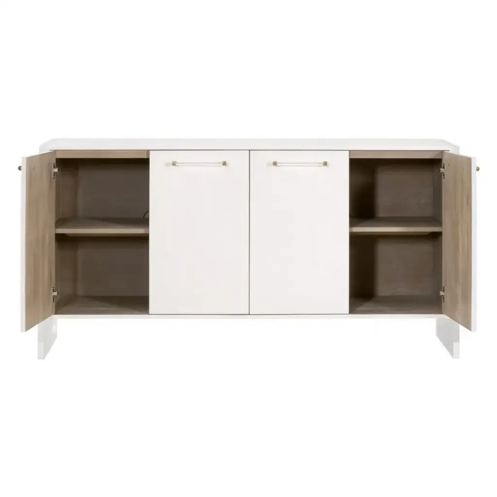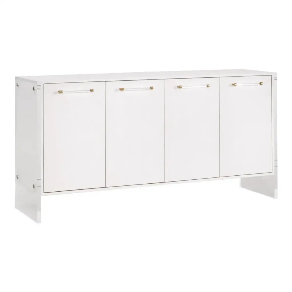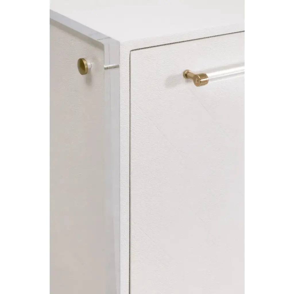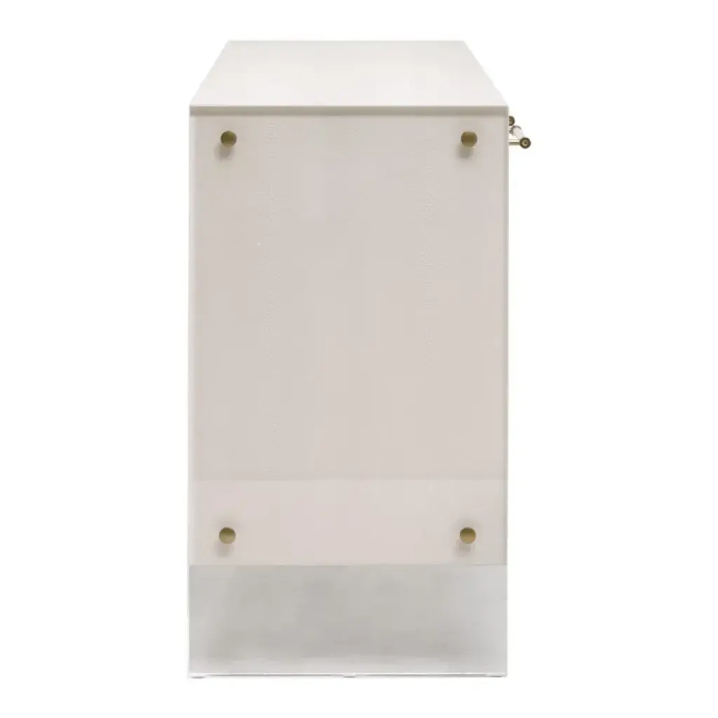 The Sonia Shagreen Media Sideboard by Essentials for Living will be a remarkable and unique piece within your home. This sideboard is fit for a light and airy aesthetic. The frame and front door cabinets are made with a pearl white faux shagreen finish. The faux shagreen is made of resin and resembles real stingray skin and contains seams and natural-looking characteristics. The front door cabinets feature a subtle geometric design as well. It is paired with clear acrylic handles and side panels, adding elements of modern design. The handles and side panels have brushed brass accents for an elegant touch. It measures 67†wide, 19†deep, and 34.5†high for plenty of space. Additionally, you can easily store items or media components inside the sideboard with its removable and adjustable shelves and cord management holes. Complete your living space with this statement-making sideboard, which will work well in many transitional interior settings.