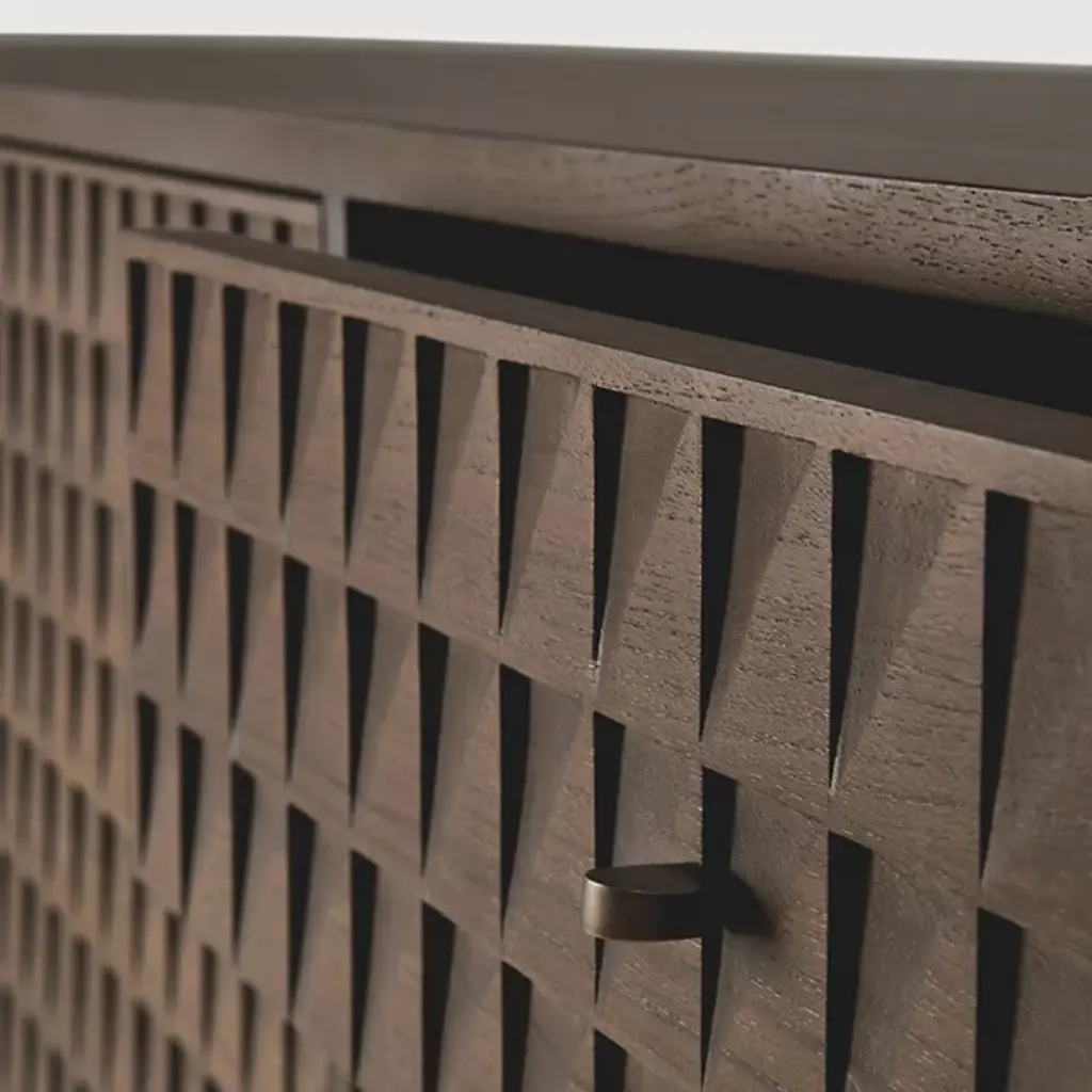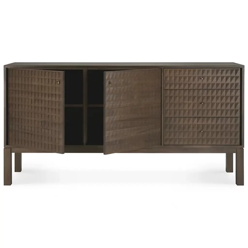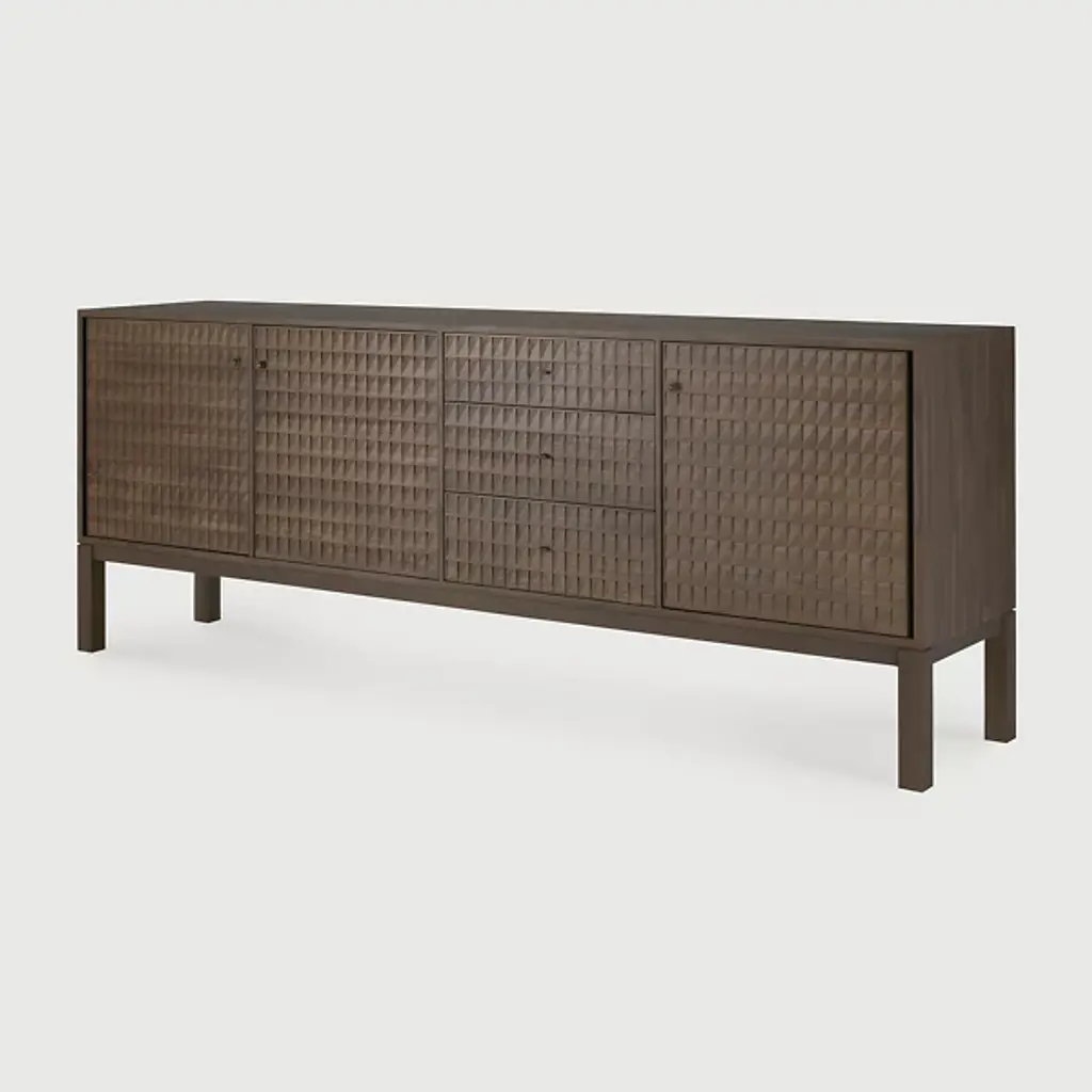 The Sono sideboard from Ethnicraft combines organization with creativity. Its doors and three soft-close drawers offer multiple storage options. Geometric patterns adorn the teak panels, each individually carved. Brass pulls add subtle detail, while internal adjustable shelves adapt to storage needs. FSC-certified teak undergoes careful construction and finishing, yielding furniture built for generations. This piece excels at both form and function - the handwork reflects traditional methods while the design suits modern needs.