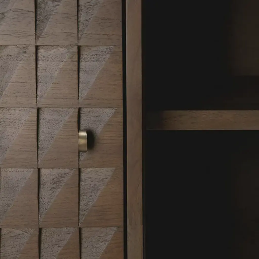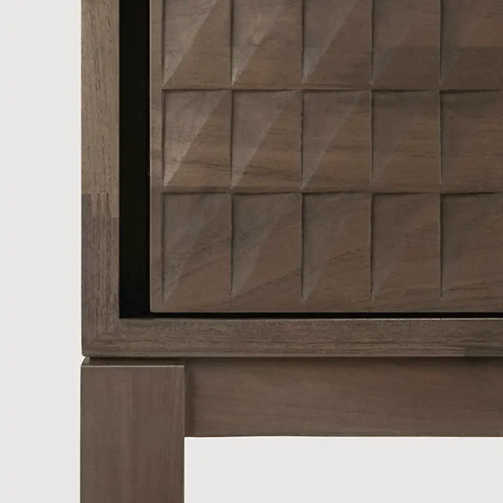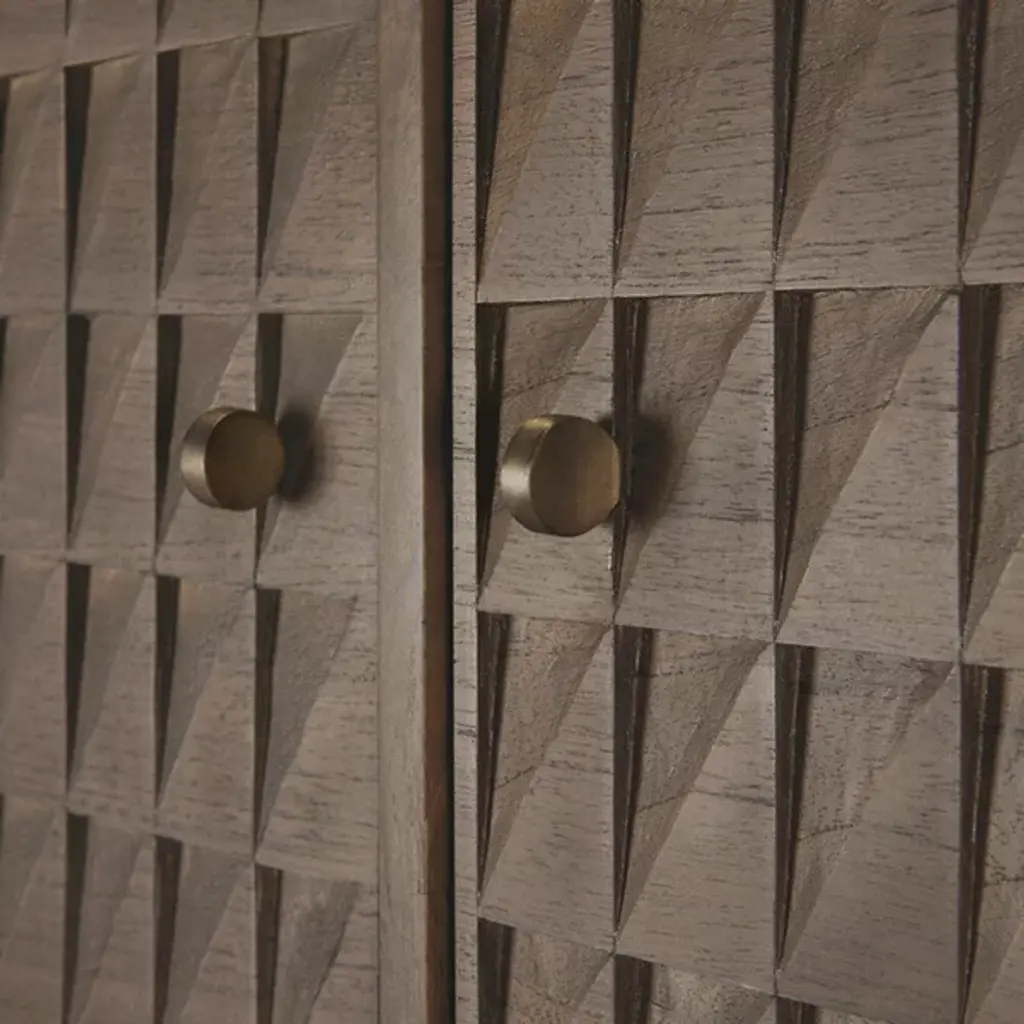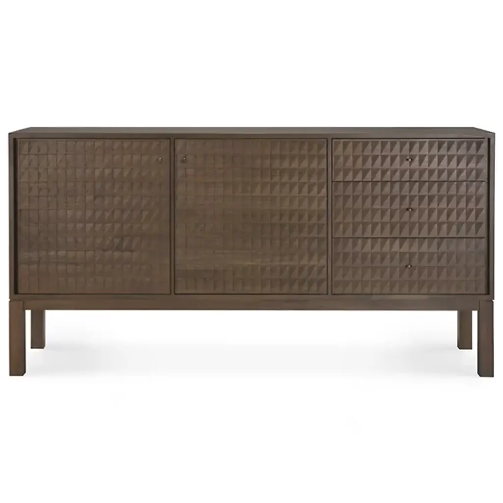 The Sono sideboard from Ethnicraft combines organization with creativity. Its doors and three soft-close drawers offer multiple storage options. Geometric patterns adorn the teak panels, each individually carved. Brass pulls add subtle detail, while internal adjustable shelves adapt to storage needs. FSC-certified teak undergoes careful construction and finishing, yielding furniture built for generations. This piece excels at both form and function - the handwork reflects traditional methods while the design suits modern needs.