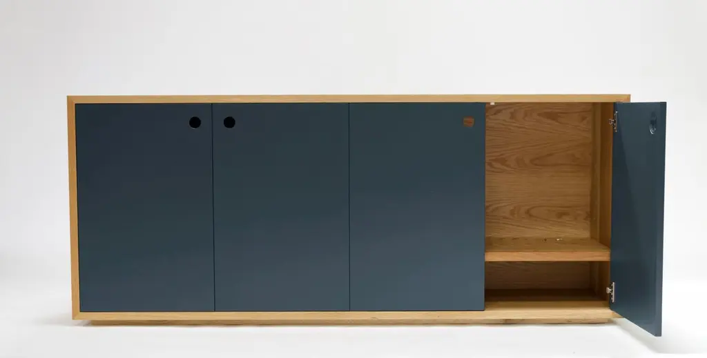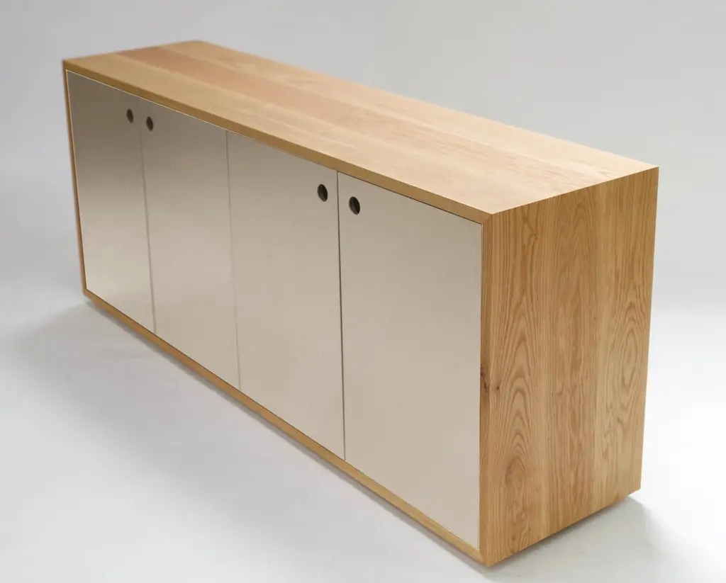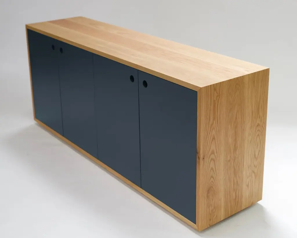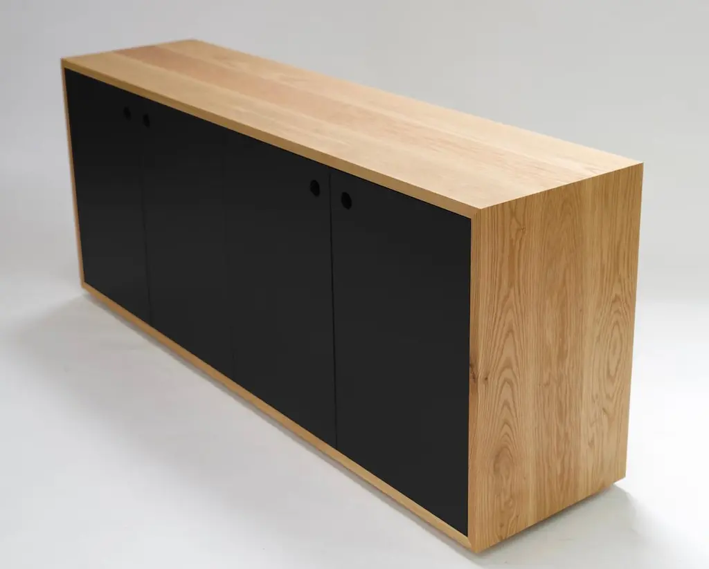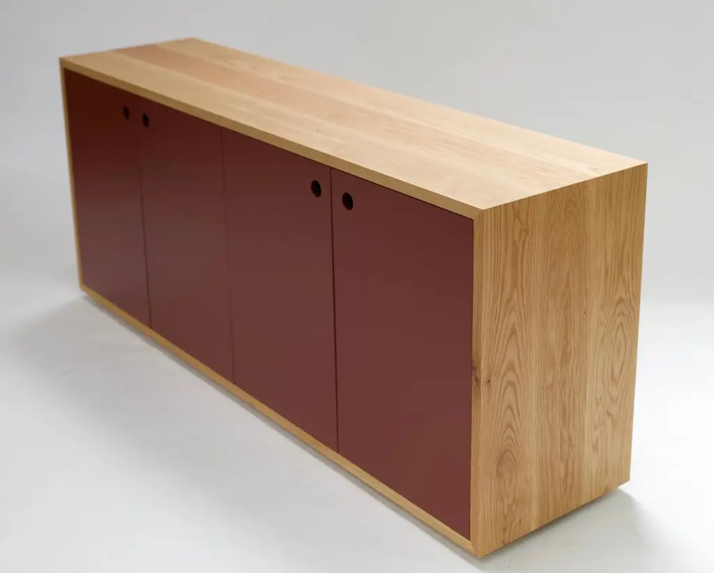 Custom Sonoran Credenza by FDP Collection.The Sonoran Credenza is hand-crafted from solid Oak in an oil-rubbed finish and custom-colored doors. Color door options are Japanese Red, Black, Blanco, Gris, and Prouve Blue. Each credenza features an adjustable interior shelf for storage.The pricing is for the credenza shown crafted in solid Oak, with 1 interior shelf in each bay. Dimensions are 18" D x 30" H x 72" W. The credenza is customizable and is available in different wood species(oak, walnut, or pine), wood finishes, and interior shelving/drawer layouts. Each credenza is intricately hand-crafted from our workshop in Northern California.